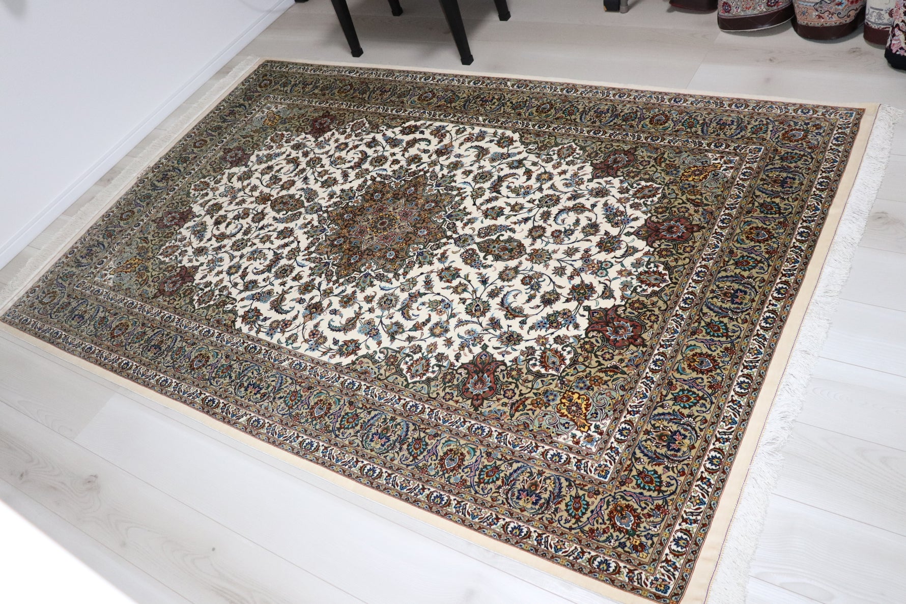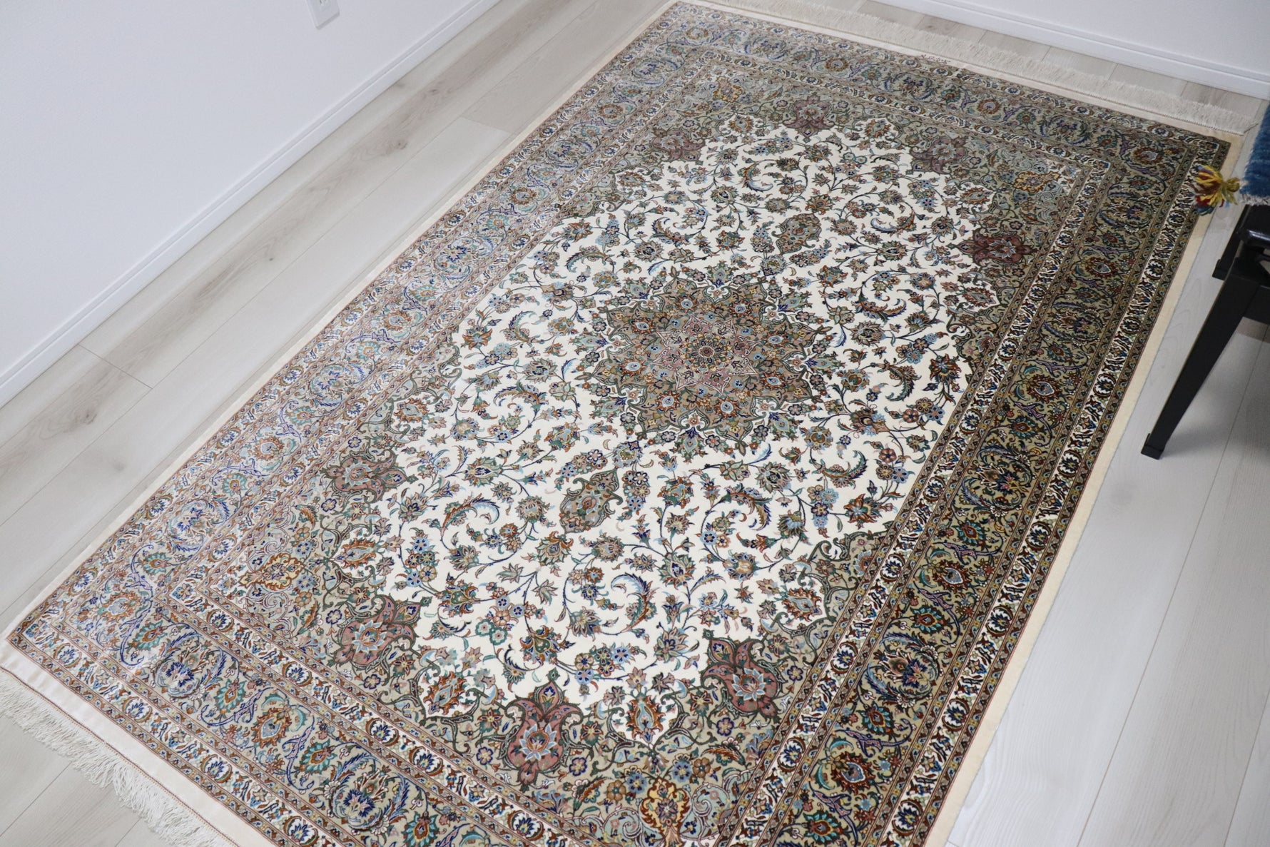 本作品は、アルバル工房が手掛けたシルク100%のペルシャ絨毯で、見事なカーシャン柄が特徴です。クリームを基調としたフィールドカラーが、部屋全体に明るさと広がりをもたらし、落ち着いた雰囲気を演出します。ボーダー部分は、黄土色をベースにした繊細な花模様が丁寧に描かれており、中心のメダリオンデザインと美しく調和しています。