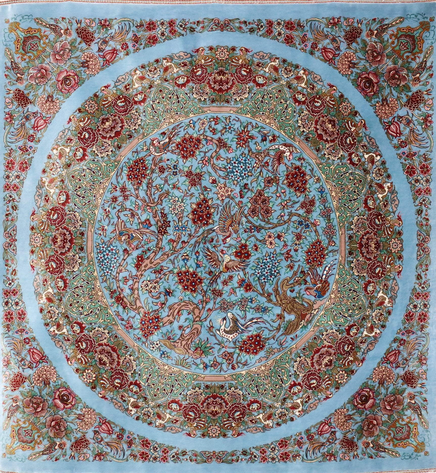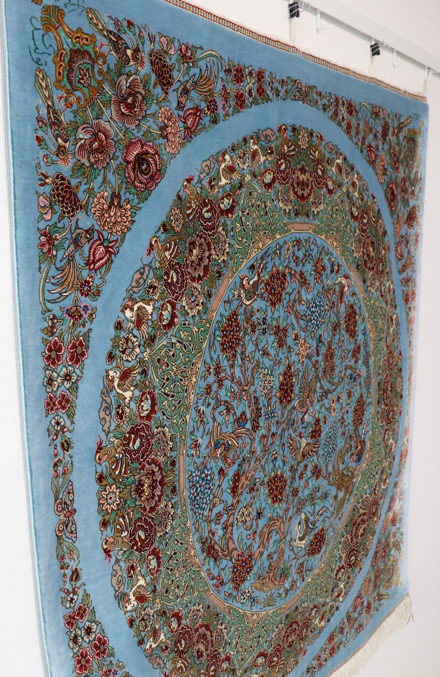 クム産の最高級シルク100%を使用して手織りされた逸品です。珍しい正方形のフォルムが特徴的で、鮮やかなブルーのフィールドカラーが目を引きます。デザインには、生命の樹(Derakhti)とメダリオン文様を見事にミックスした美しい模様が施されています。これにより、自然の力強さと美しさが表現され、空間に穏やかなエネルギーを与えてくれます。