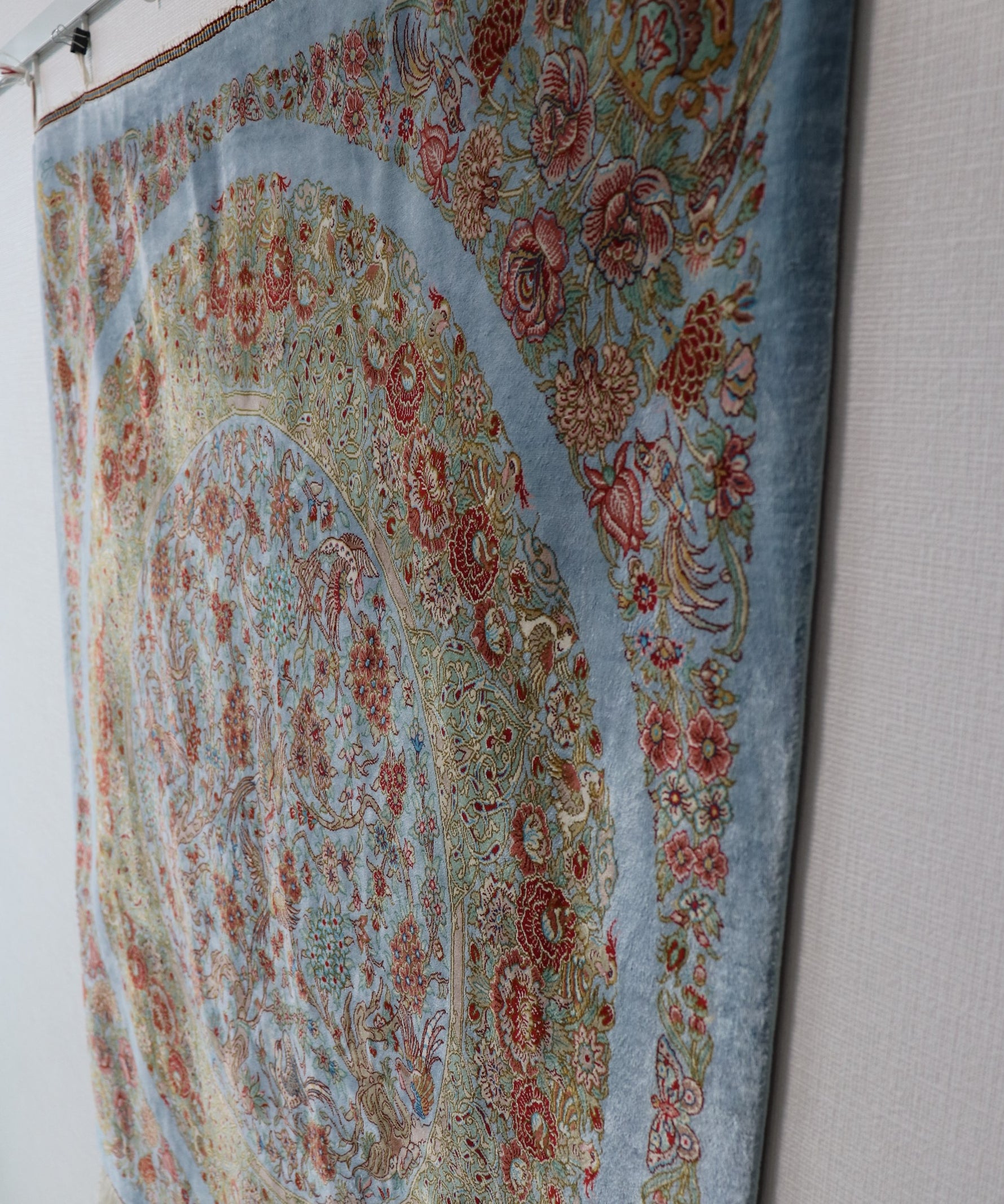 本作品は、ミルメヒディ工房によって14ヶ月の制作期間をかけて丹念に織り上げられ、110万ノット/平方メートルの密度で仕上げられています。精緻な織り込みが、シルクの光沢と手触りに絶妙にマッチし、贅沢なひとときを感じさせます。