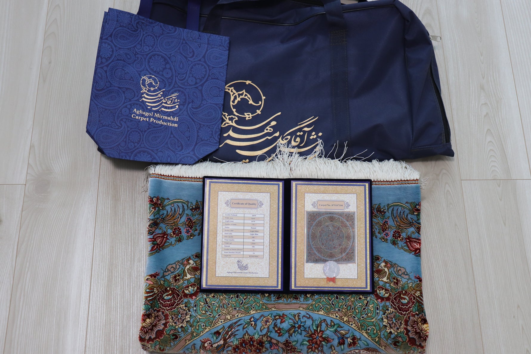 他の絨毯作品を見ればすぐに判りますが、絨毯の絵柄においてミルメヒディ工房は、色鮮やかな花々の文様を絨毯の全体に散りばめるデザインを得意としています。この作品は東洋の伝統的なデザインを巧みに取り入れ、なおかつ自身の得意とするデザインと見事に融合させた逸品であると評価する事が出来るでしょう。