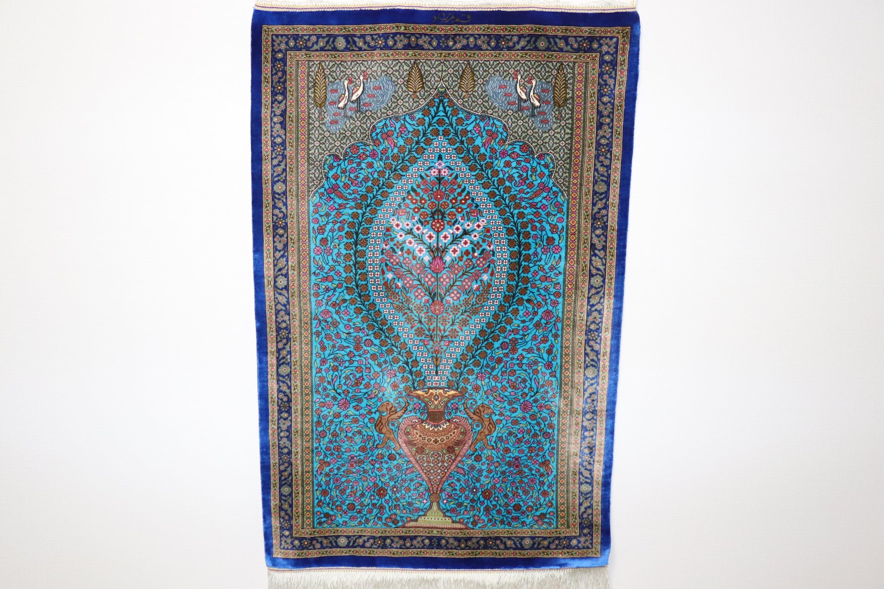 Persian carpet from Qom, 100% silk, Mirmehidi Atelier, the vase pattern and the blue-green color have a beautiful contrast