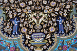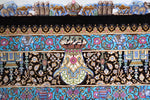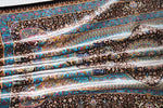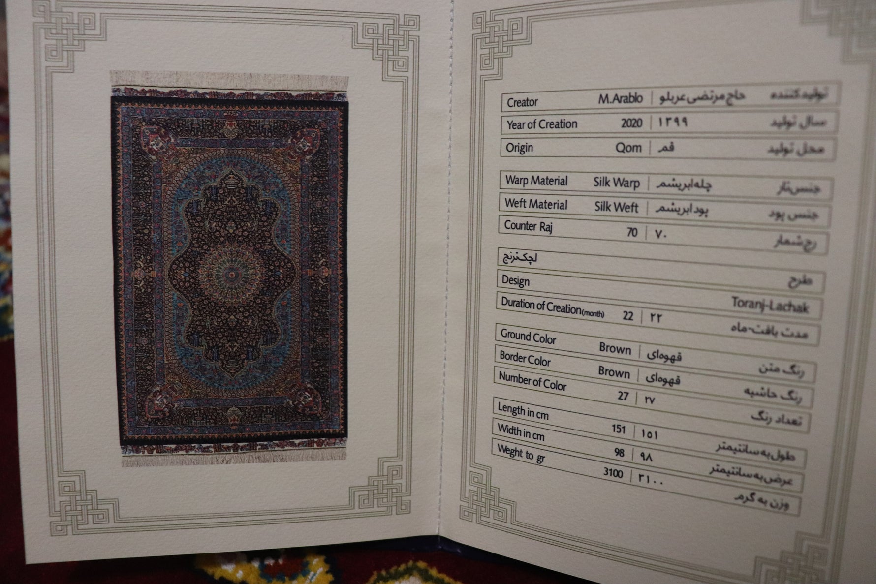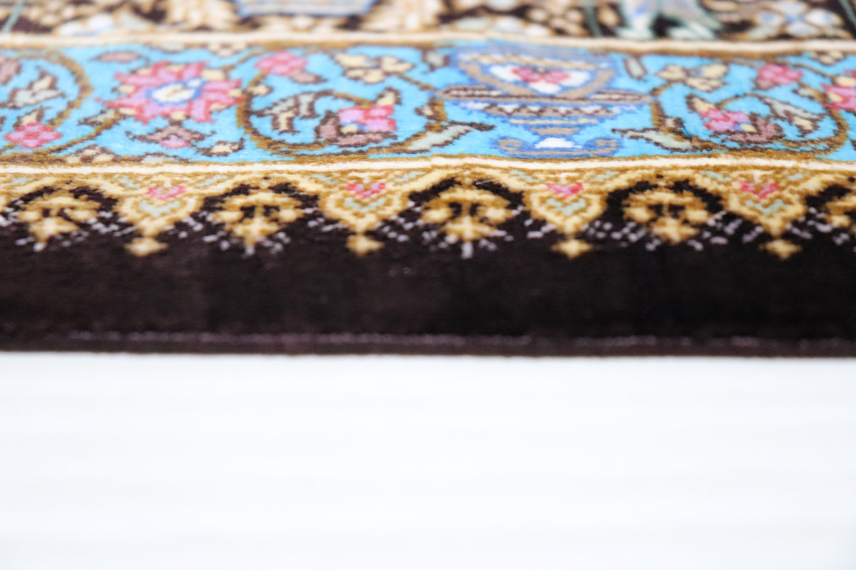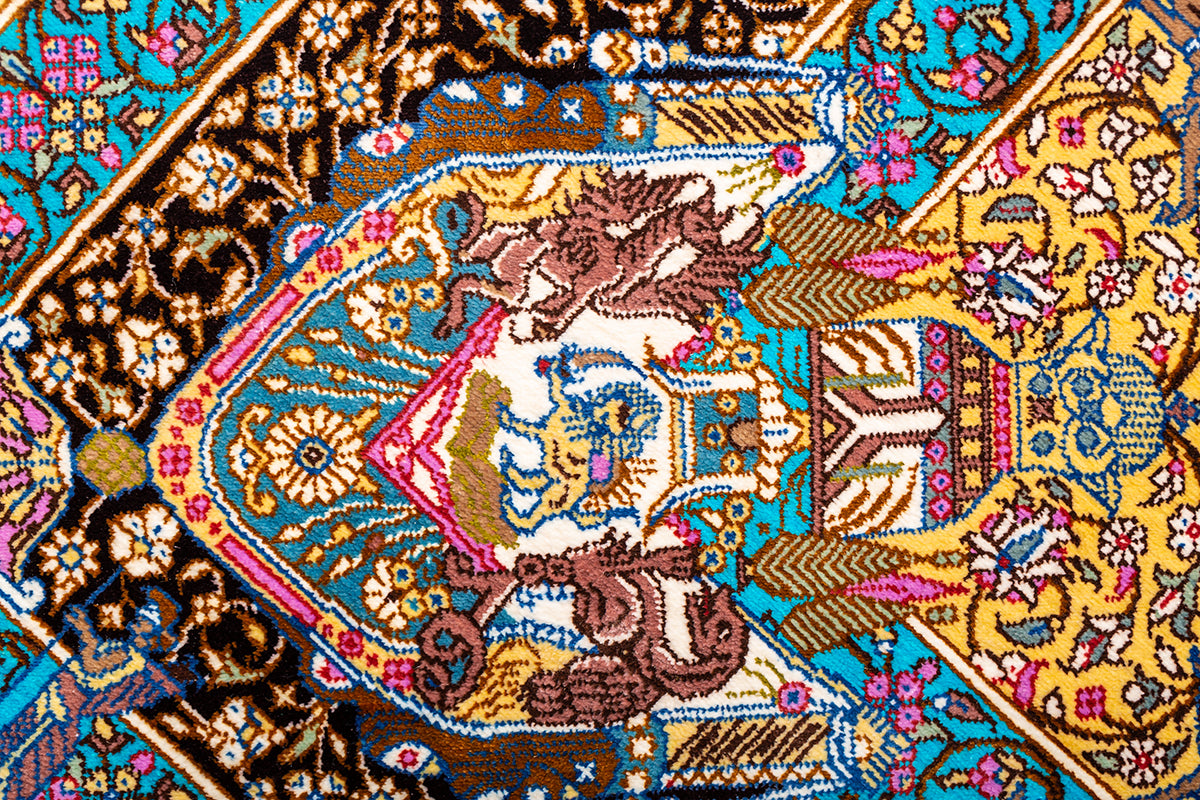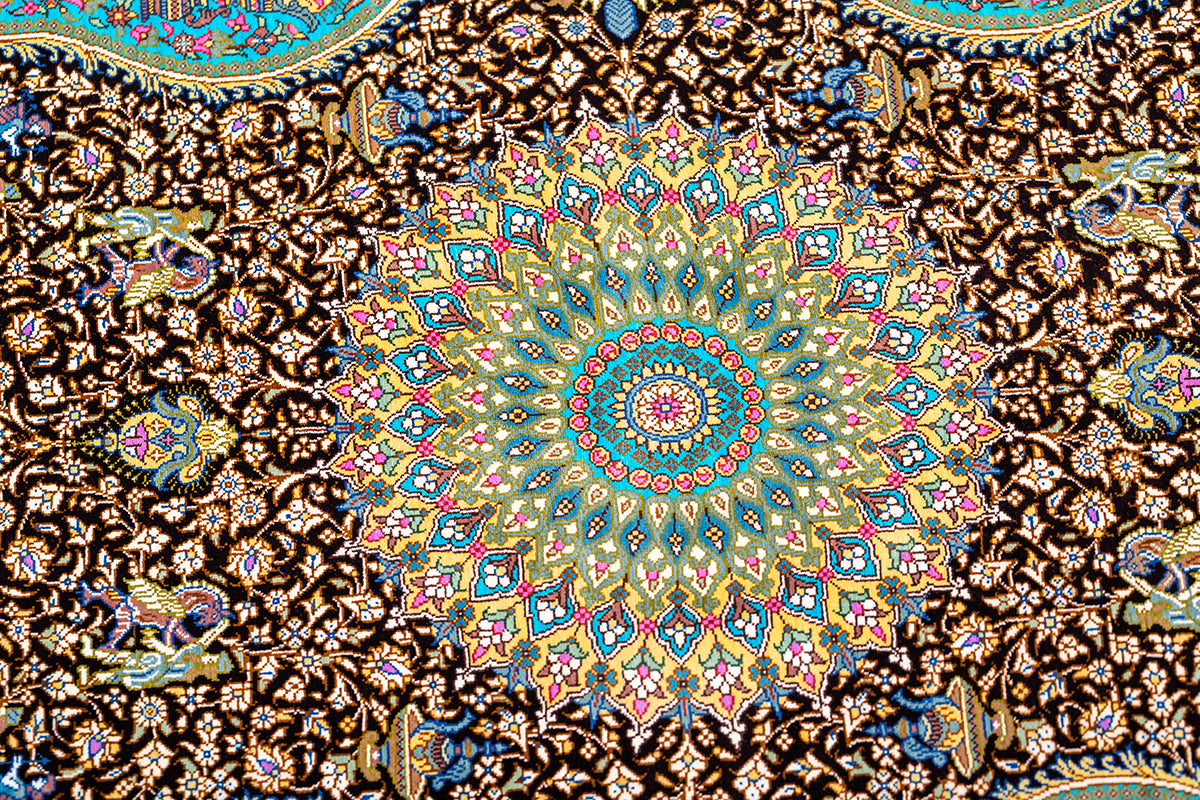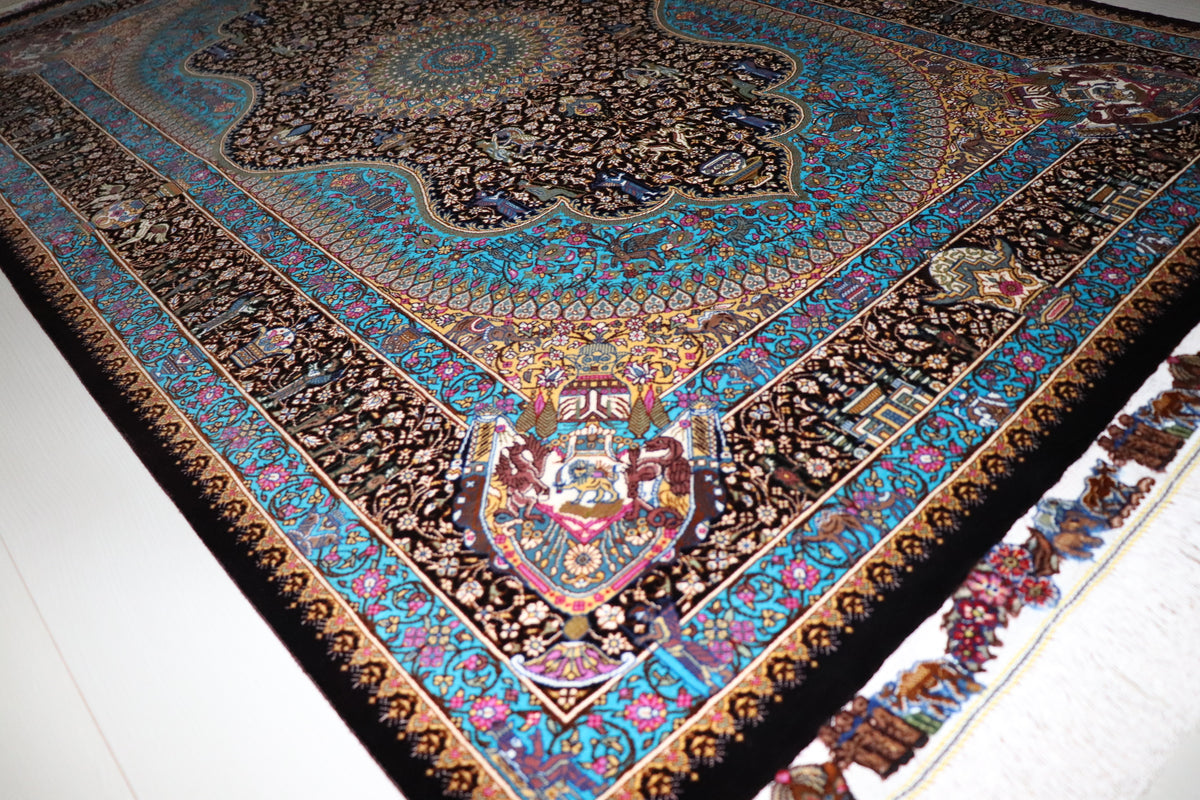 The field design also features traditional plant motifs and intricate workmanship, creating a perfect harmony between each section of the carpet. This intricacy is achieved through a very high knot density (1.1 million knots per square meter), further enhancing the carpet's durability and three-dimensionality.