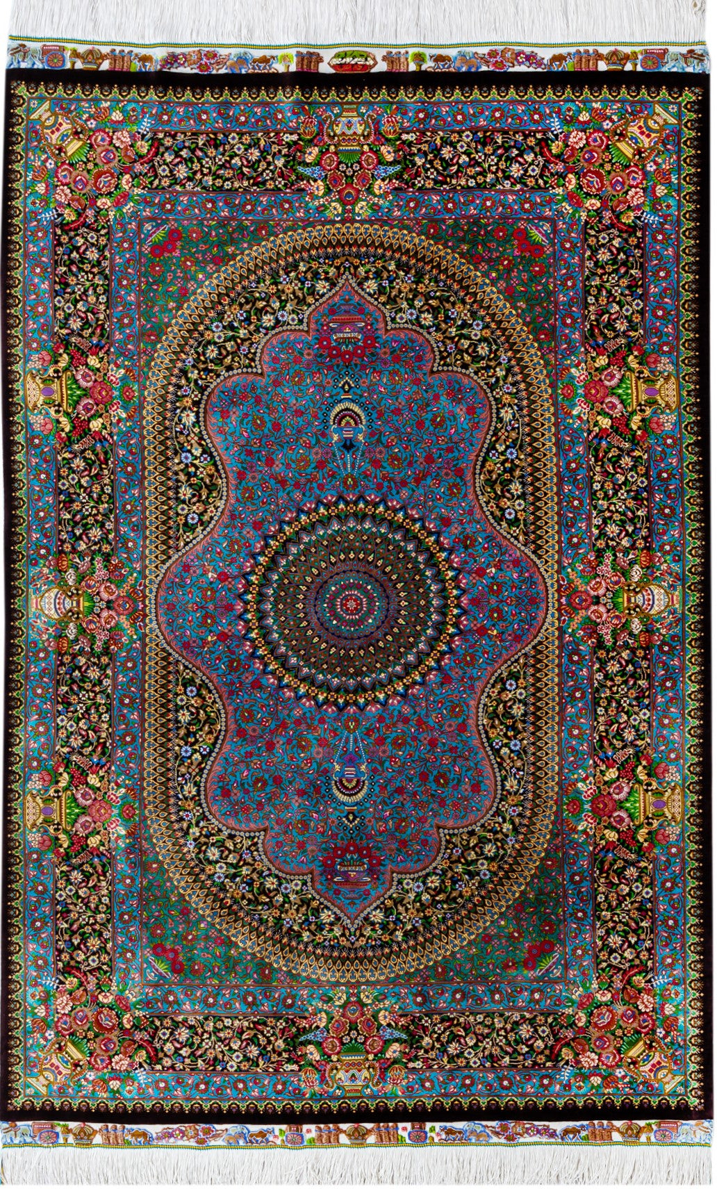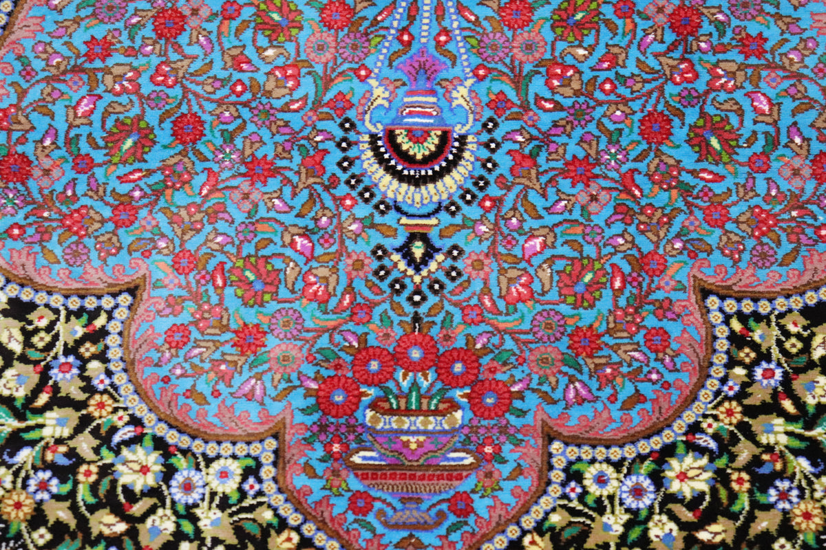 Persian carpet from Qom, 100% silk, Mirmehidi Atelier, the vase pattern and the blue-green color have a beautiful contrast