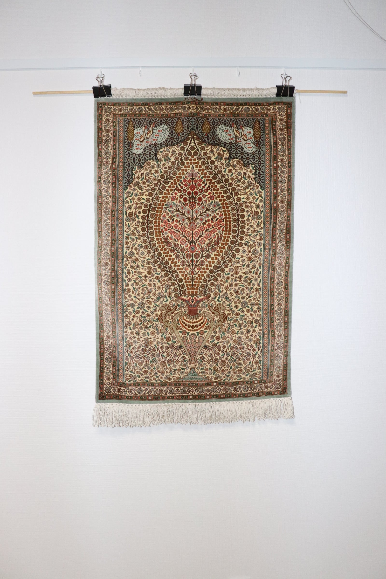 Persian carpet from Qom, 100% silk, Mirmehidi Atelier, the vase pattern and the blue-green color have a beautiful contrast