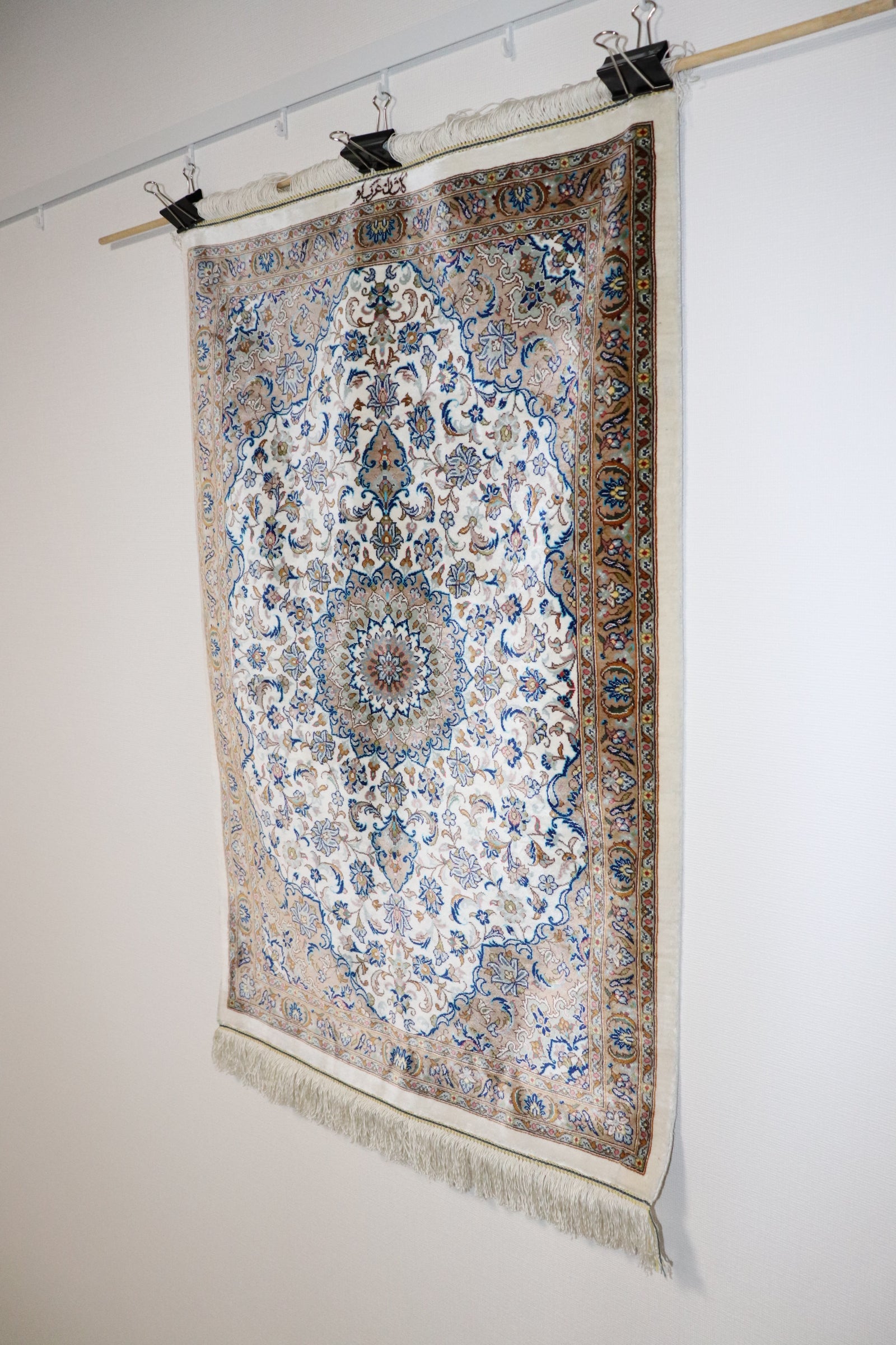 Delicate patterns, mainly medallion/Rachak Trangi patterns, are carefully drawn by artisans. The beautiful luster unique to silk further enhances the delicate patterns and adds a sense of luxury to the space. It is also hand-woven at a high density of 1.2 million knots/square meter, making it durable and soft to the touch.