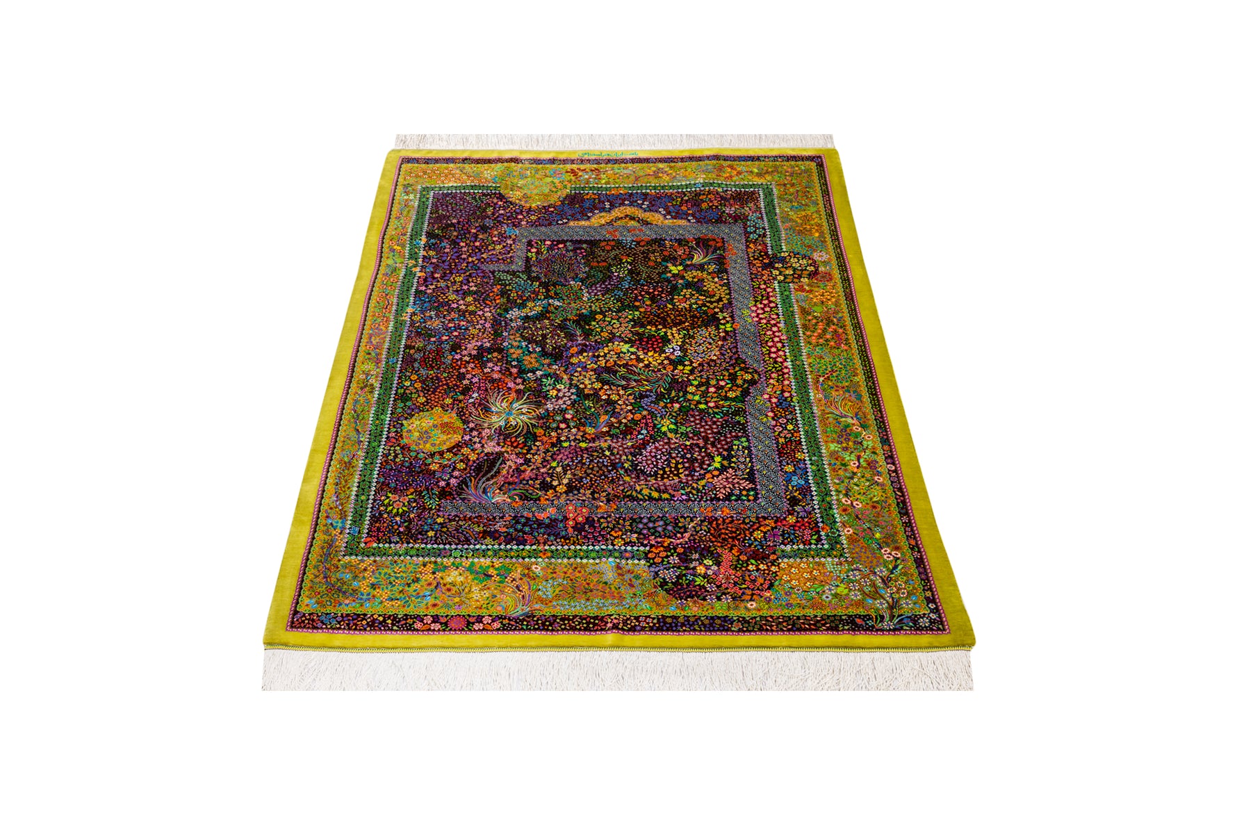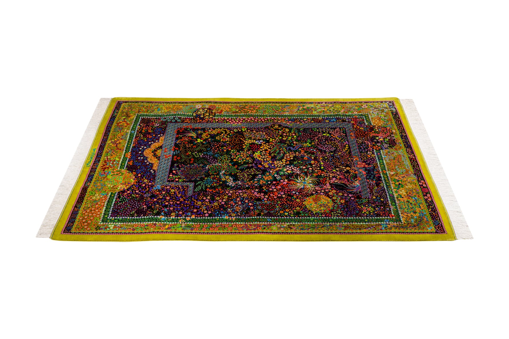Persian carpets, silk Persian carpets, carpets from Qom, Eshagi Workshop, tree of life design, medallion pattern, black carpet, yellow border carpet, 50 colors of small flowers, high density carpet, 1.63 million knot carpet, hand-woven Persian carpet, high-quality interior carpet, traditional beauty and modernity, a lifetime masterpiece
