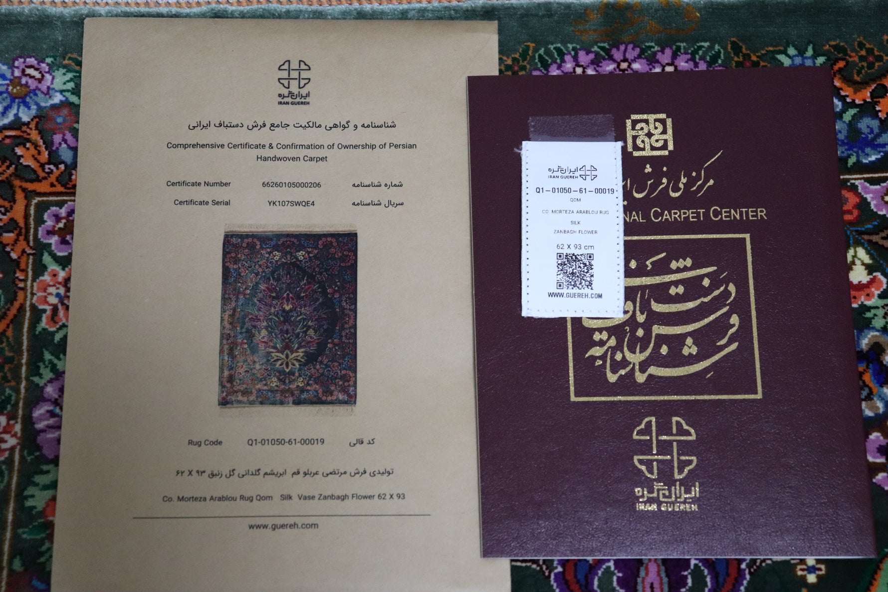Persian carpet from Qom, 100% silk, Mirmehidi Atelier, the vase pattern and the blue-green color have a beautiful contrast