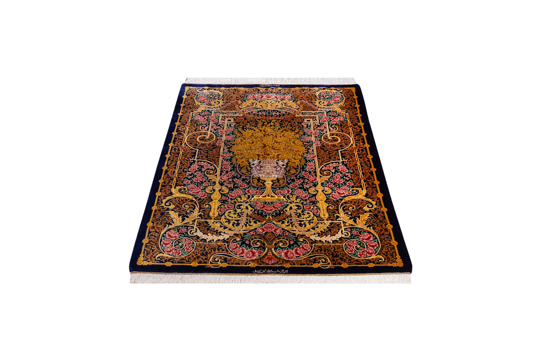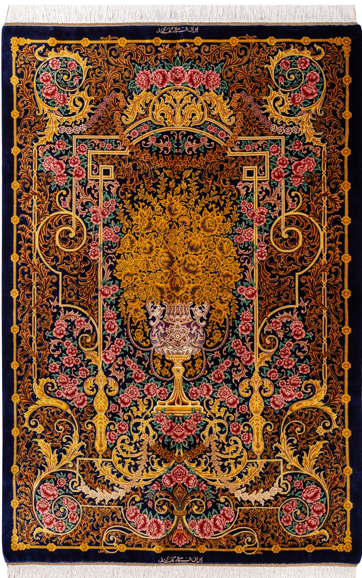 This work is a masterpiece by the Mirmehidi workshop, and features a deep navy blue background with gorgeous gold decoration. The flowers overflowing from the large vase in the center are full of vitality and woven with fine details. This design is known as the "Goldani" (vase) motif, and shows the outstanding skill of the artisans.