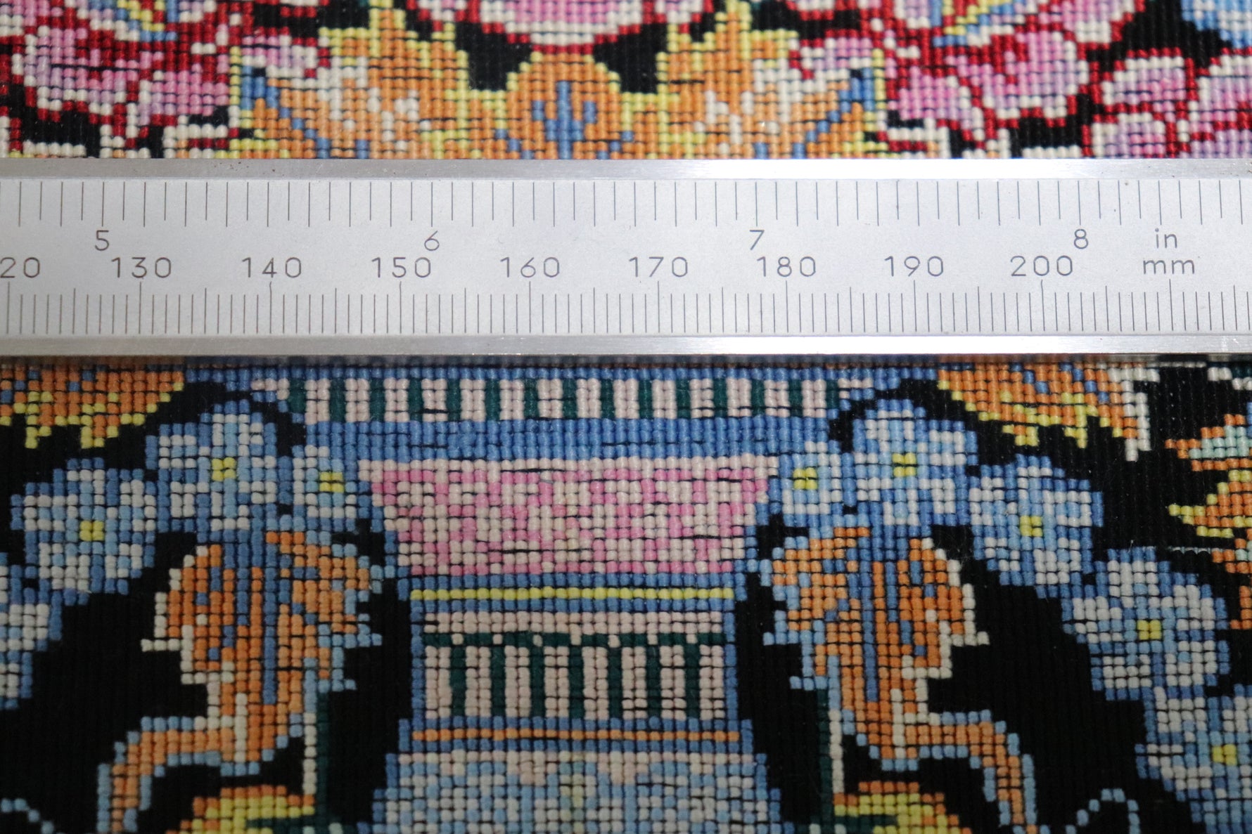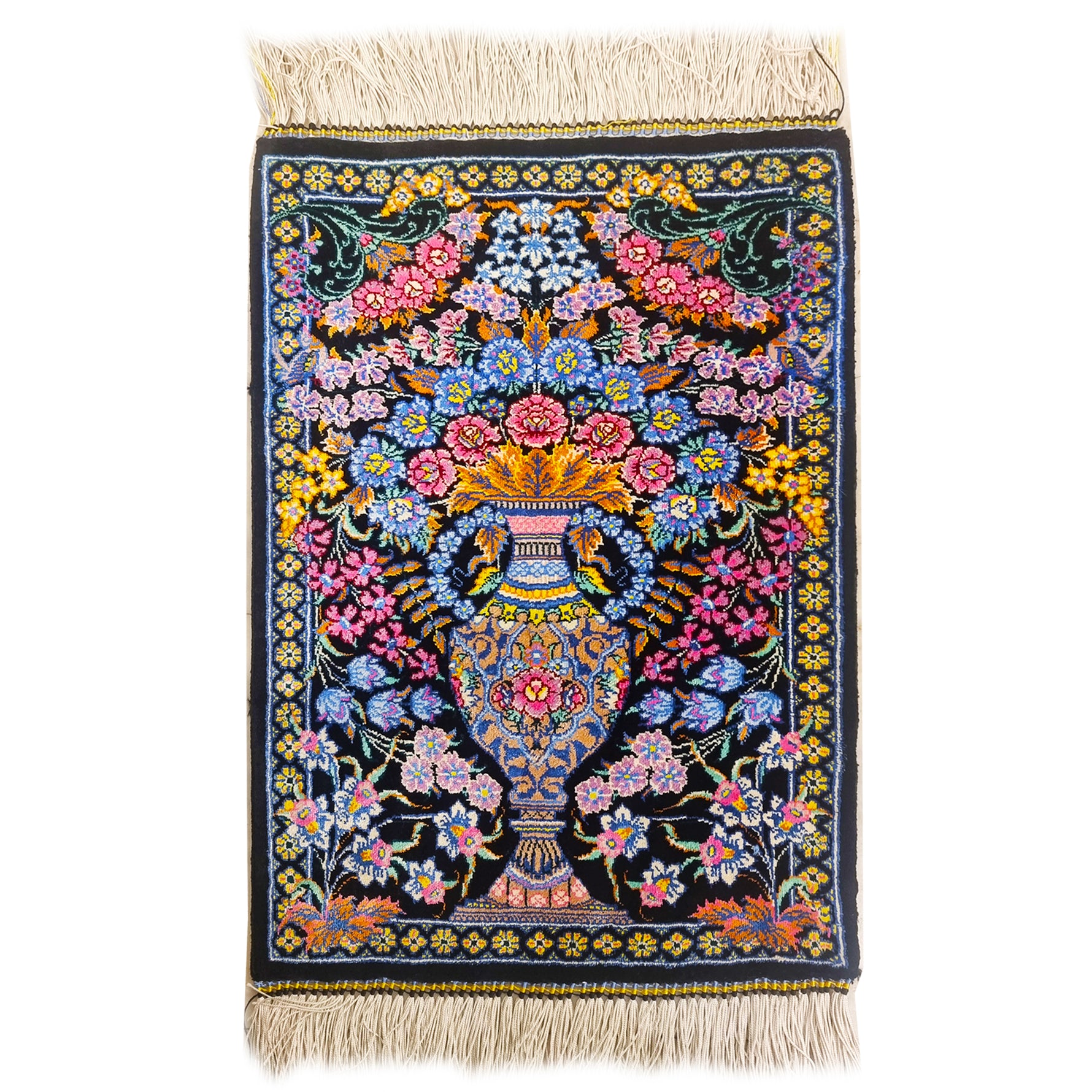 Persian carpet from Qom, 100% silk, Mirmehidi Atelier, the vase pattern and the blue-green color have a beautiful contrast