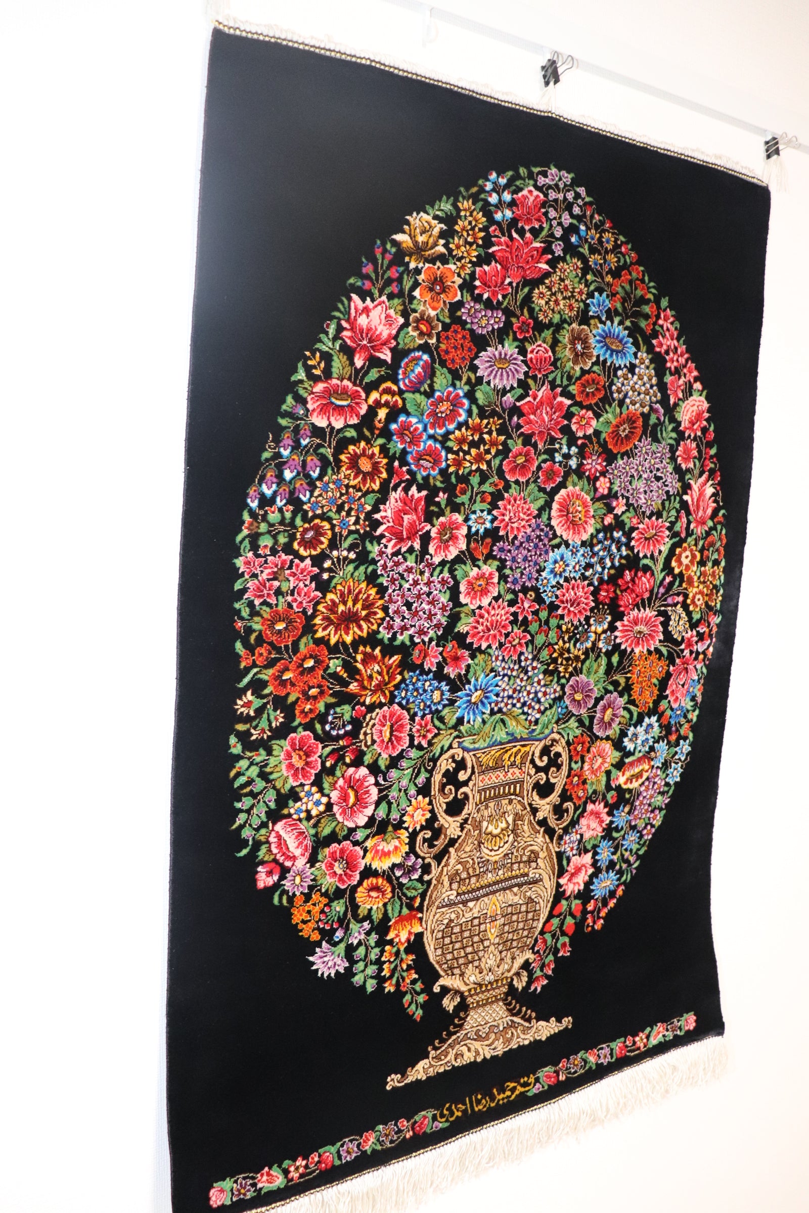 Persian carpet, 100% silk from Qom, Mirmekhidi Atelier, a vase pattern with gorgeous deep green and pink colors