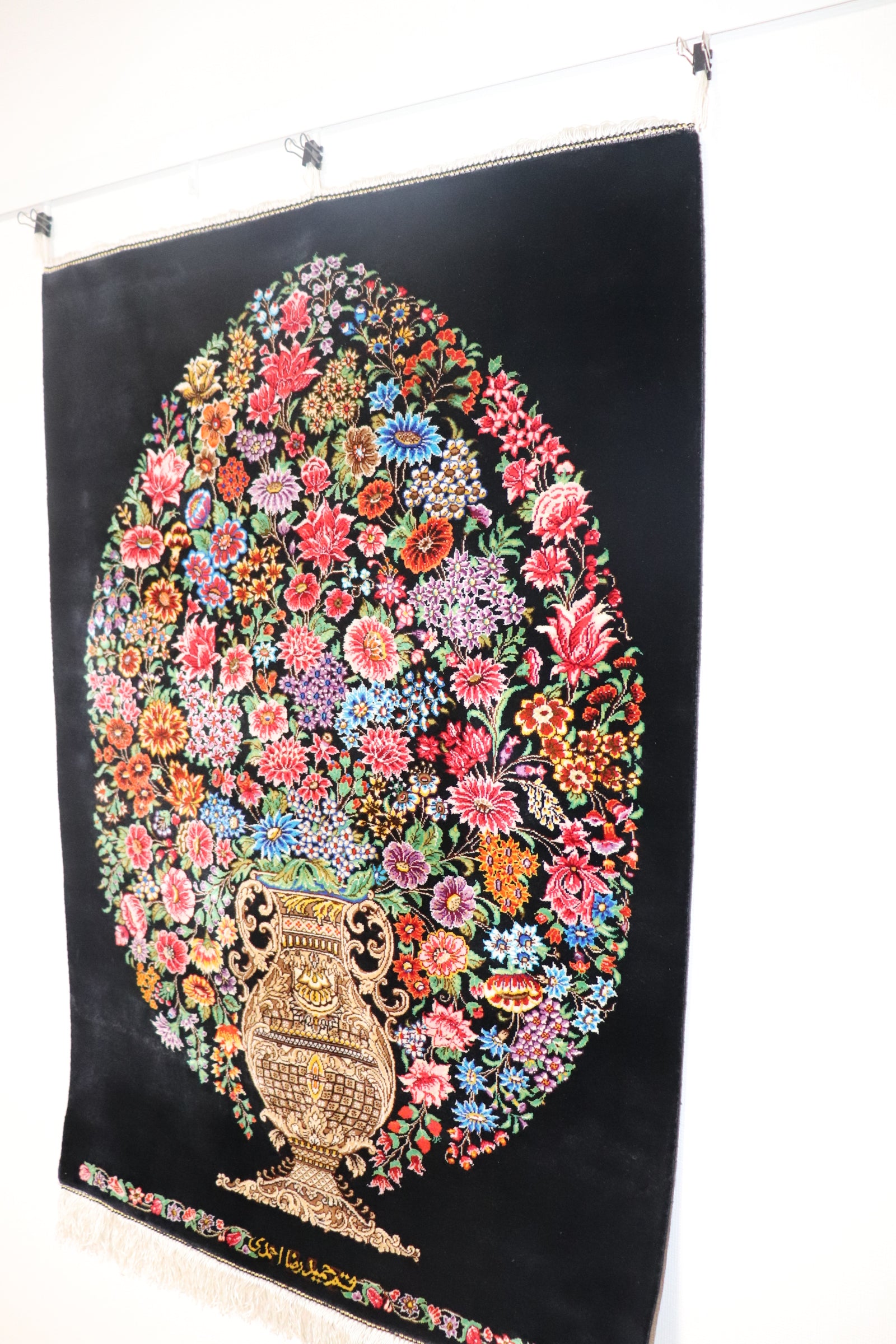 Persian carpet from Qom, 100% silk, Mirmehidi Atelier, the vase pattern and the blue-green color have a beautiful contrast