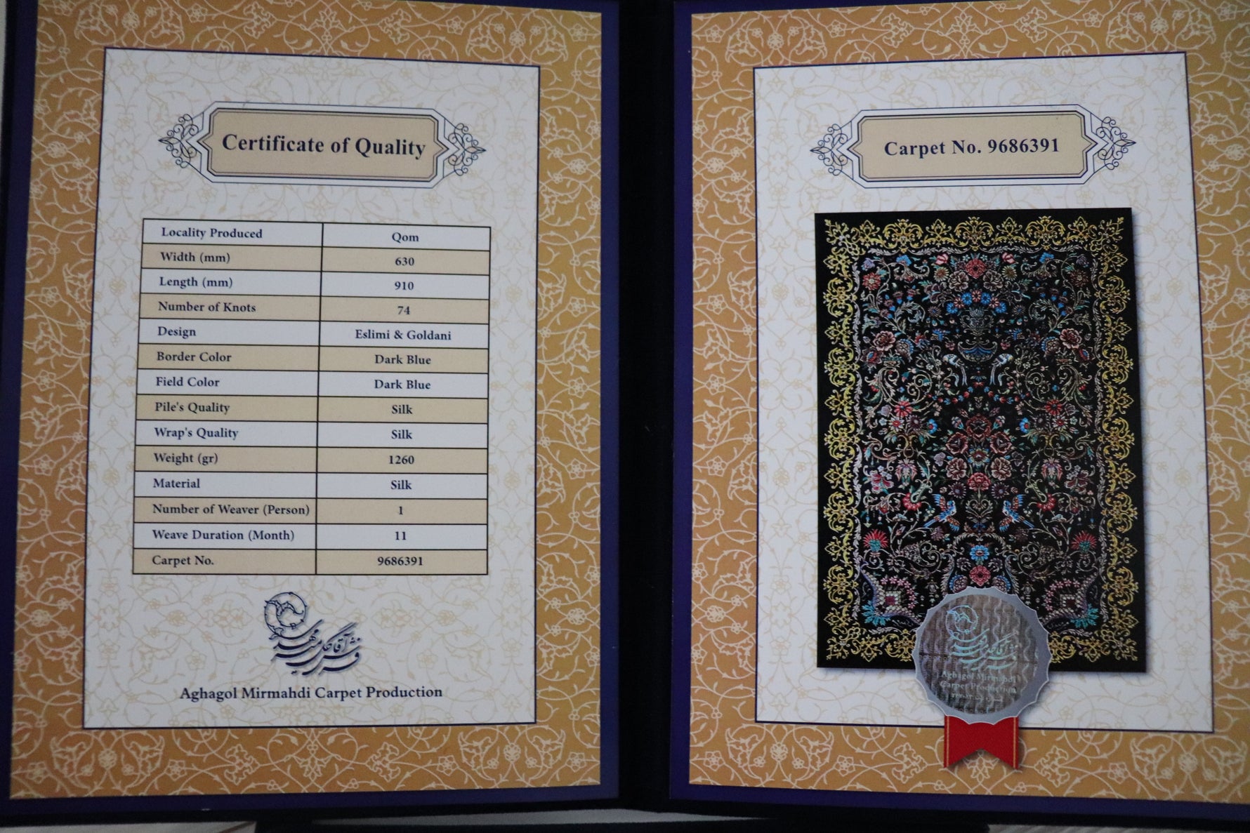 Persian carpet, 100% silk from Qom, Mirmehidi workshop, entrance mat size
