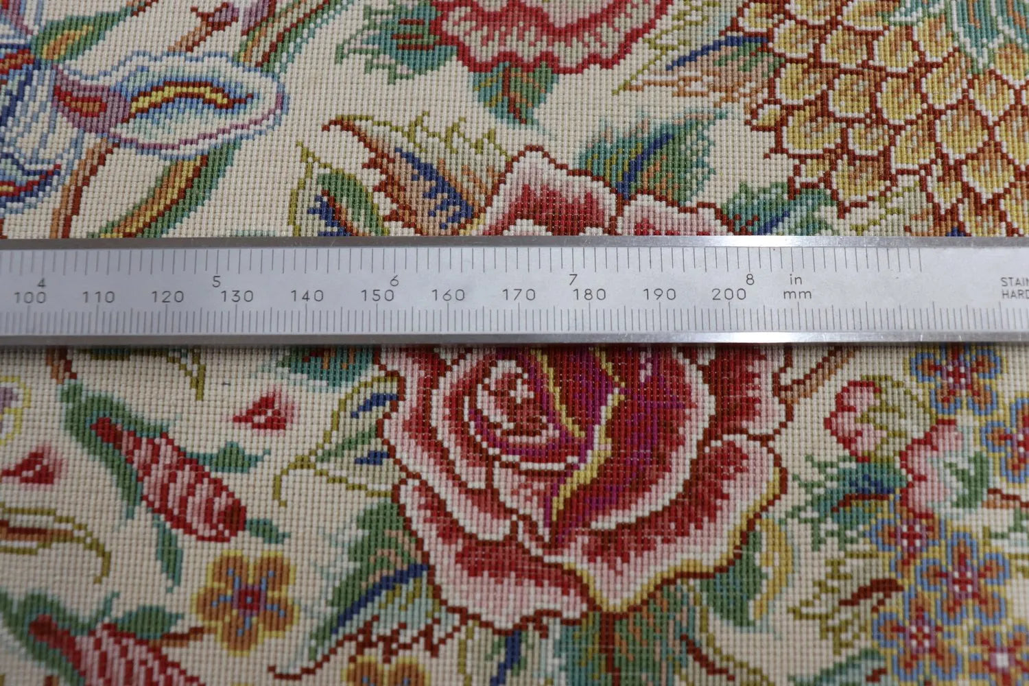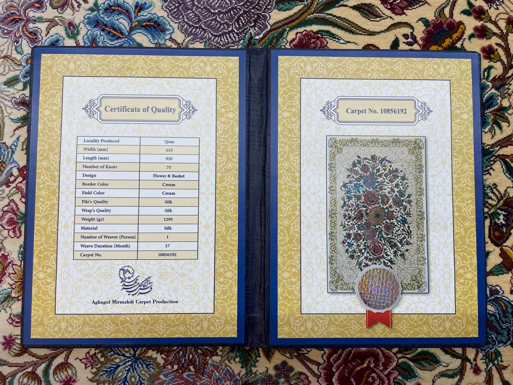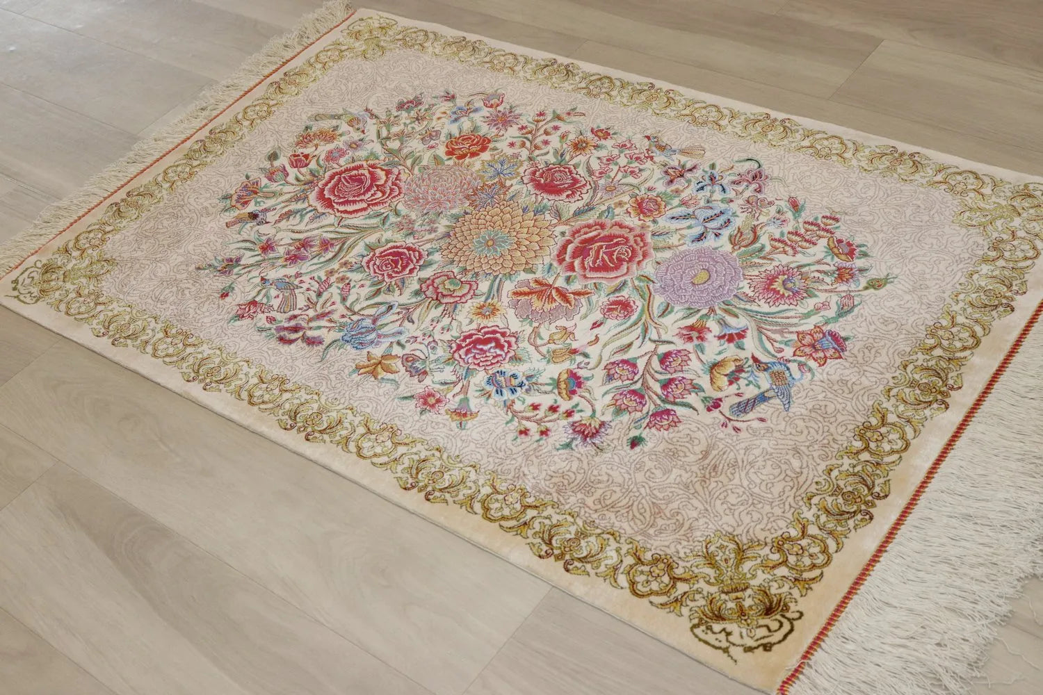 Persian carpet from Qom, 100% silk, Mirmehidi workshop, elegant floral and bird pattern