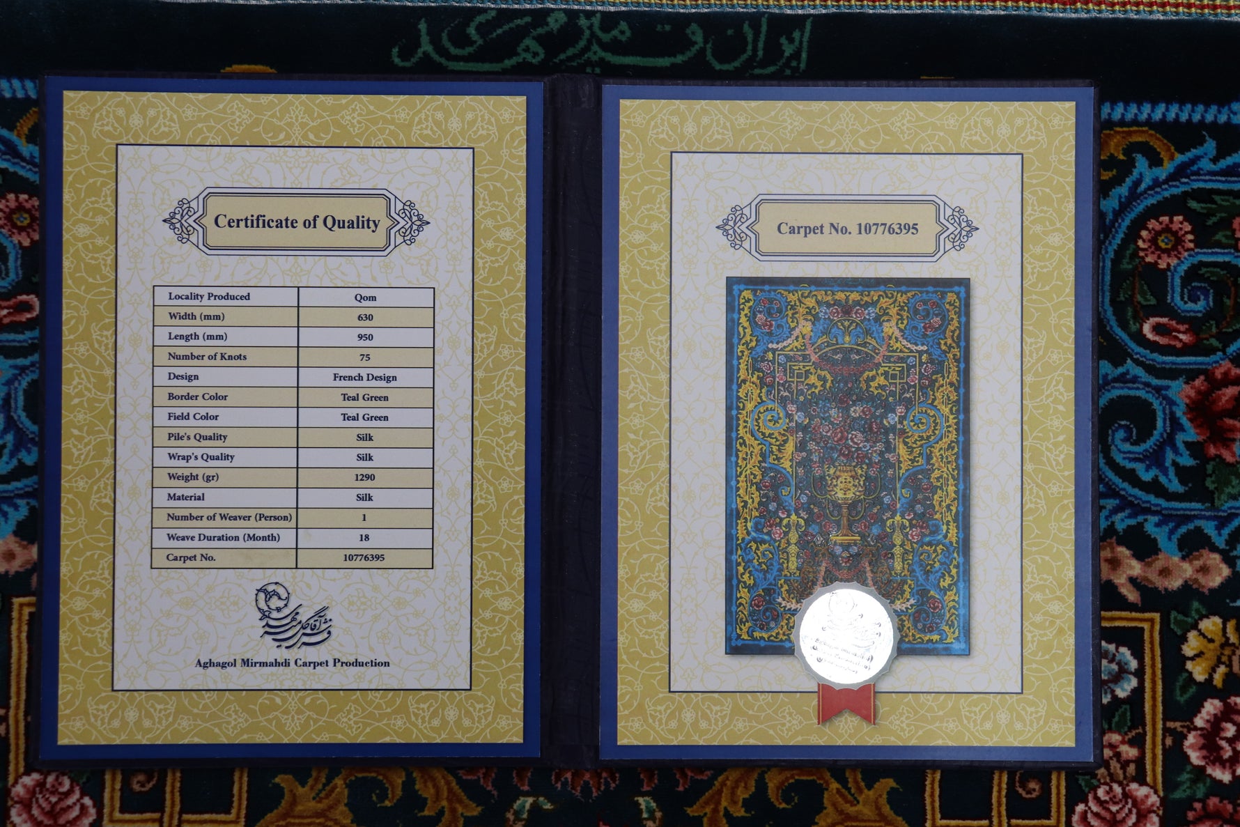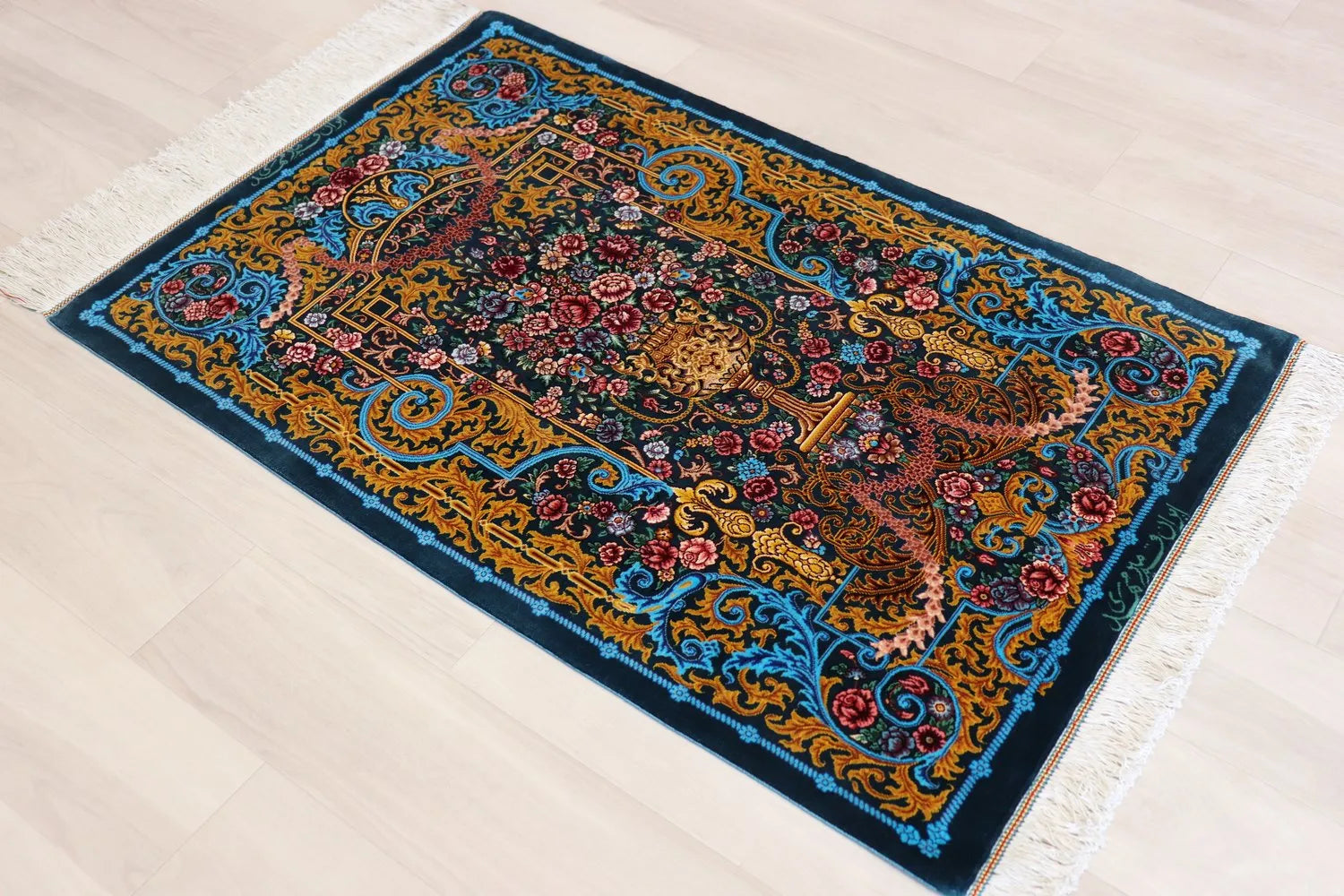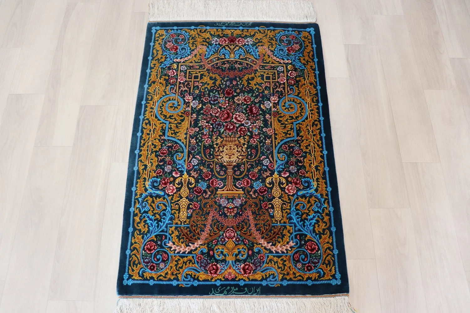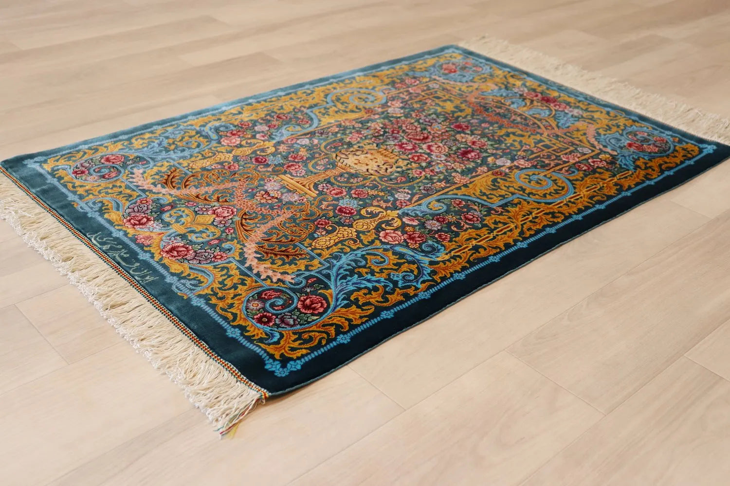 Persian carpet from Qom, 100% silk, Mirmehidi Atelier, the vase pattern and the blue-green color have a beautiful contrast