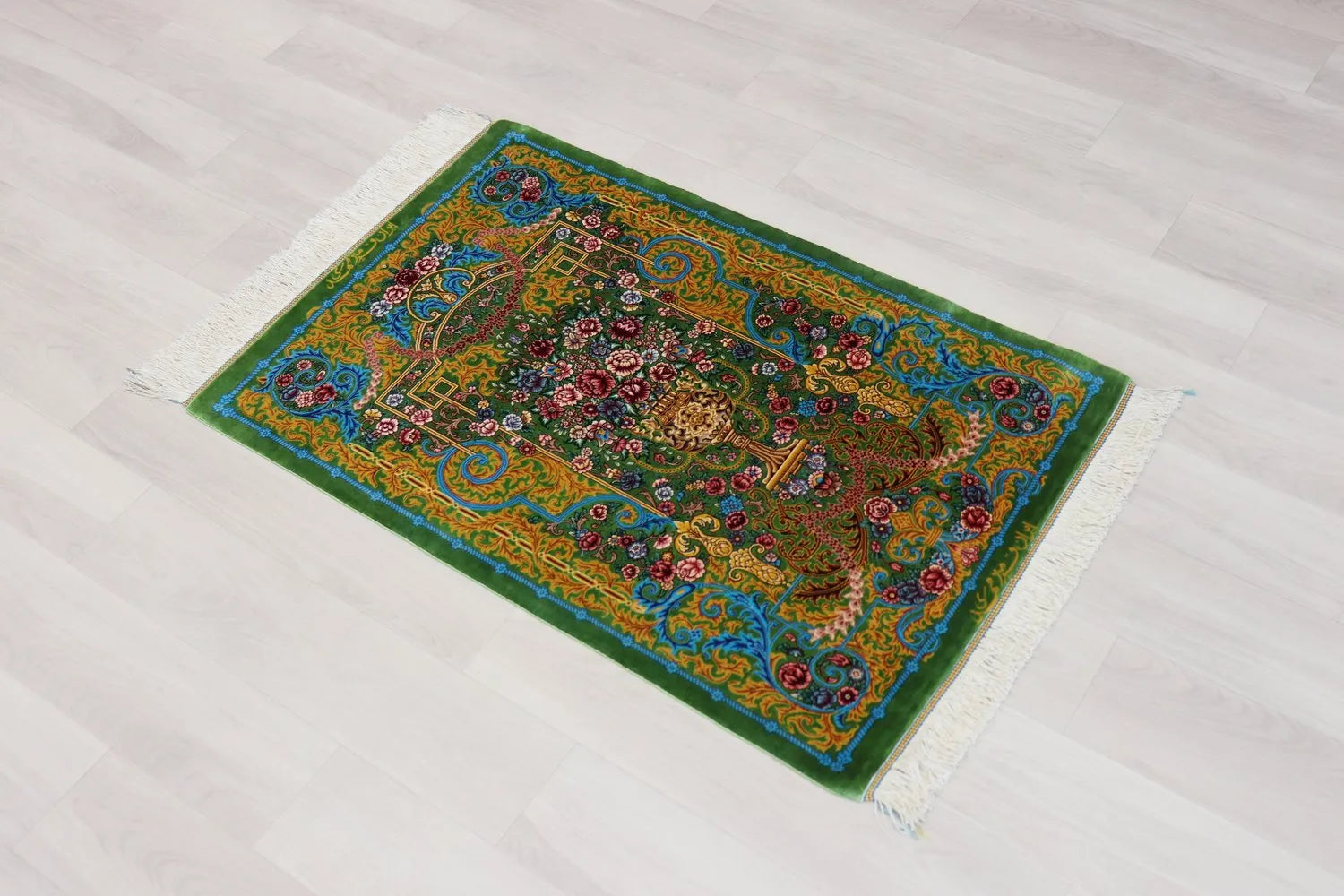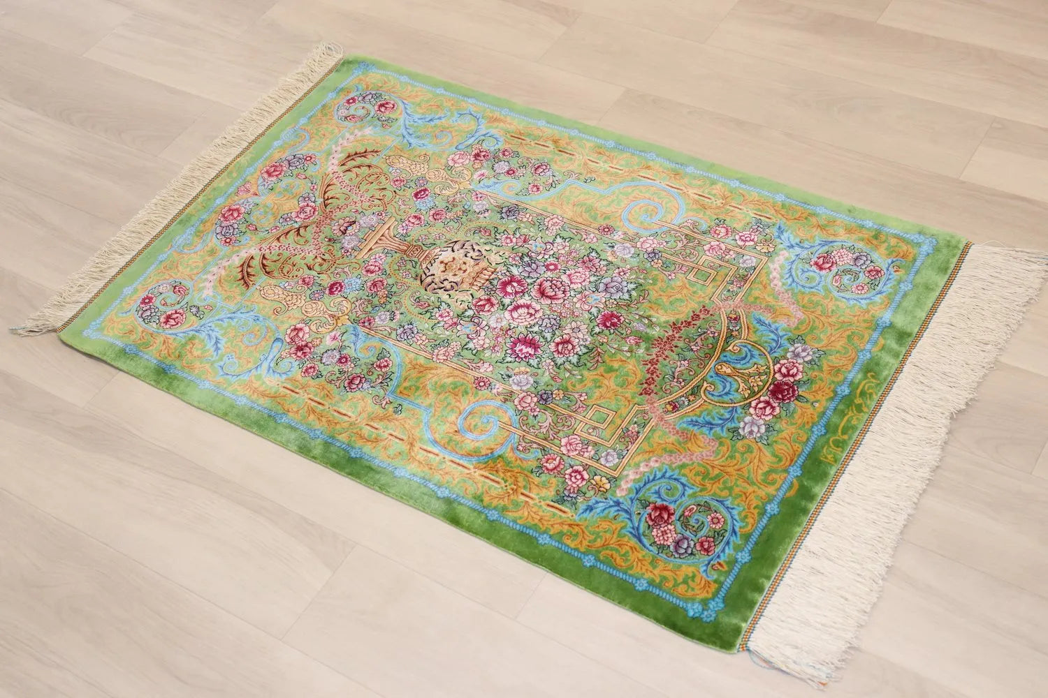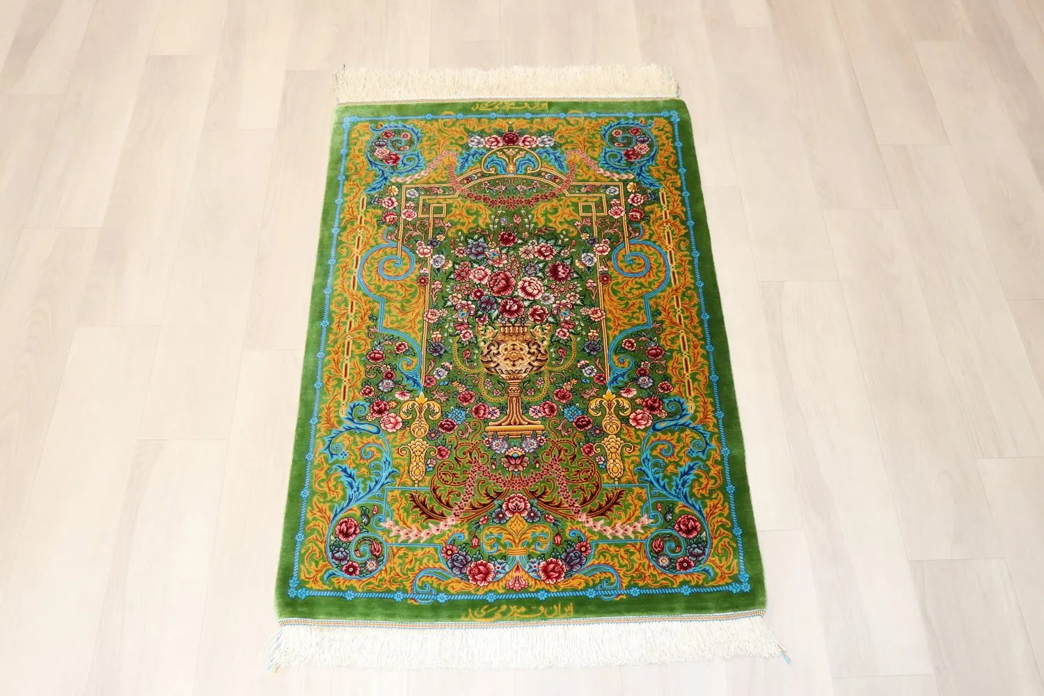 Persian carpet from Qom, 100% silk, Mirmehidi Atelier, the vase pattern and the blue-green color have a beautiful contrast