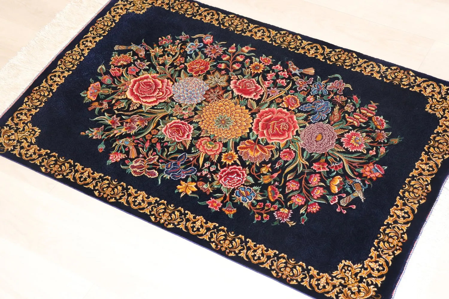 We are pleased to present you with a superb silk Persian carpet by the Mirmehidi Atelier, a master craftsman in Qum. This piece, with gorgeous flowers blooming on a deep navy blue background that is almost jet black, is truly worthy of being called a "jewel among carpets."