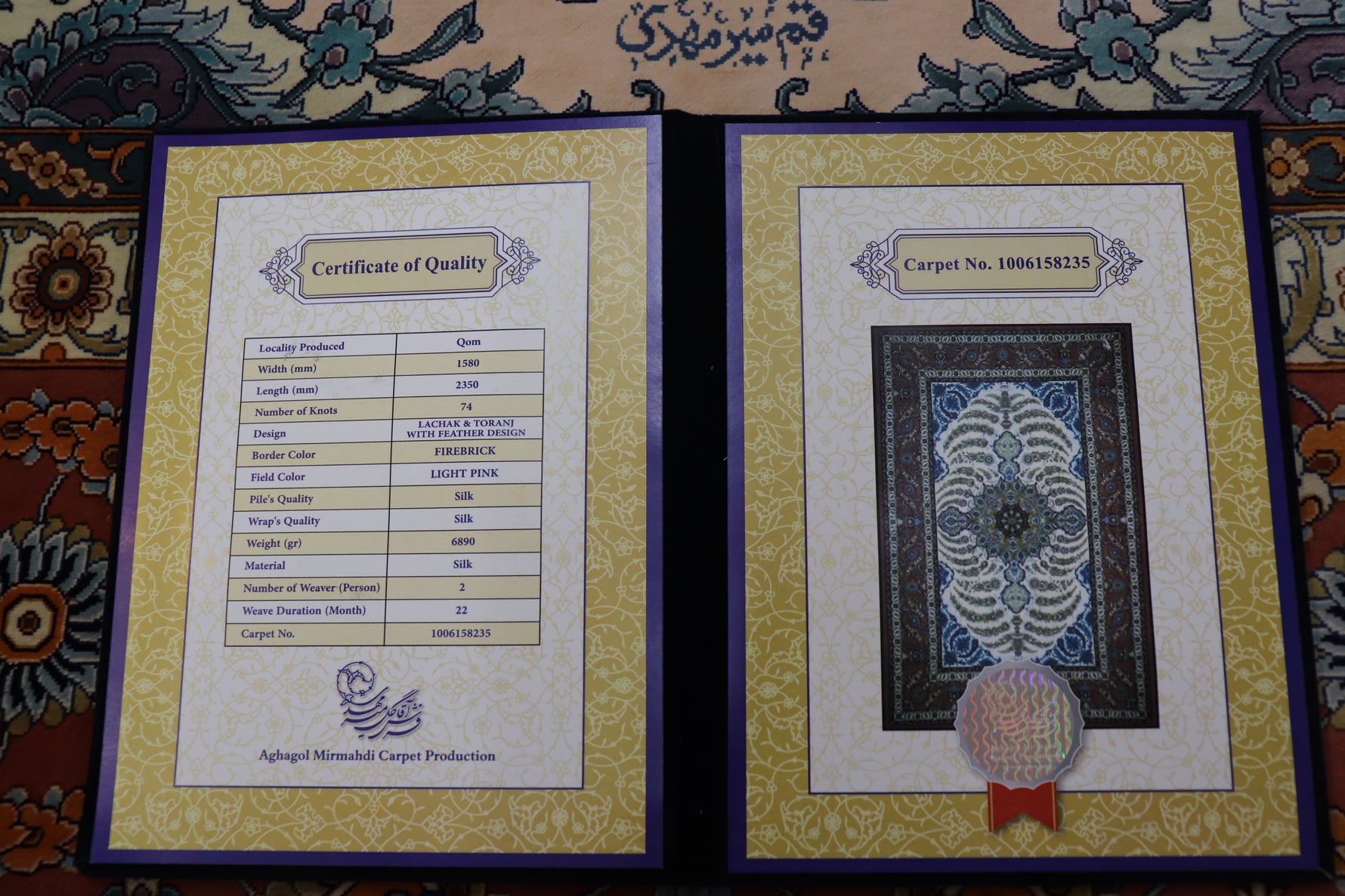 Persian carpet, 100% silk from Qom, Mirmekhidi atelier, a traditional medallion pattern and gorgeous red border.