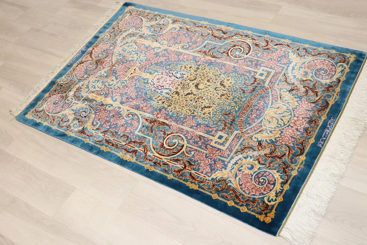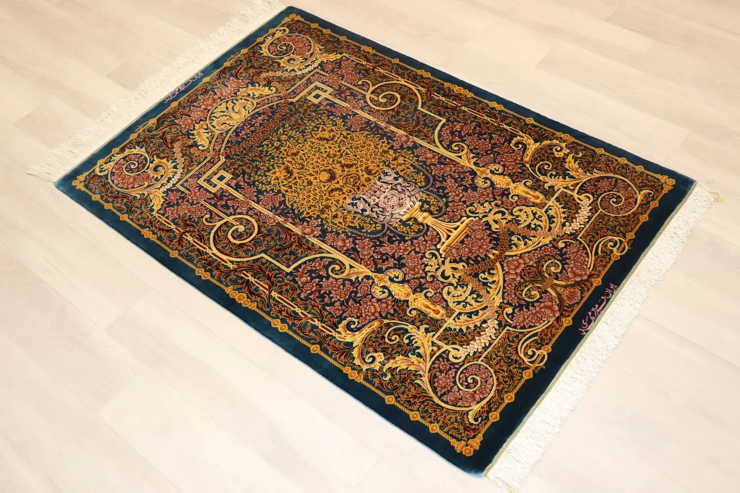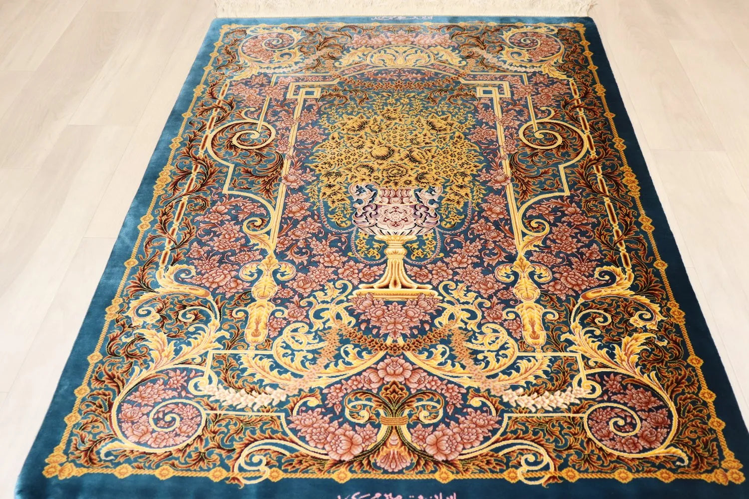 Persian carpet from Qom, 100% silk, Mirmehidi Atelier, the vase pattern and the blue-green color have a beautiful contrast