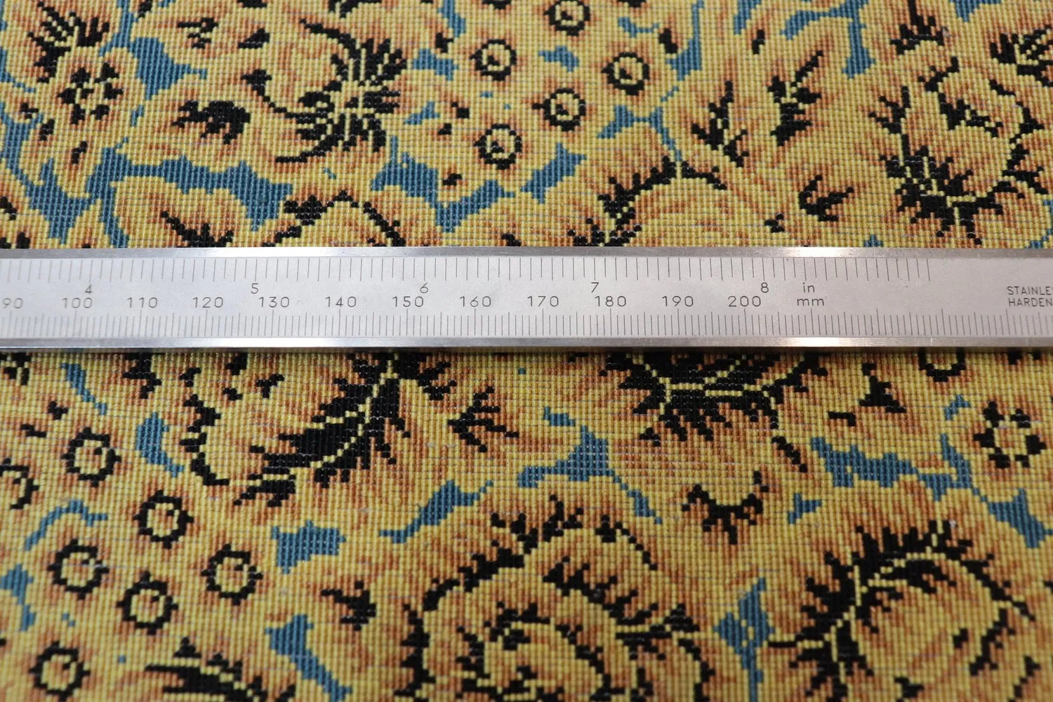 This is a 100% high-quality Persian carpet made by the Mirmehidi Atelier, a master craftsman from Qum. A vase filled with flowers is woven into the center of the carpet, surrounded by intricate arabesque patterns and flowers. The deep blue-green and gold colors used throughout the carpet contrast beautifully, enhancing its elegance and luxury. The luster of the silk allows the carpet to show different expressions depending on the angle, giving a rich depth to the space. The density and precision of the weave conveys its high quality at a glance, and simply laying it on the floor will elevate any space.