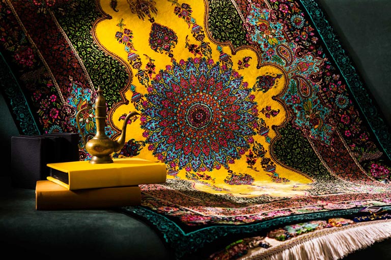 Jamshidi Atelier's Persian carpets are attractive for their silk-specific luster and delicate design. The vivid colors of crimson, gold, and turquoise stand out, and the look changes depending on the angle you look at them from. They skillfully combine traditional medallions, arabesque patterns, floral patterns, and lion and sun motifs, symbolizing kingship, wisdom, and justice.