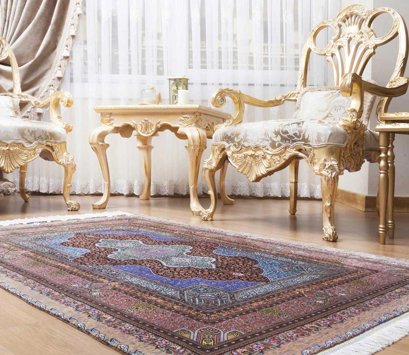 The design is centered around a medallion (the coat of arms in the center), and the beautiful Rachak Toranj pattern, a traditional Persian design, is intricately expressed, giving it a beauty reminiscent of a painting. The unique luster of silk shines from any angle, and the soft feel is appealing.