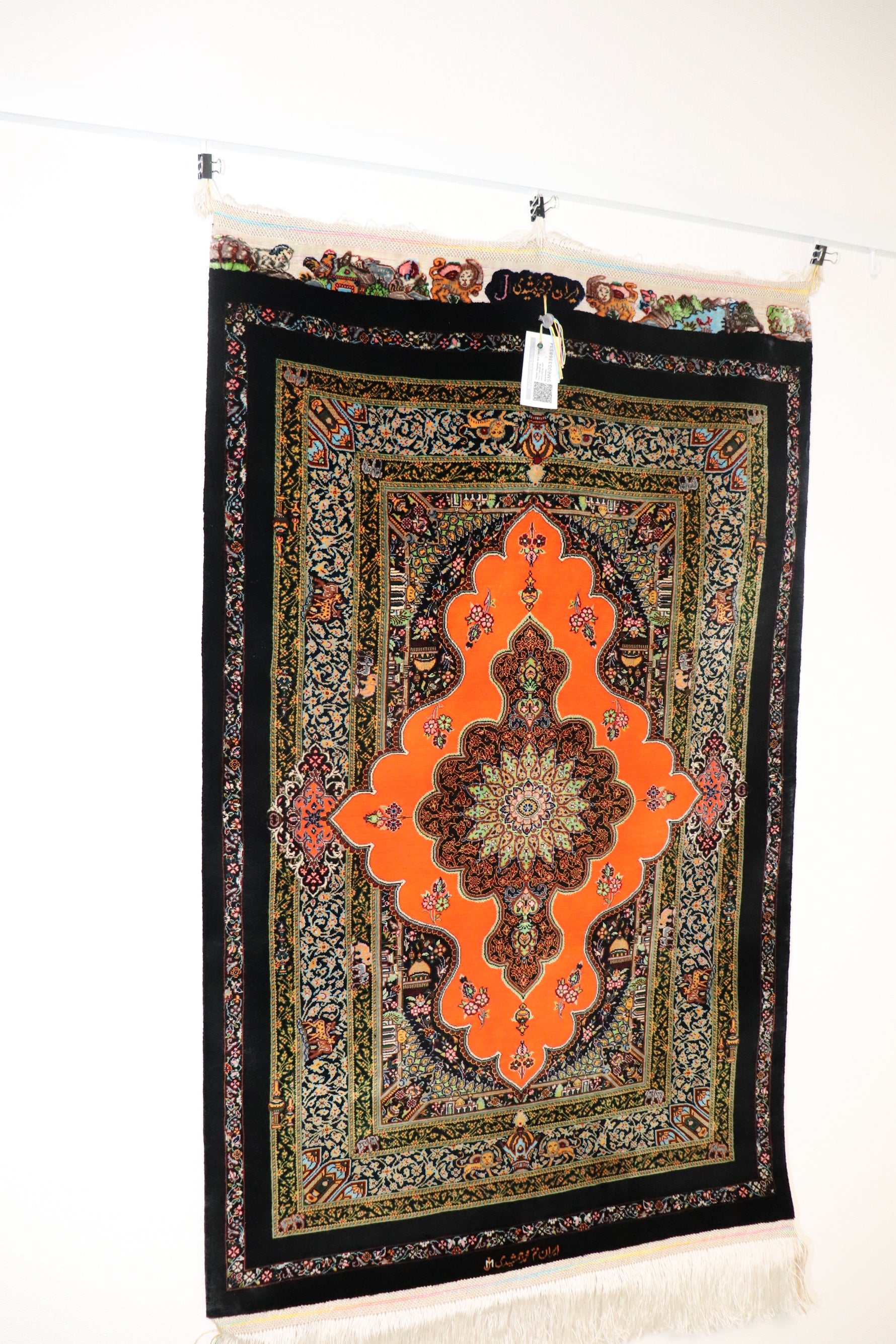 Persian carpet from Qom, 100% silk, Albar Studio original, paisley pattern, small size, perfect for wall decoration, gorgeous masterpiece