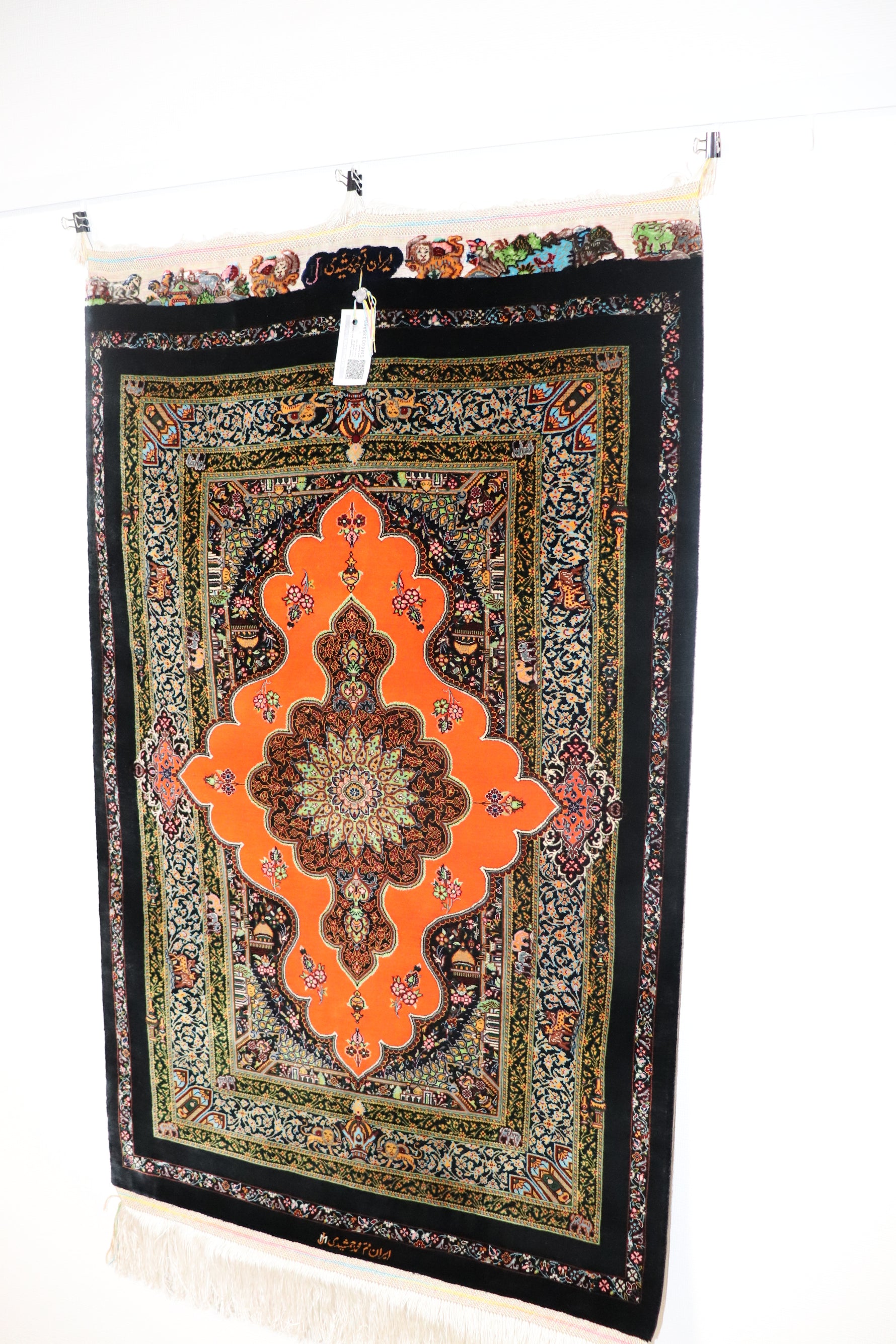 Persian carpet, 100% silk from Qom, Mirmekhidi atelier, a traditional medallion pattern and gorgeous red border.