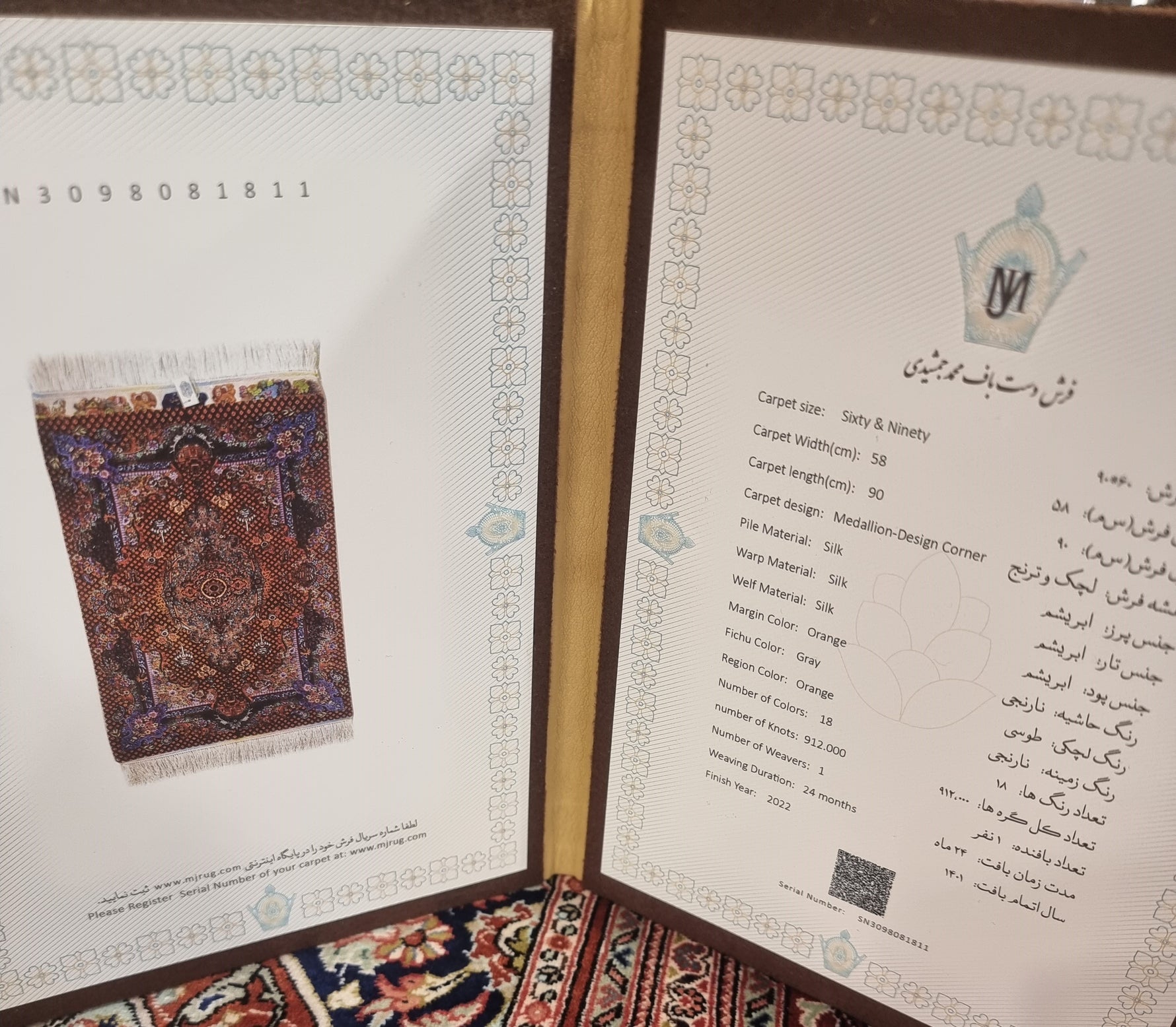 This carpet, which took 18 months to complete, is dyed with natural plant dyes to create a natural color and depth, and the luster and texture of the silk are in perfect harmony. It is a hand-woven masterpiece with a quality certificate from Jamshidi Atelier.