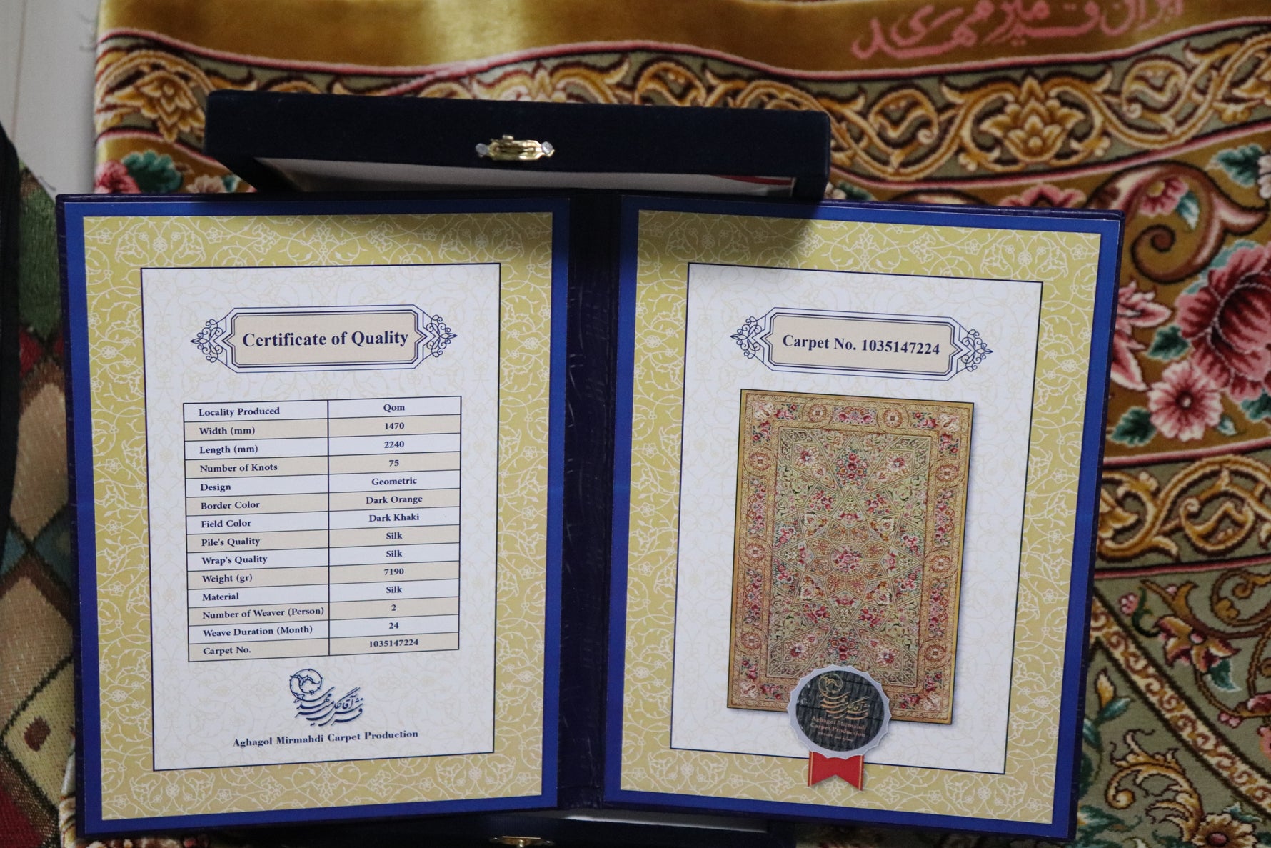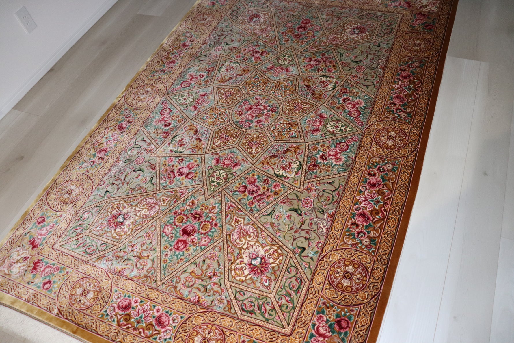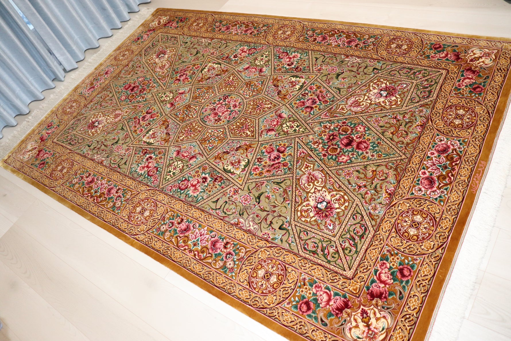 Persian carpets, silk Persian carpets, carpets from Qom, Mirmehidi workshop, Gombadi patterns, geometric design carpets, high-quality carpets, dark khaki carpets, dark orange borders, traditional beauty carpets, high-density carpets, 3.62 million knot carpets, cultural heritage carpets, carpets to be handed down to the next generation, calm space design