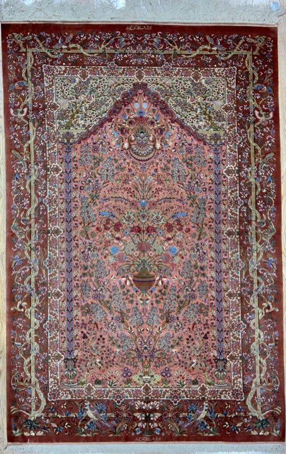 Persian carpet, 100% silk from Qom, Mirmekhidi Atelier, a vase pattern with gorgeous deep green and pink colors