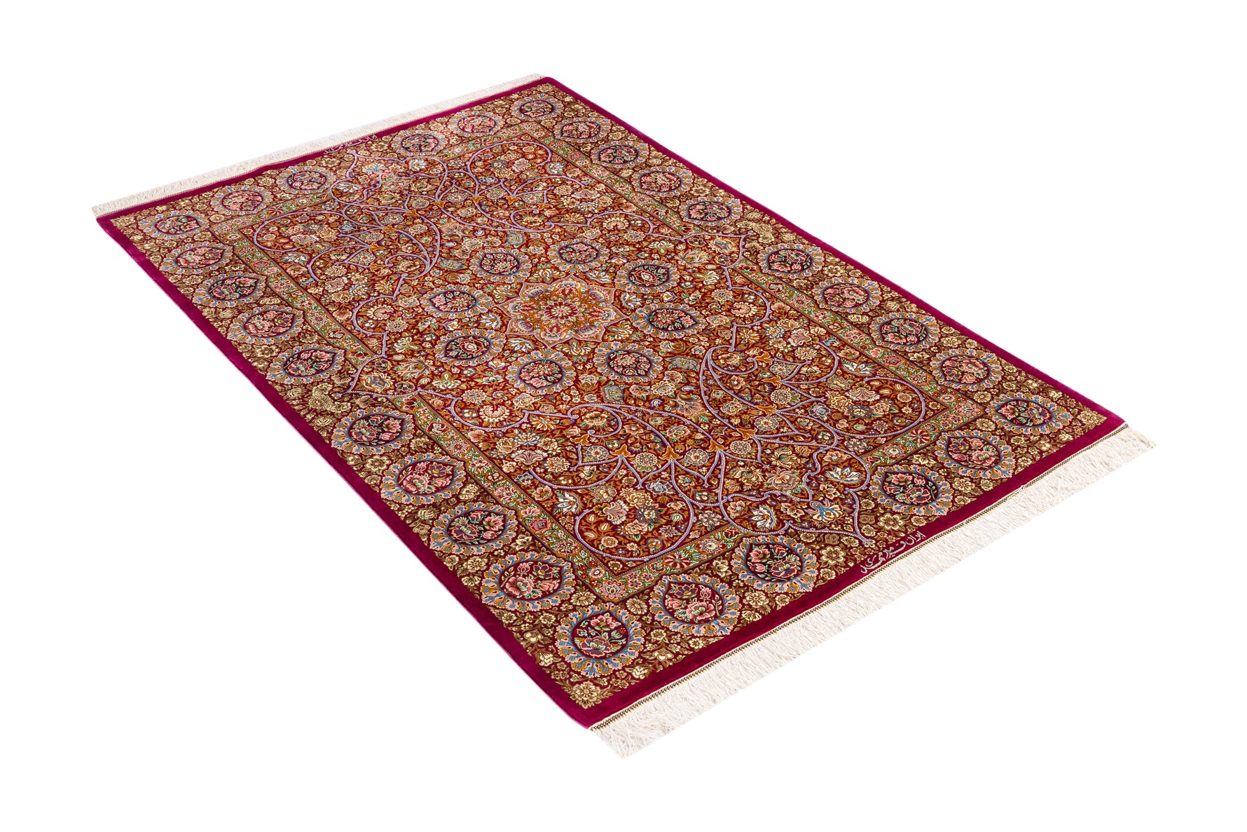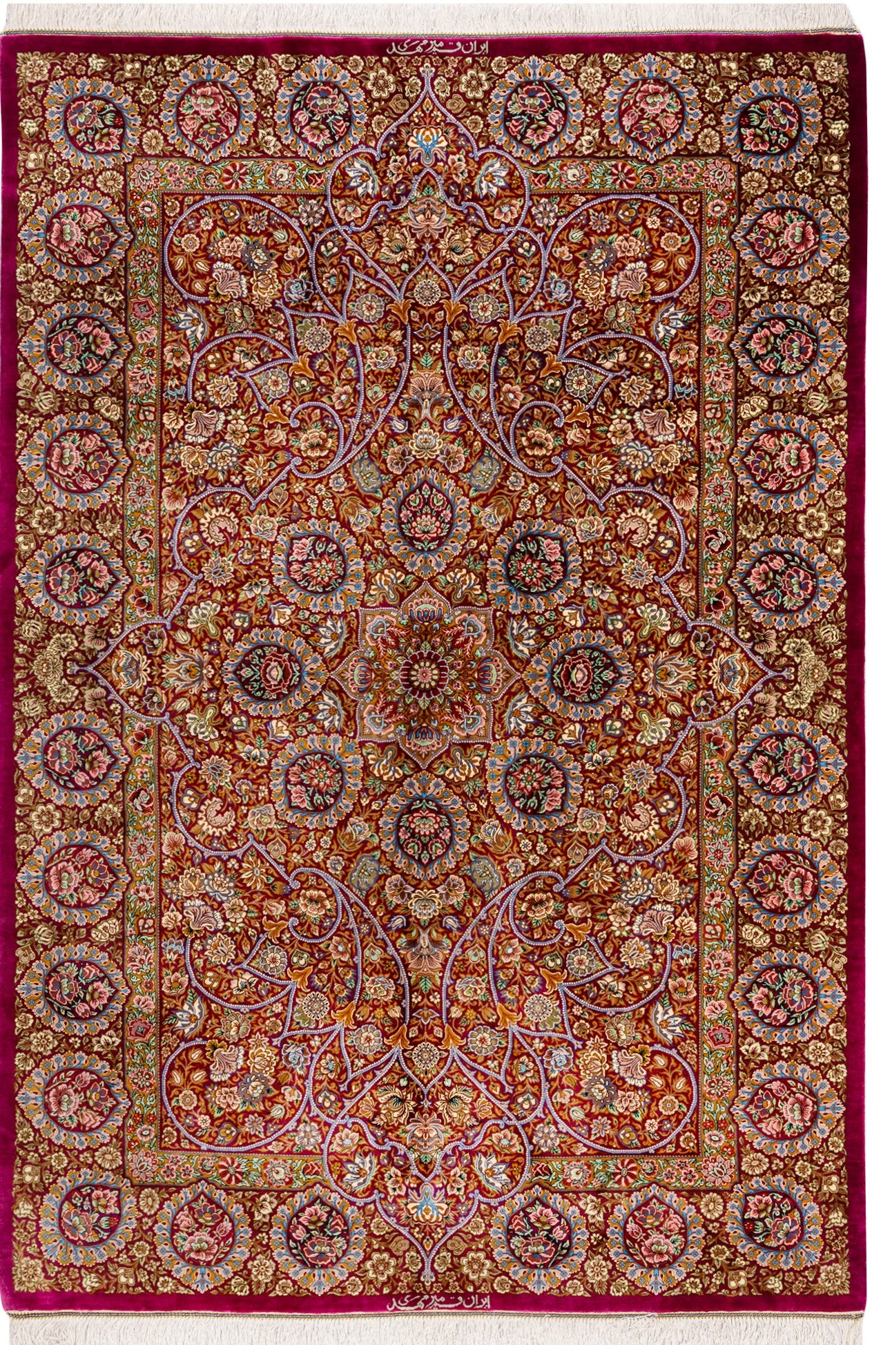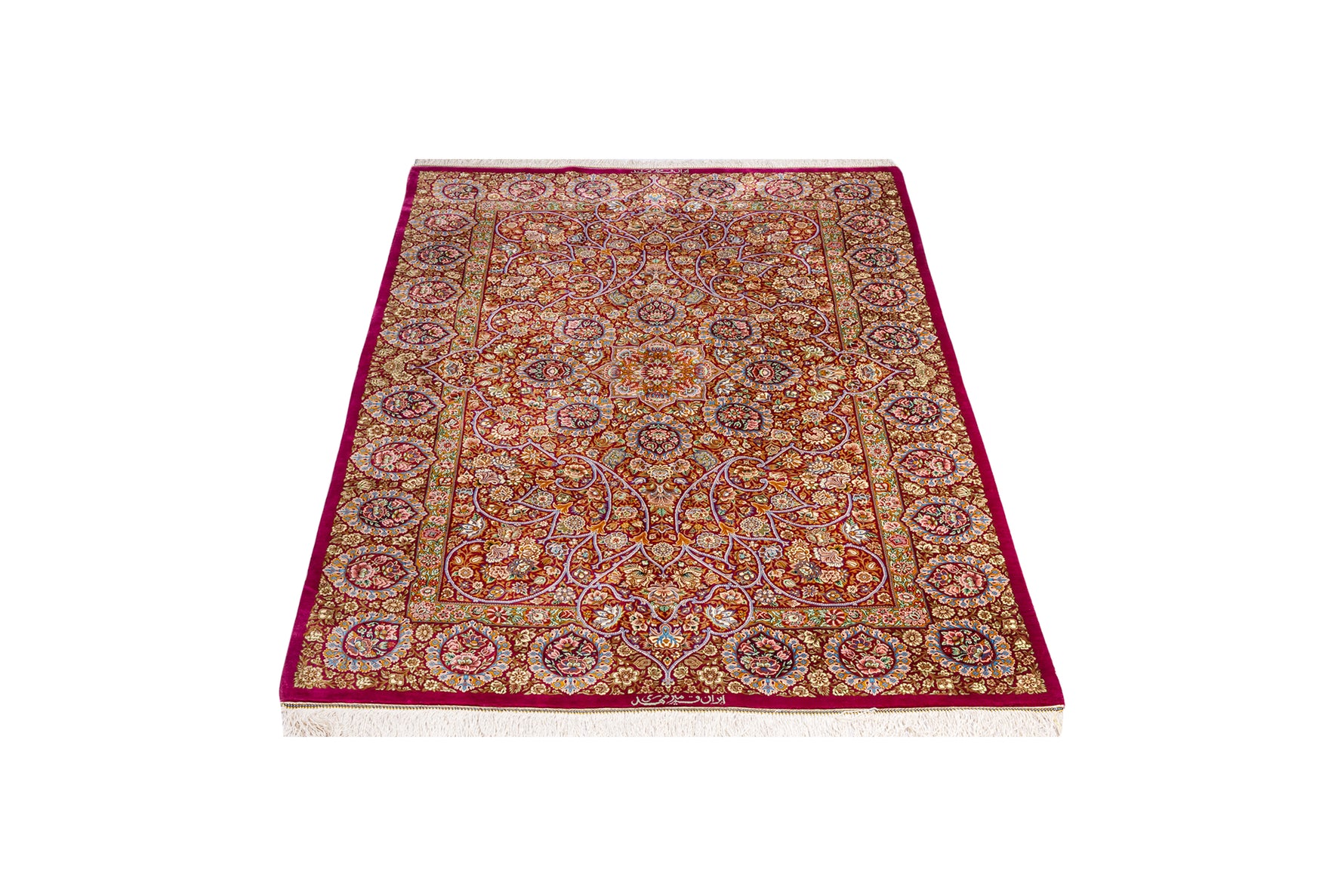 Persian carpet, 100% silk from Qom, Mirmekhidi atelier, a traditional medallion pattern and gorgeous red border.