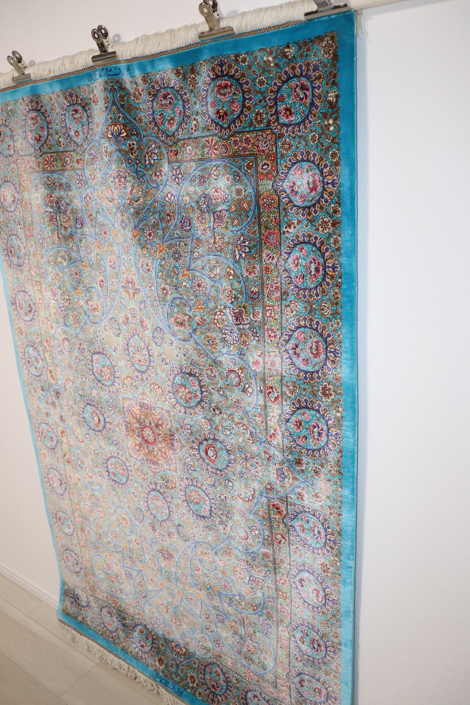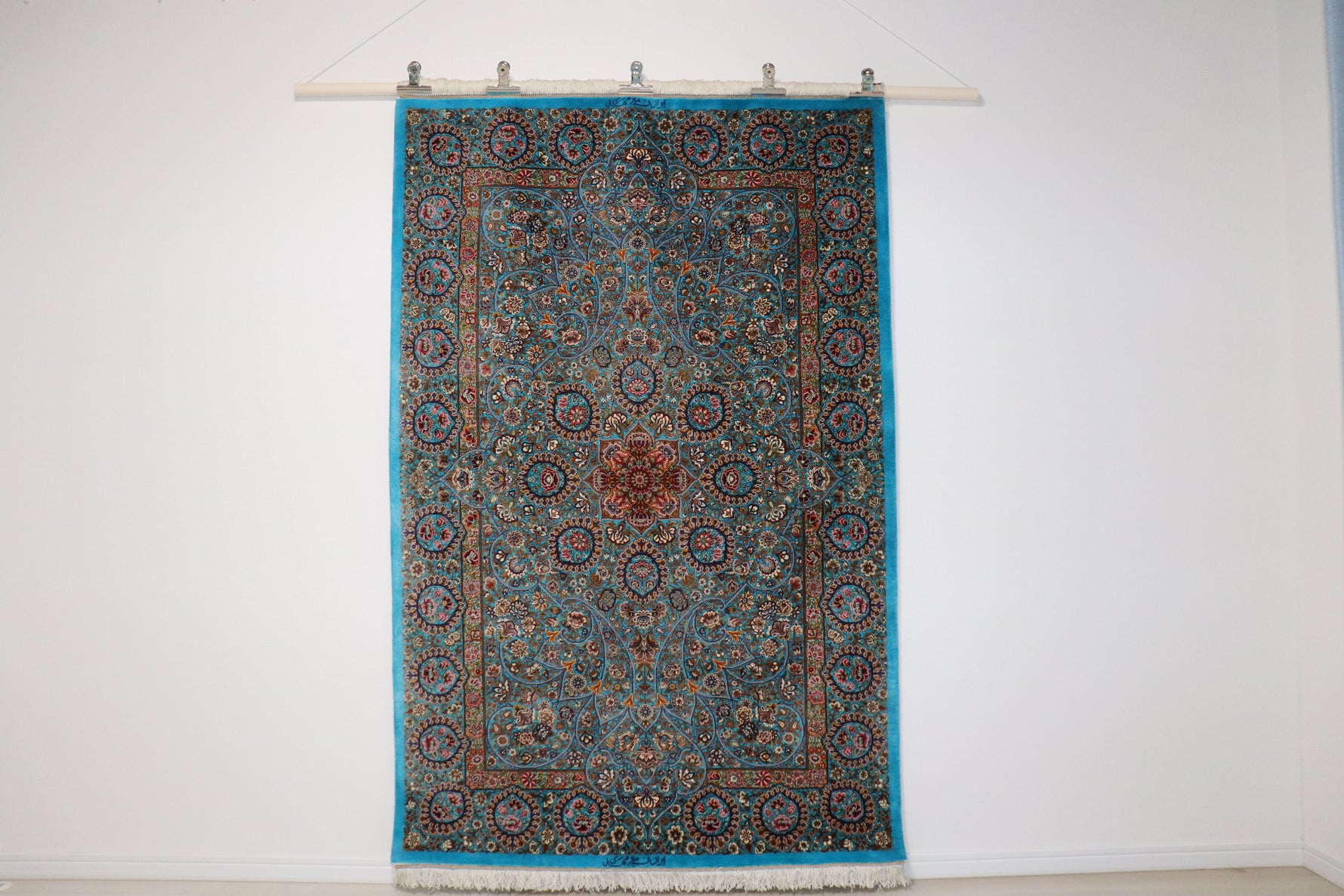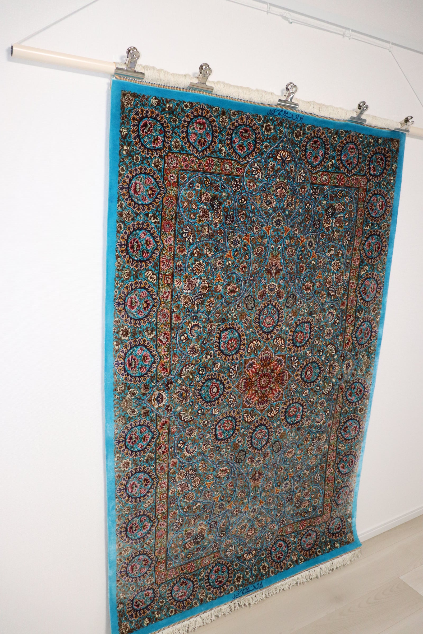 Persian carpet from Qom, 100% silk, Mirmehidi Atelier, the vase pattern and the blue-green color have a beautiful contrast