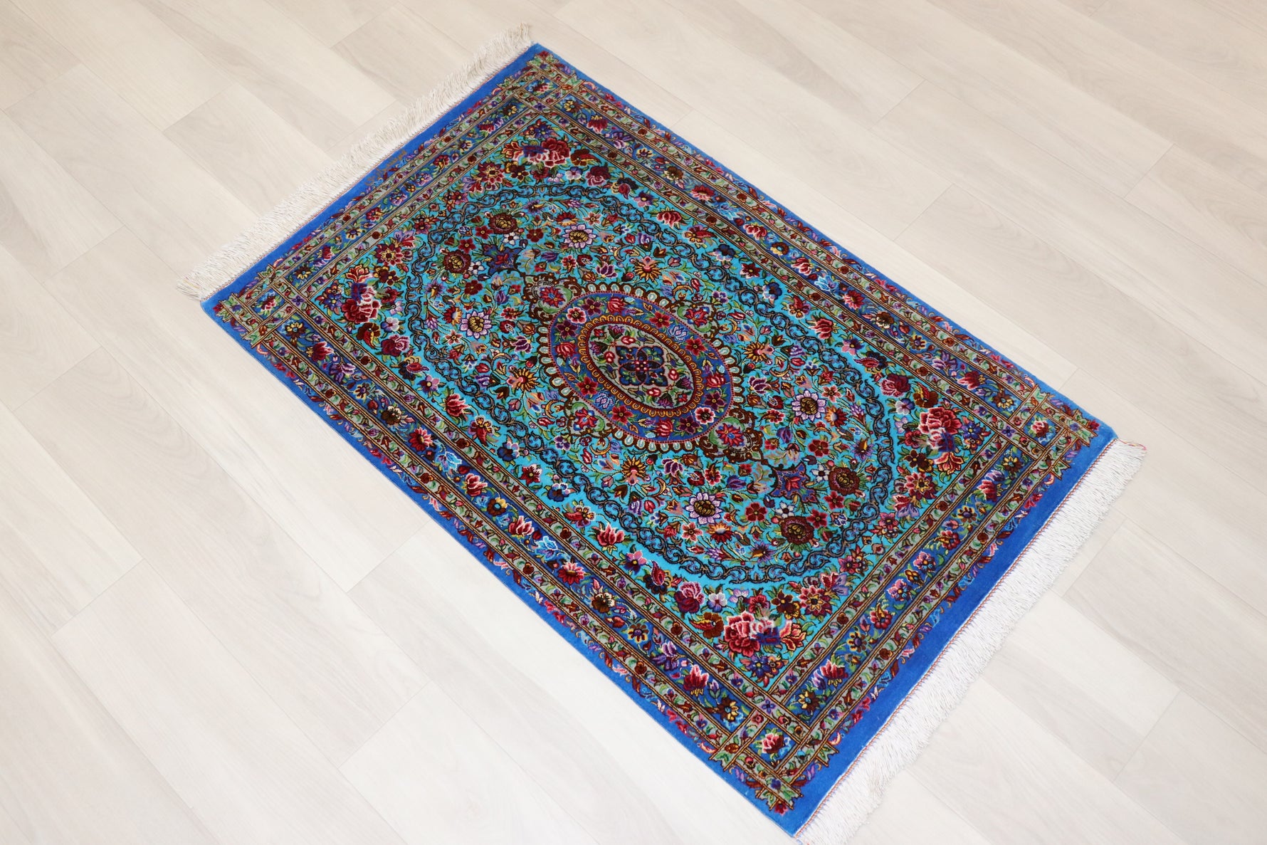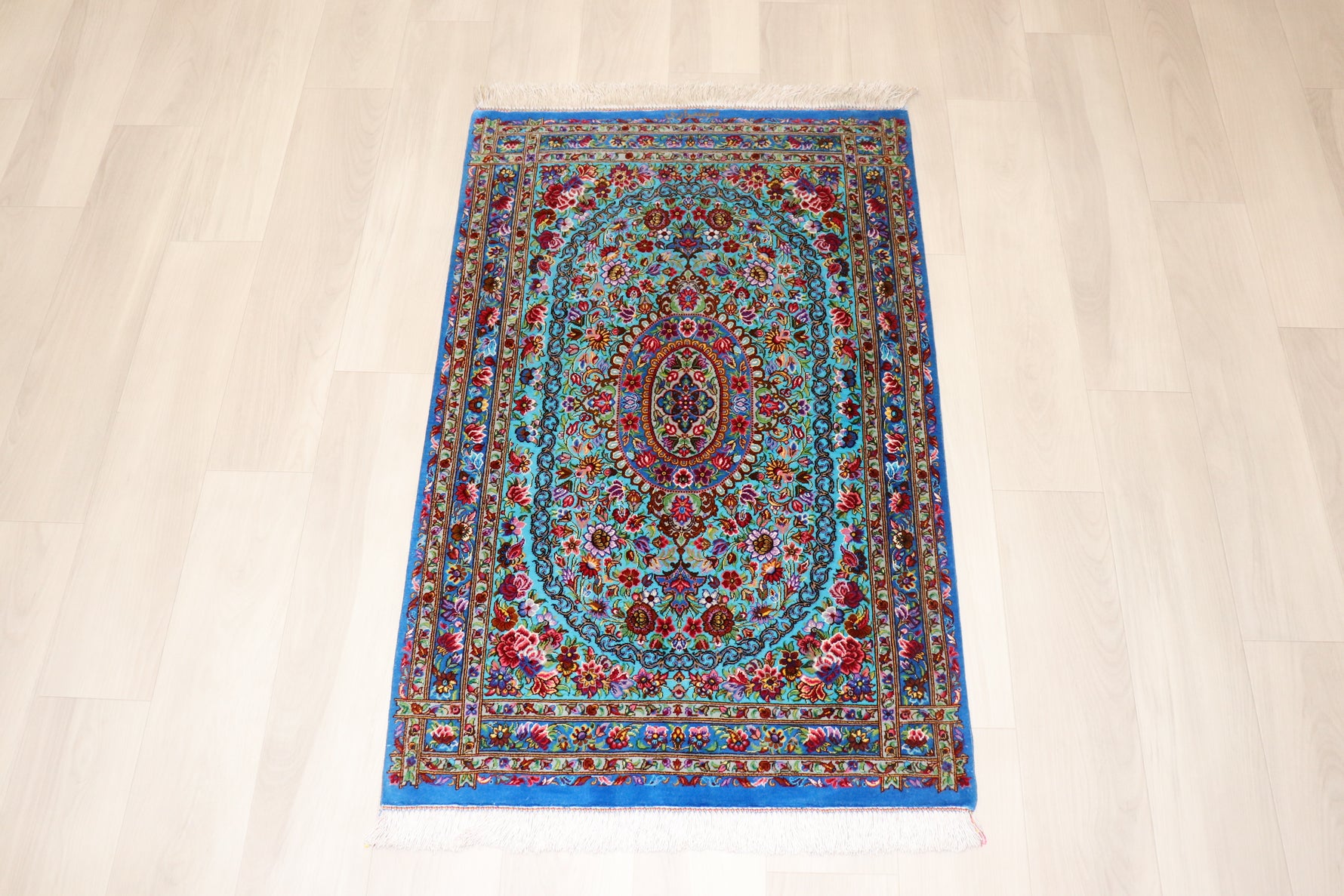 Persian carpet from Qom, 100% silk, Shirazi Studio "Blue Sky", Blooming Flowers, Entrance mat size 23002