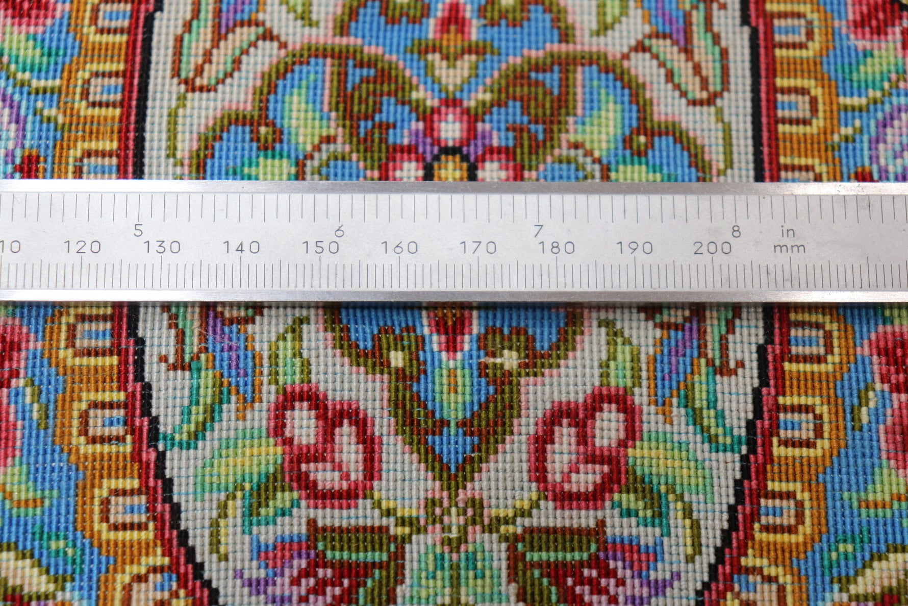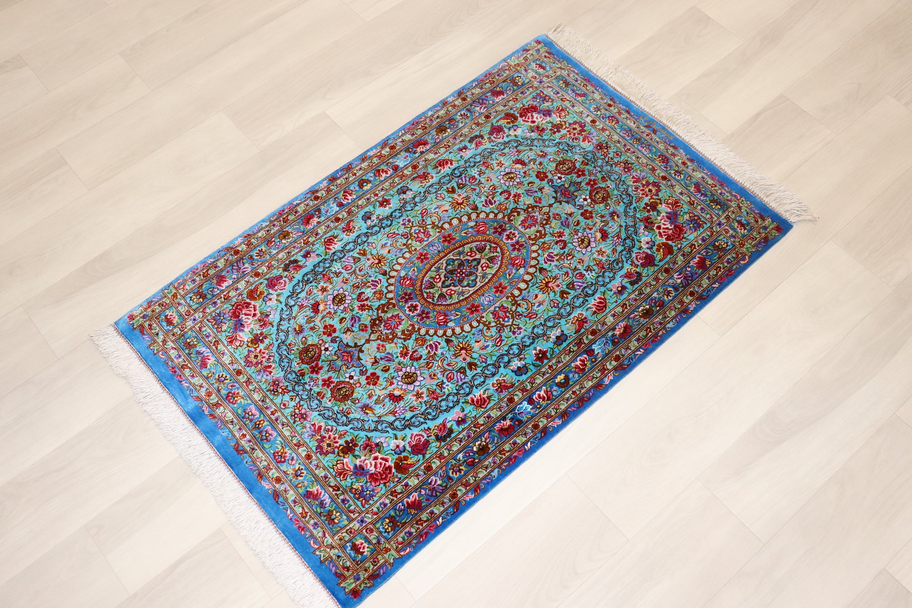 This 100% silk Persian carpet features a vibrant floral design on a pale blue field color. The central oval medallion forms the center of gravity of the design, while the floral patterns and intricate arabesque patterns surrounding it breathe life into the entire carpet. The blue borders are designed with overlapping ribbons at each corner, tightening the overall look while also adding a touch of sophistication.
