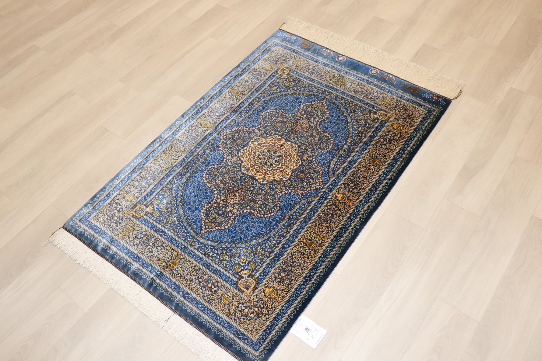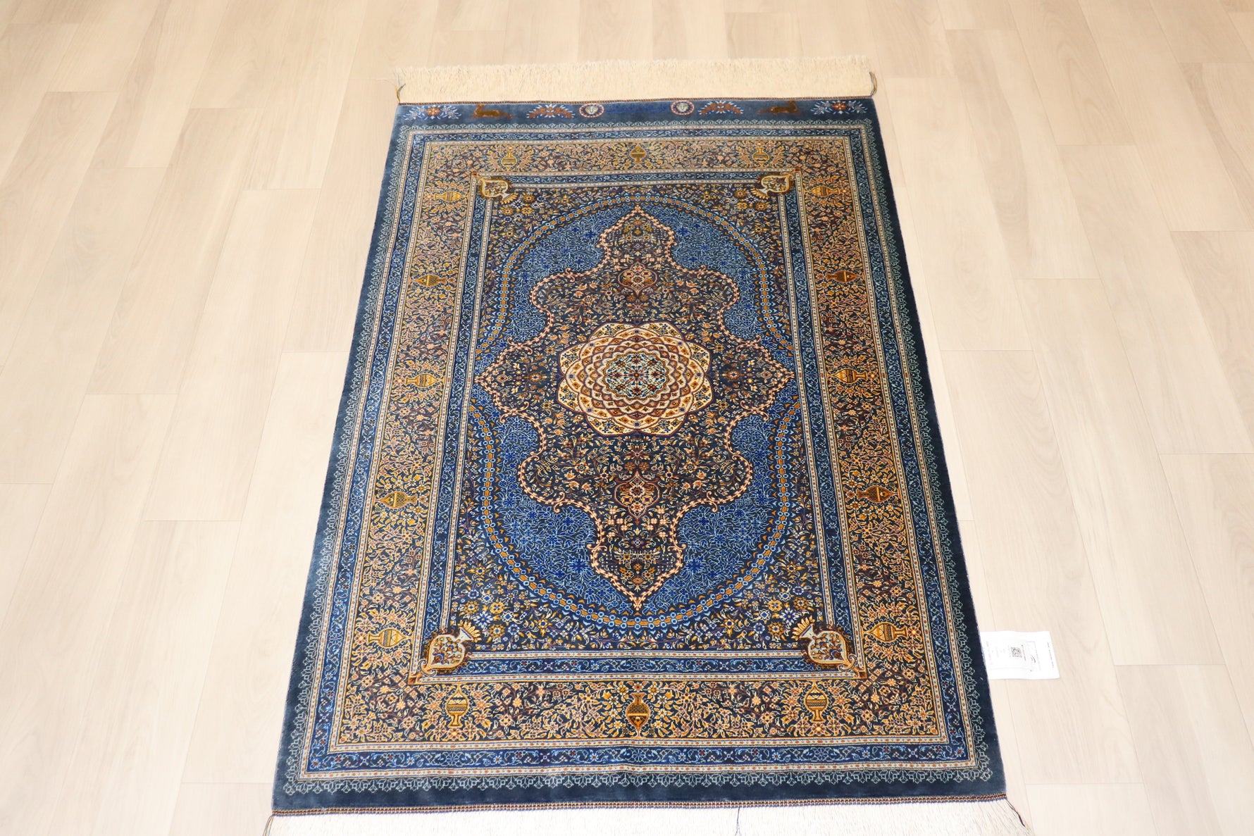 Persian carpet from Qom, 100% silk, made by Sedigyan workshop, deep blue x gold, entrance mat size