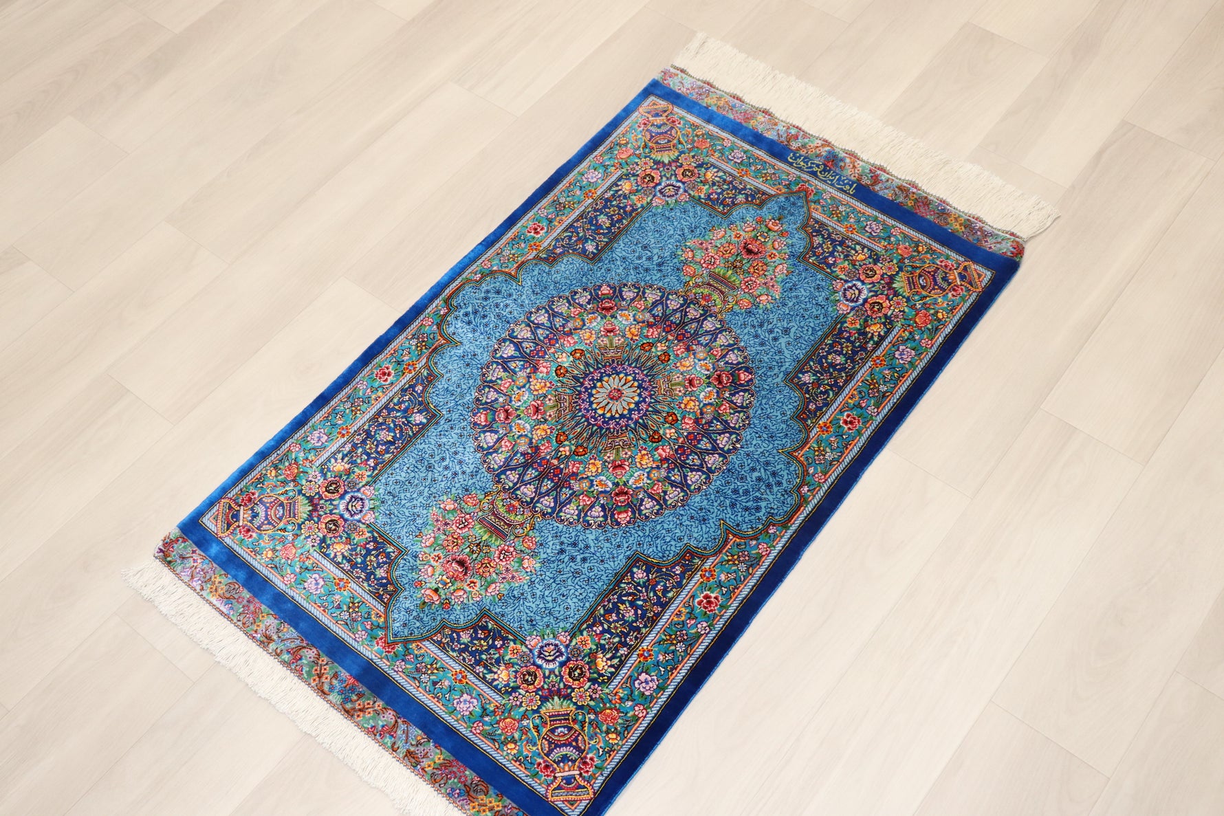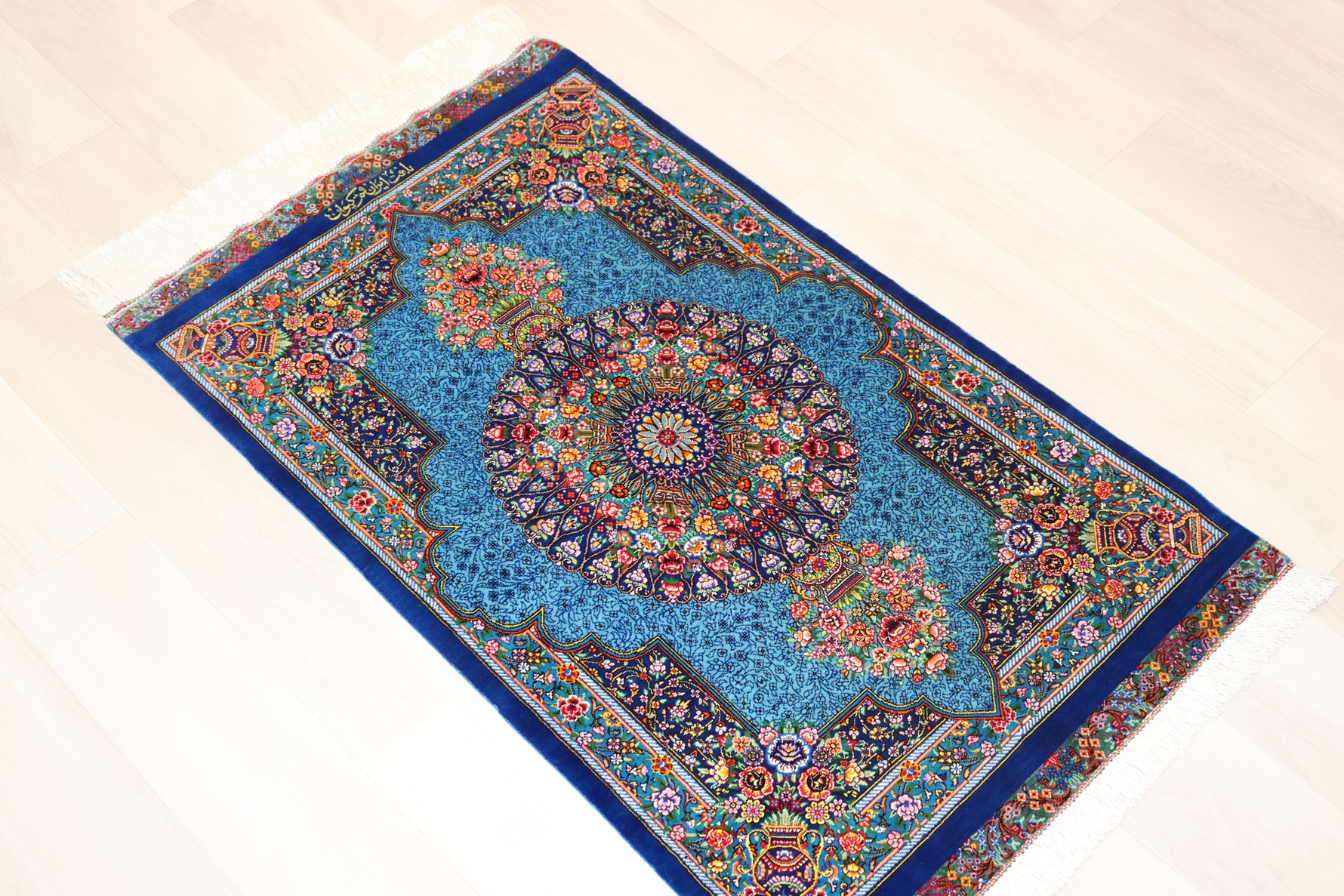 Persian carpet, 100% silk from Qom, Mirmehidi Atelier, the vibrant royal blue and flowers combine beautifully.
