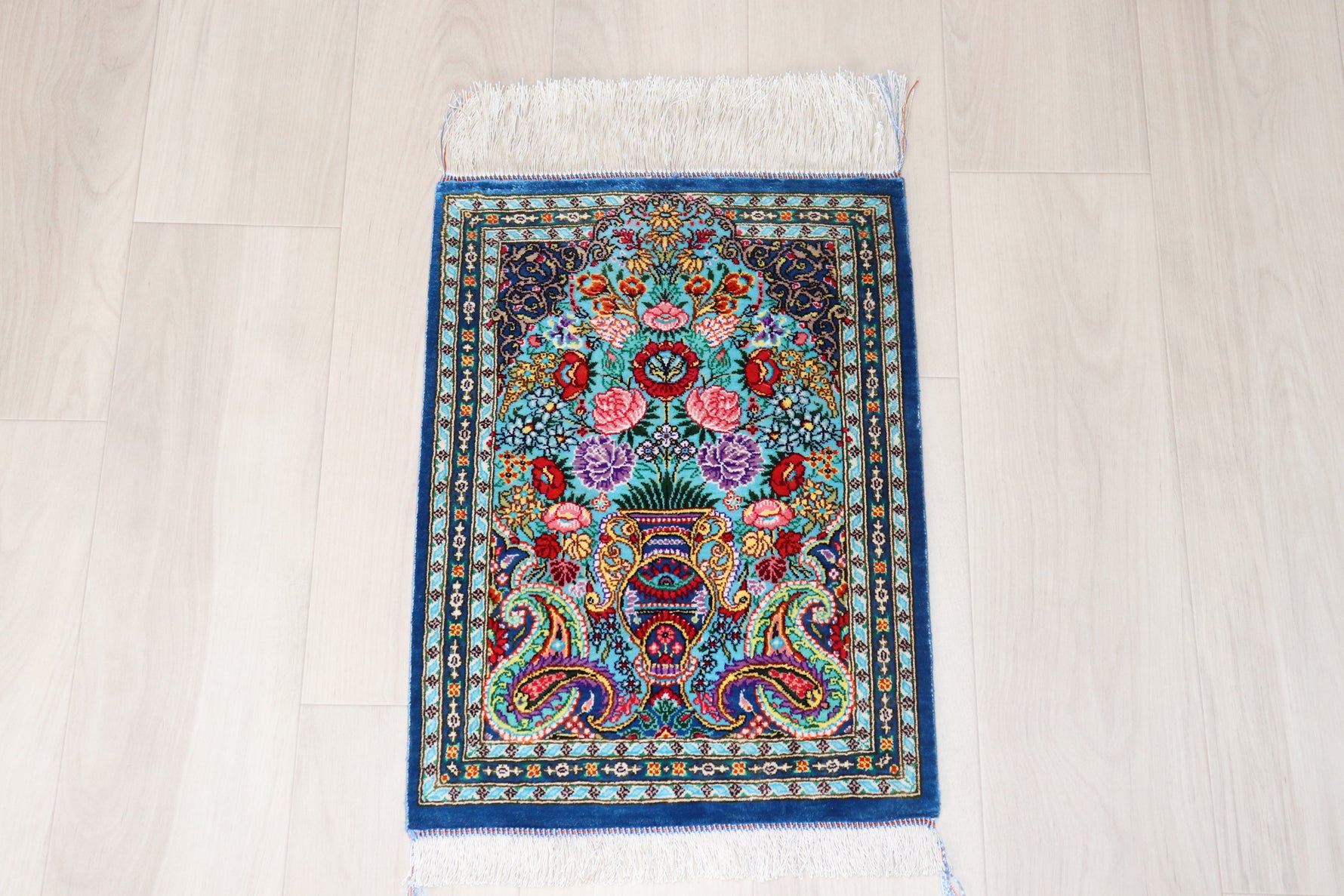 Persian carpet from Qom, 100% silk, Mirmehidi Atelier, the vase pattern and the blue-green color have a beautiful contrast