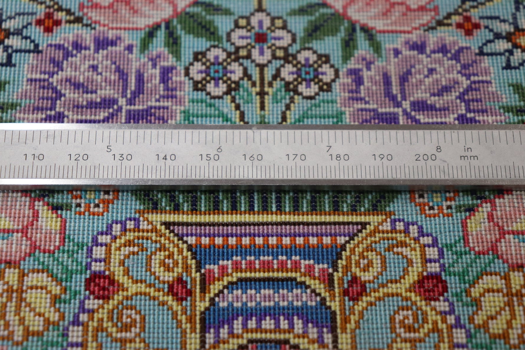 The motif of flowers overflowing from the vase in the center represents fertility and good fortune, and will add a special accent to your interior. The turquoise blue border color tightens up the overall design, creating a piece that is both gorgeous and elegant.