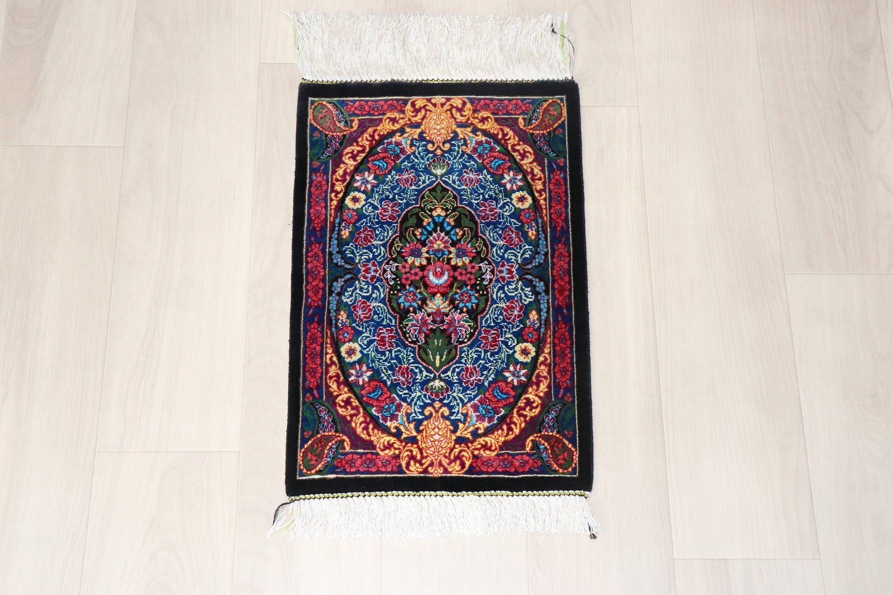 This is a luxury silk mini carpet that combines traditional Persian beauty with modern design sensibility.