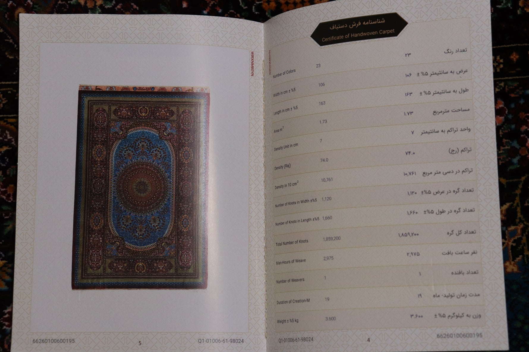 The design uses the Medallion and Goldan & Tranj motifs, which are very popular among Persian carpets, and is woven with delicate and elegant patterns. It is characterized by its high density of 1.4 million knots per square meter and a total of 1.8 million knots, and its elaborate finish. It took 19 months to complete, and as the production period shows, it is a very time-consuming item.
