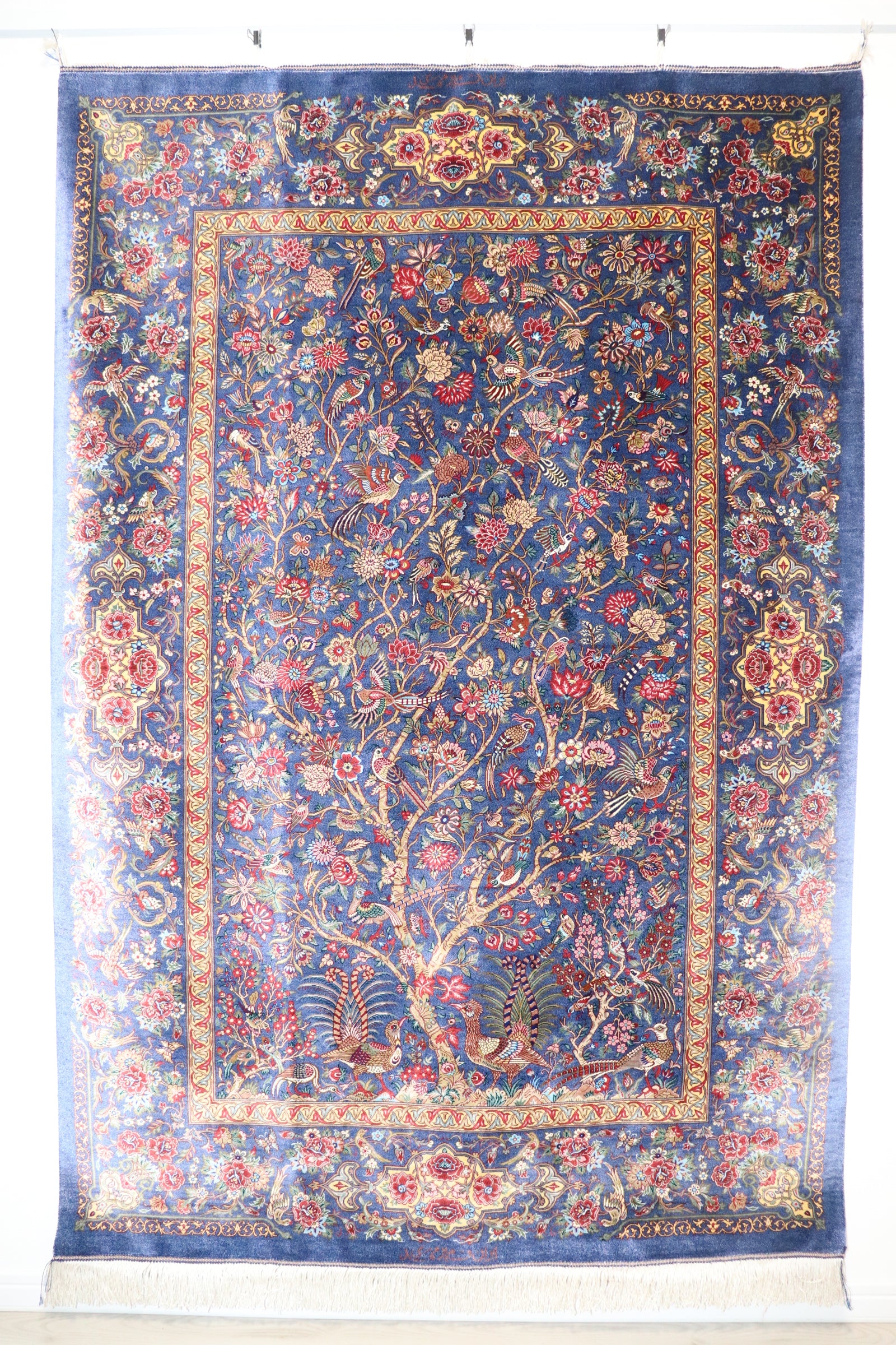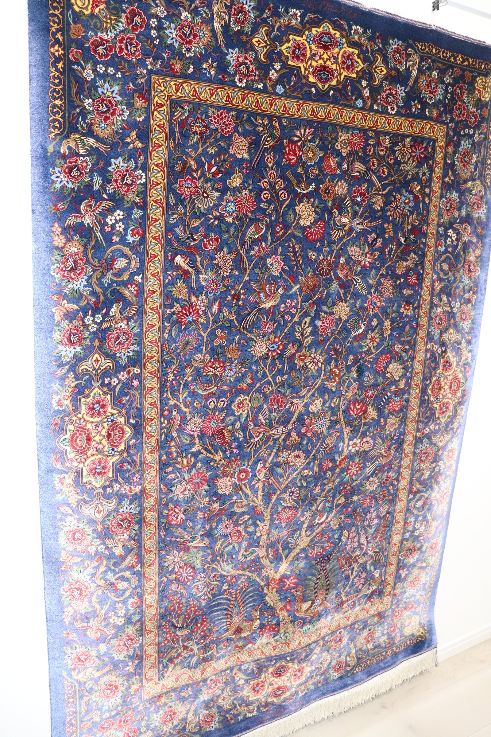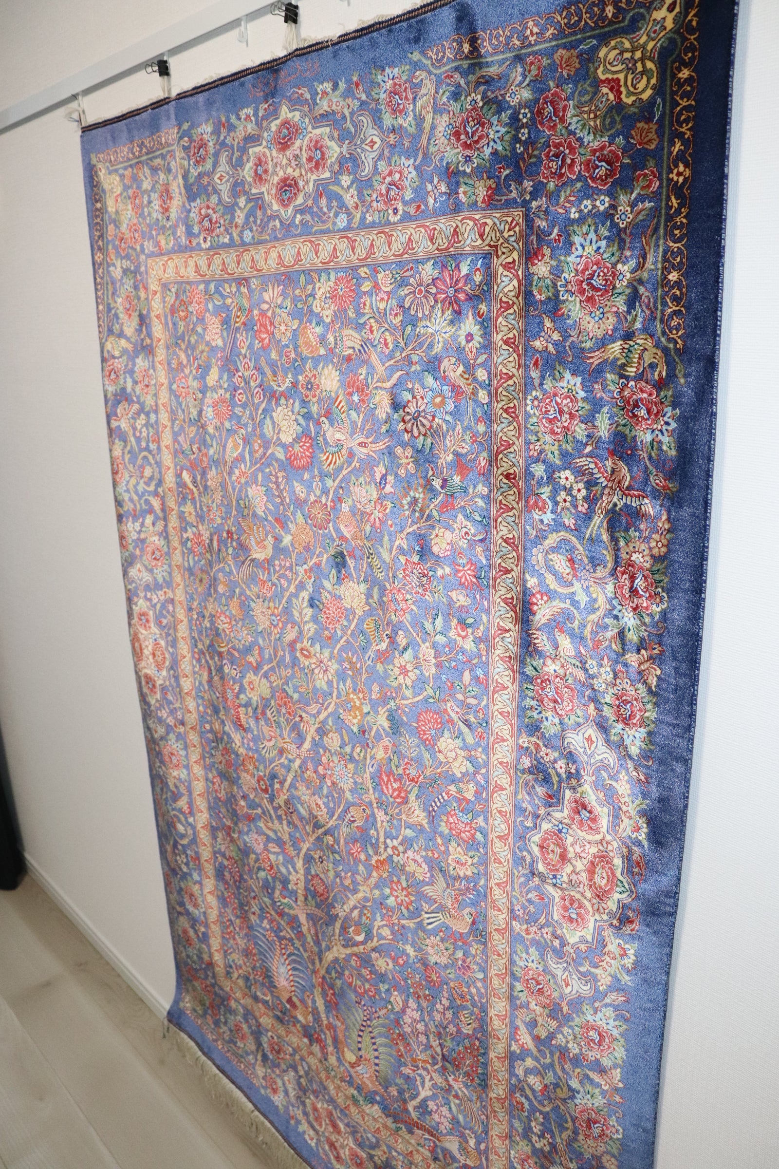 The field color is a mix of blue and sky blue, and this carpet is woven in vivid colors, using several times more colors than other Qom silk carpets. The result is a highly artistic and eye-catching beautiful color scheme. The realistically depicted "Tree of Life" features 10 types of flowers, including roses, dahlias, and jasmine, and a wide variety of birds flocking together. Taking advantage of the texture of the silk, the flowers and birds are expressed as if they stand out in three dimensions.