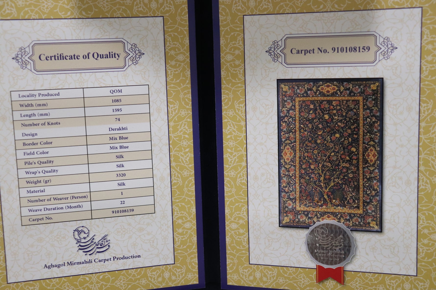This silk Persian carpet beautifully depicts the "Tree of Life," a traditional Persian carpet motif. The Tree of Life, which appears in tribal rituals and myths around the world and symbolizes longevity and prosperity, is also called "Drakhti" in Persian and "Tree of Life" in English. For people living in arid regions, this motif symbolizes an oasis, the source of life, where flowers and animals gather, depicting a mystical place like paradise.