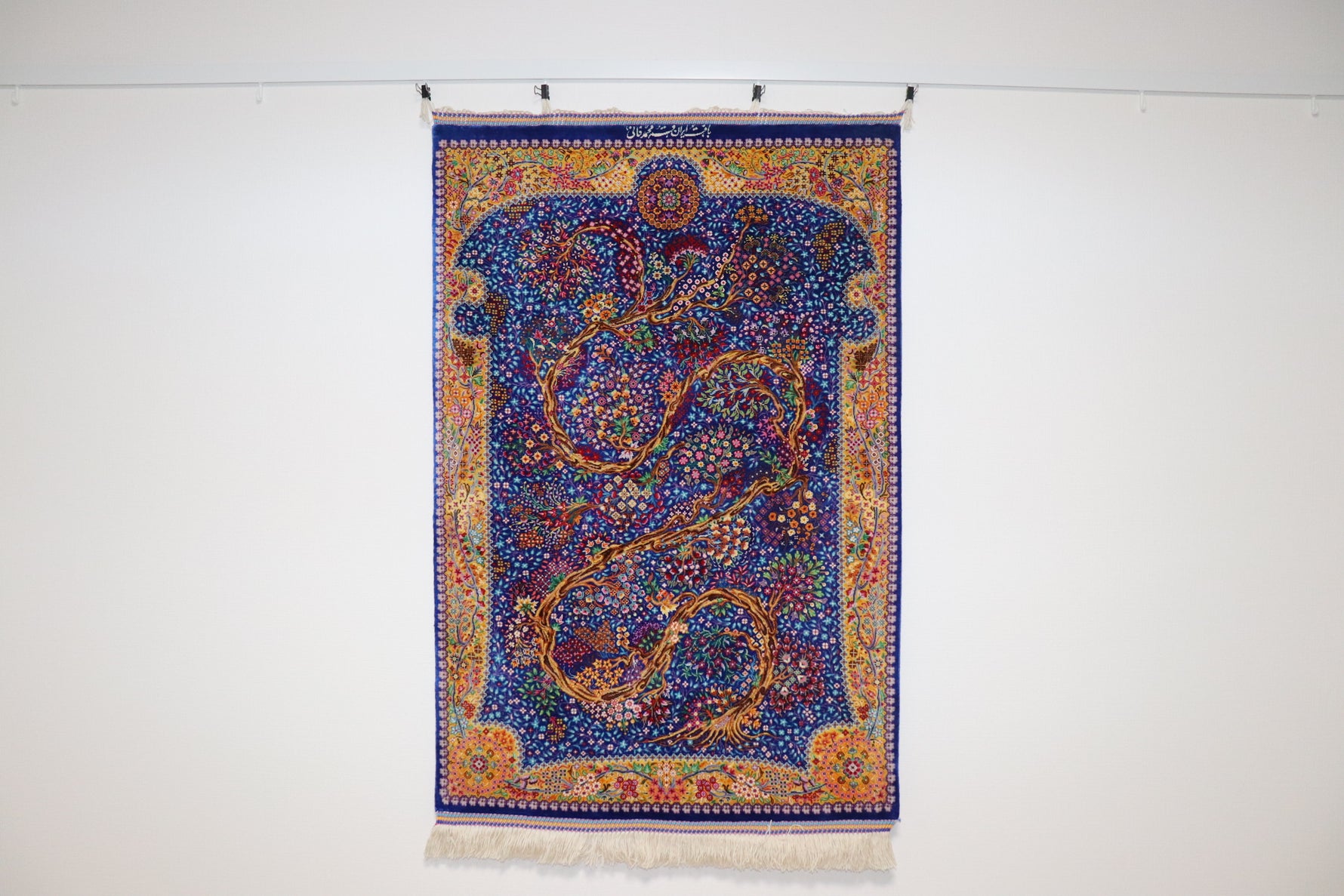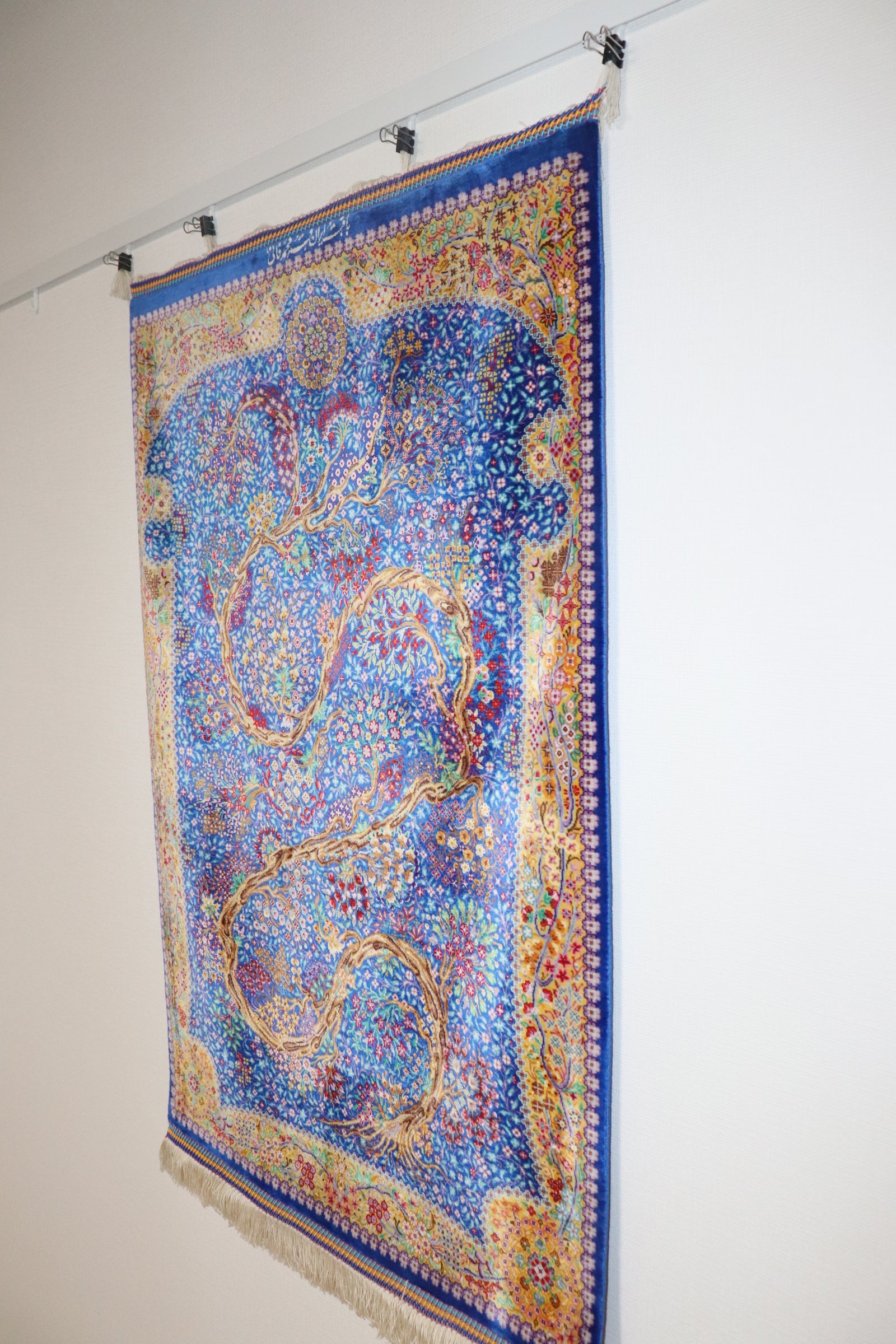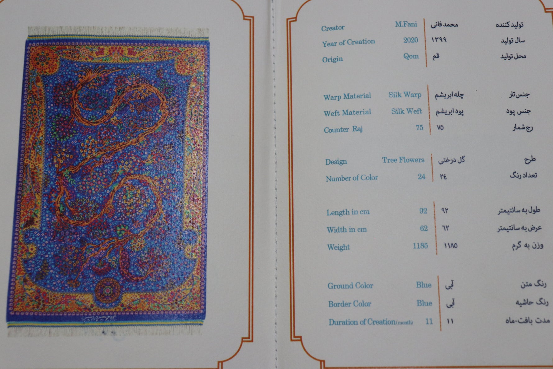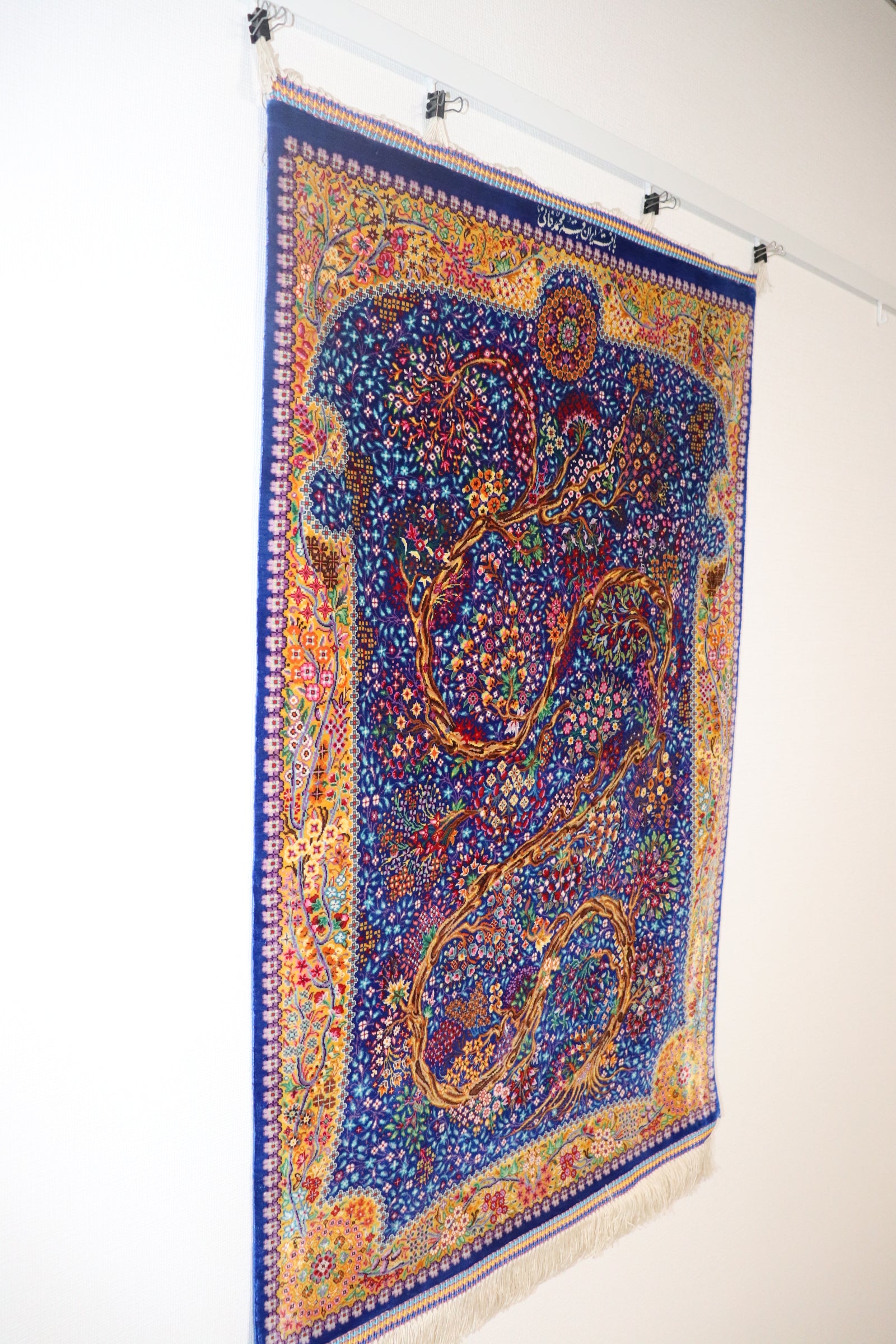 This carpet is a 100% hand-woven Persian carpet made with the finest silk from Fanny Kobo. It features a beautiful fusion of the Tree of Life design and a medallion pattern, giving the space a sense of the blessings of nature.