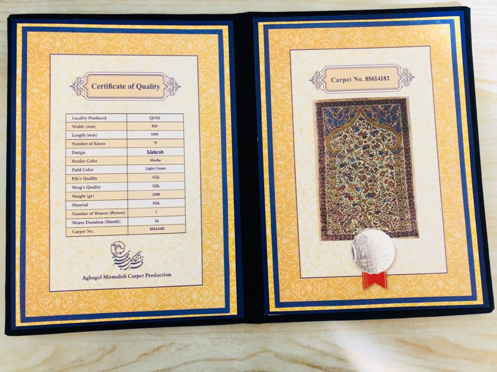 ミルメヒディ工房はクム産シルク絨毯の生産に於いて創生期からの老舗工房で、アラブ諸国の王族をはじめ世界のセレブ御用達の有名工房です。使用されているシルクの質も厳選された最高品質の絹を使用しており、光沢、肌触り、柔らかさは最高です。