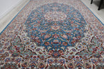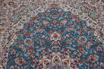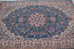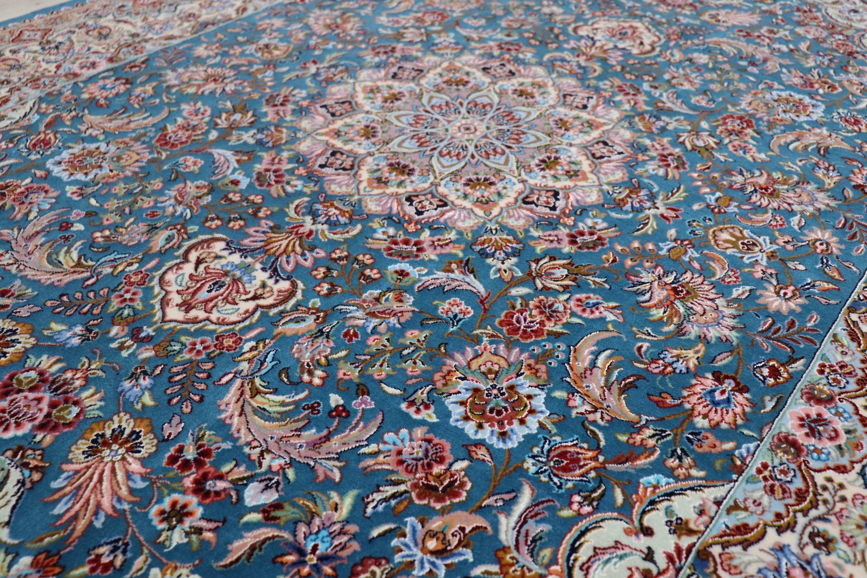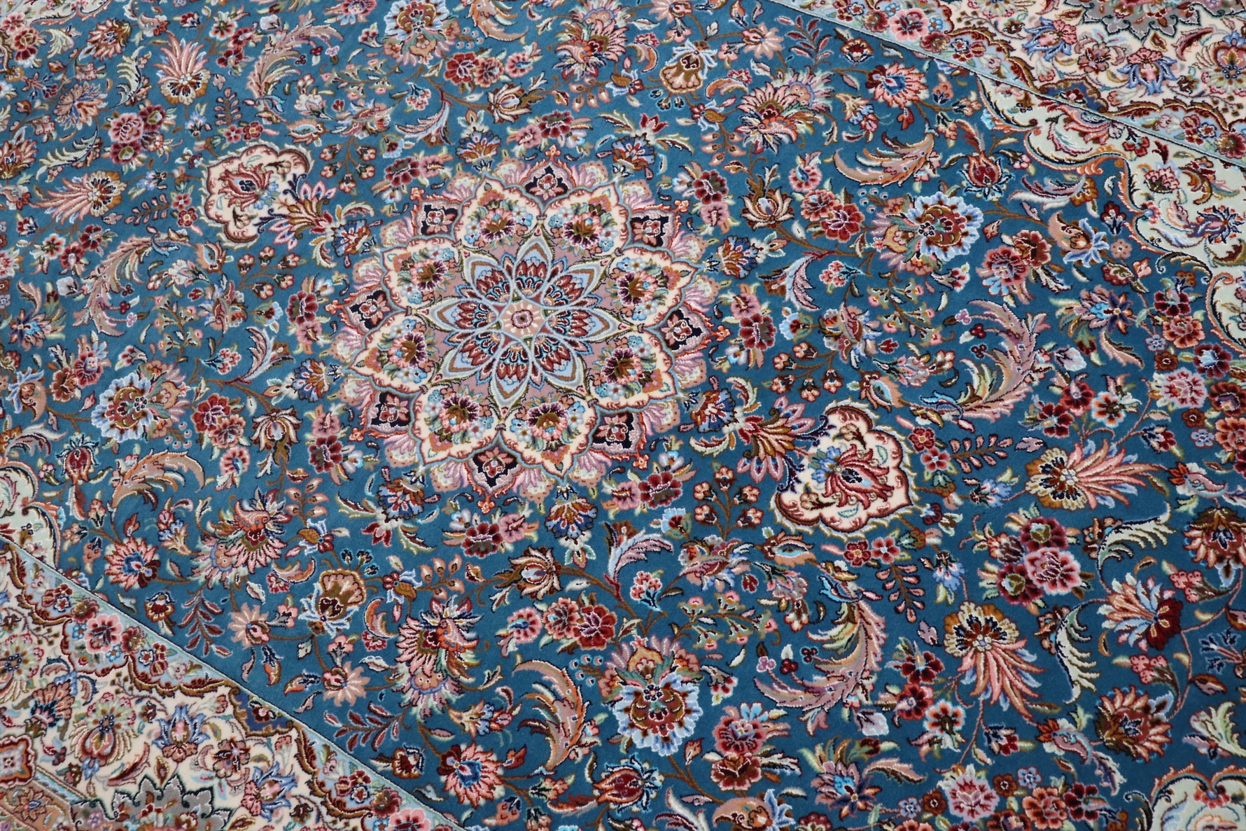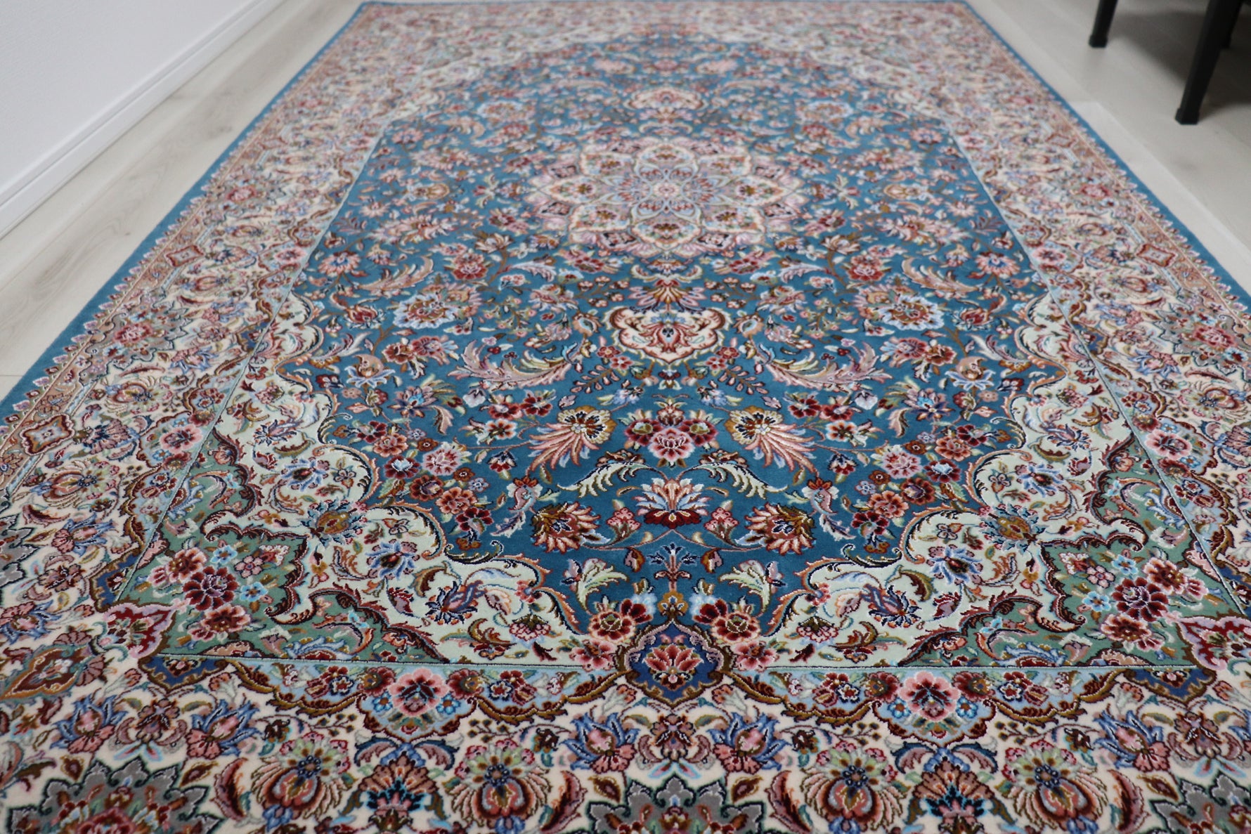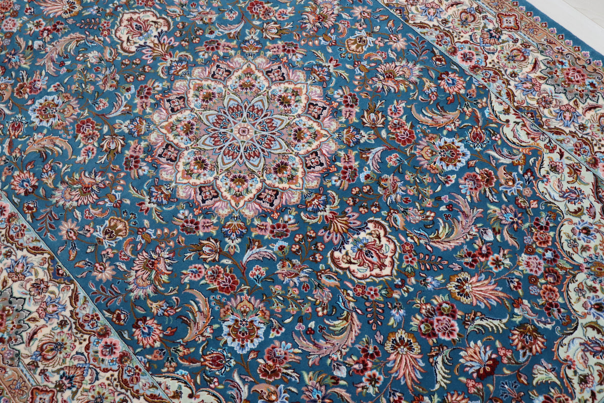 ■デザイン:建築のタイルを映した「天上の青」 この作品の最大の魅力は、吸い込まれるような「青(ブルー)」の美しさです。 これは、イスファハーンの象徴である「イマーム広場」のモスクに使われている、鮮やかなタイルの色(ペルシャン・ブルー)を彷彿とさせます。 フィールドには、イスファハーン伝統の「シャー・アッバース文様(花唐草)」が優雅に舞い、完璧な左右対称(シンメトリー)のデザインが、見る人の心に秩序と安らぎをもたらします。