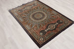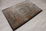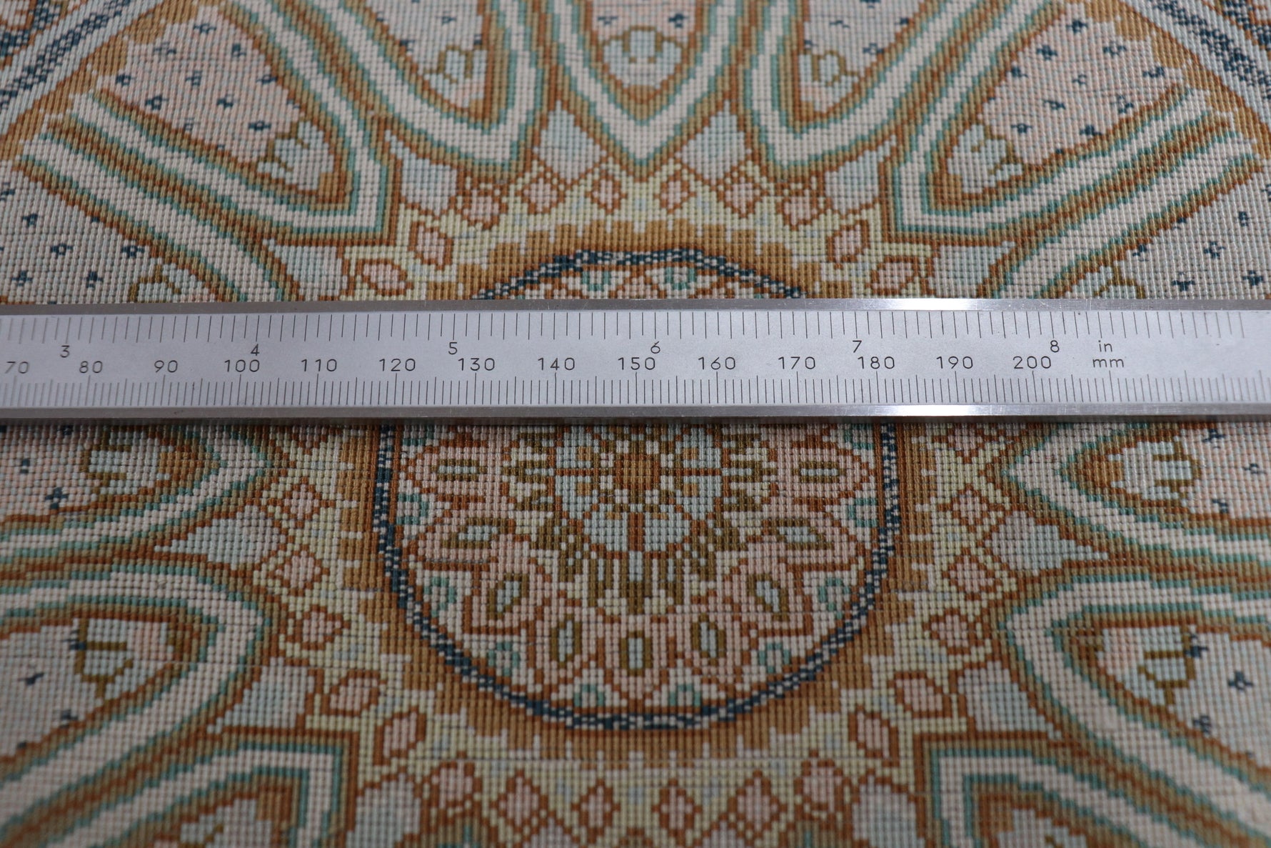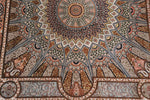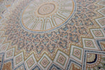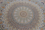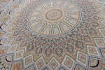 ■デザインの真髄:計算し尽くされた「Gonbadi(ドーム文様)」 この作品のテーマは、ペルシャ建築のモスクの天井を見上げた時の光景、「Gonbadi(ゴンバディー/ドーム文様)」です。 花柄のような有機的な曲線とは異なり、このデザインは「完璧な数学的規律」によって形成されています。 中心から放射状に広がるライン、複雑に重なり合う幾何学模様。これらが一切の歪みなく、完全なシンメトリー(左右対称)を描いていること自体が、この絨毯の品質の高さを雄弁に物語っています。