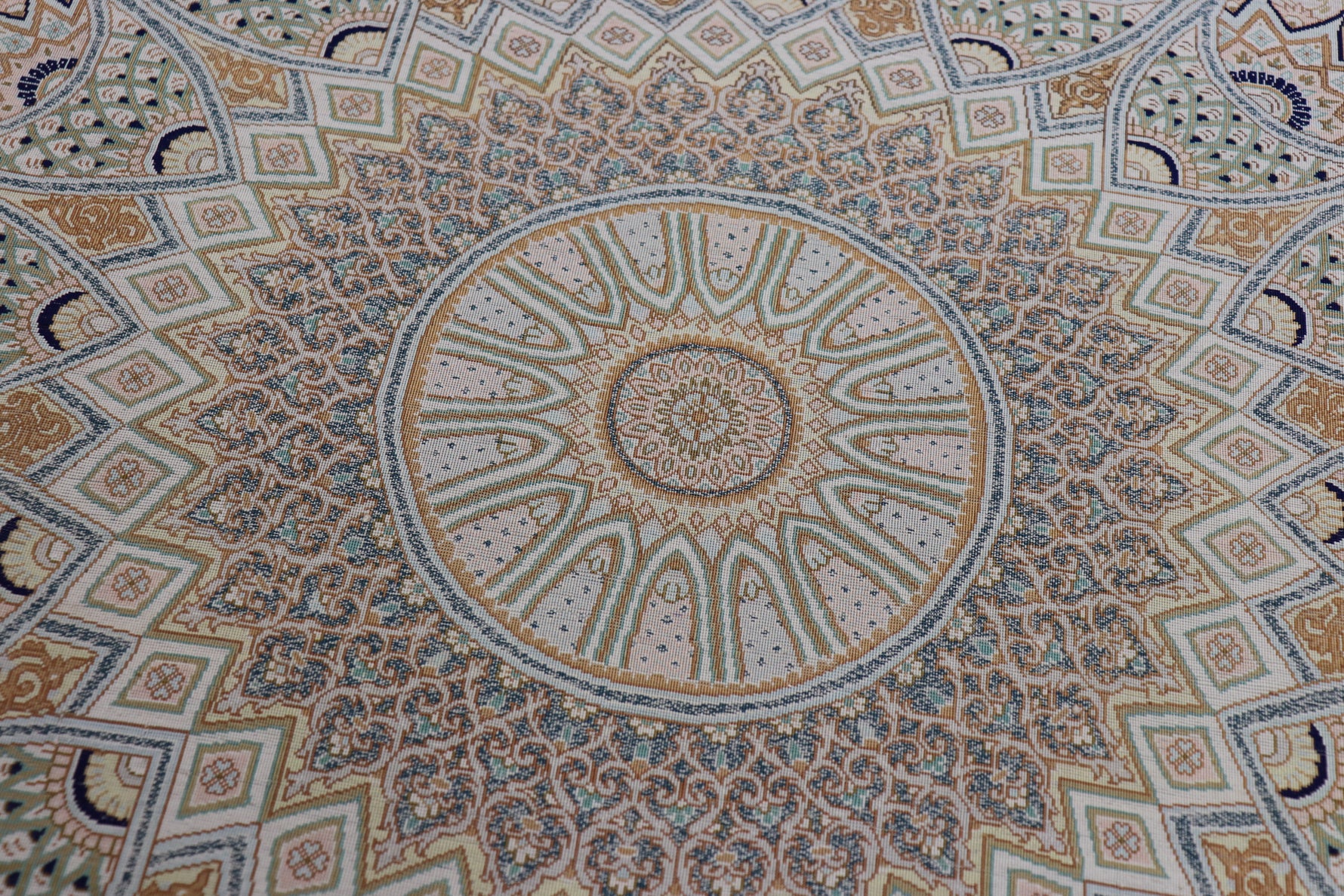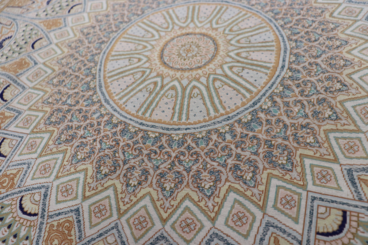 ■密度が証明する「立体感(3D)」 。 この数字こそが、この作品の凄みを証明する唯一にして最大の根拠です。 通常なら潰れてしまうような微細なラインも、驚くほどシャープに描かれています。 その結果、平面の織物であるはずなのに、ドームの天井が本当にくぼんでいるかのような「圧倒的な立体感(3D効果)」が生まれ、見る者の視線を奥へ奥へと引き込みます。