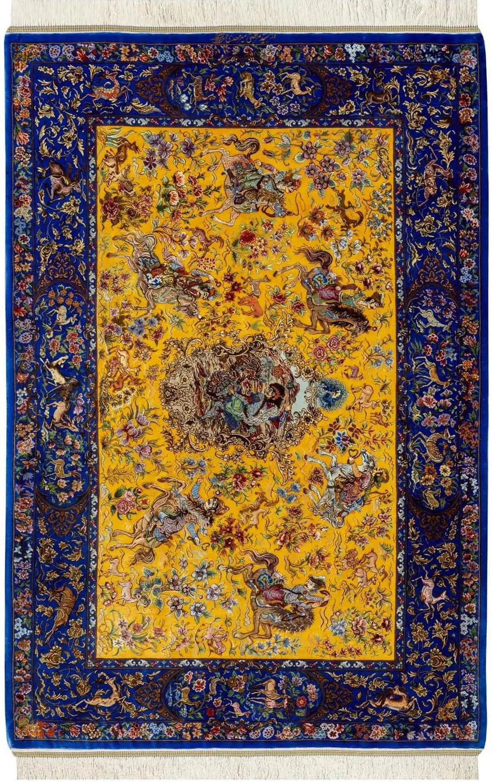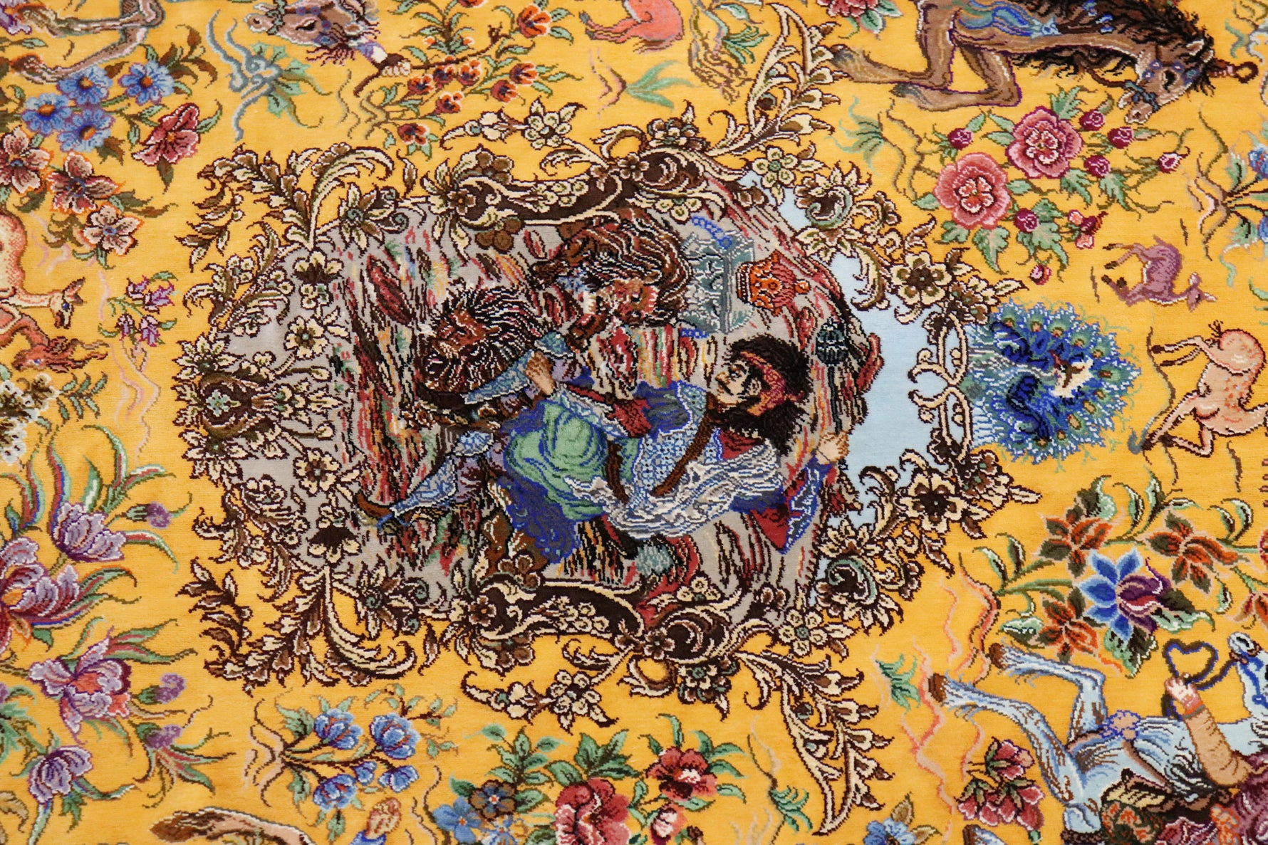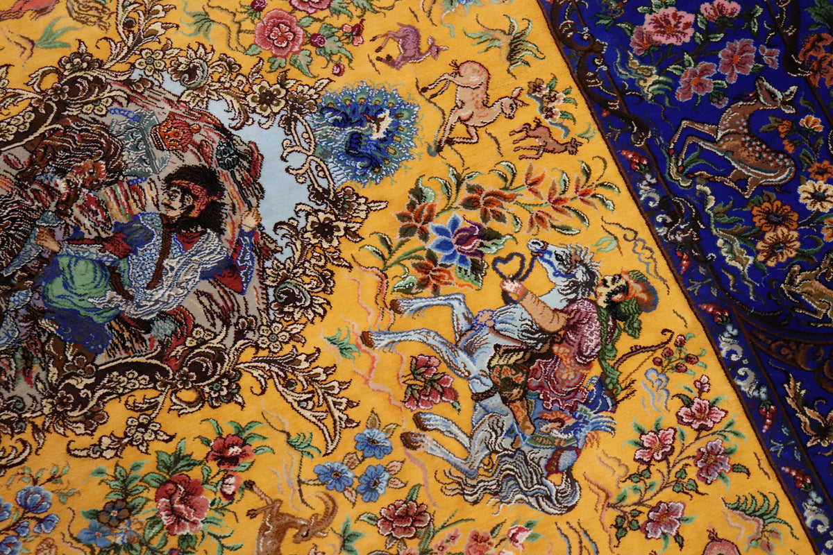 クム産シルクの最高峰、緻密な絵画表現で世界的な評価を得る「ミルメヒディ(Mirmehdi)工房」による、圧倒的な迫力を放つ一枚です。
