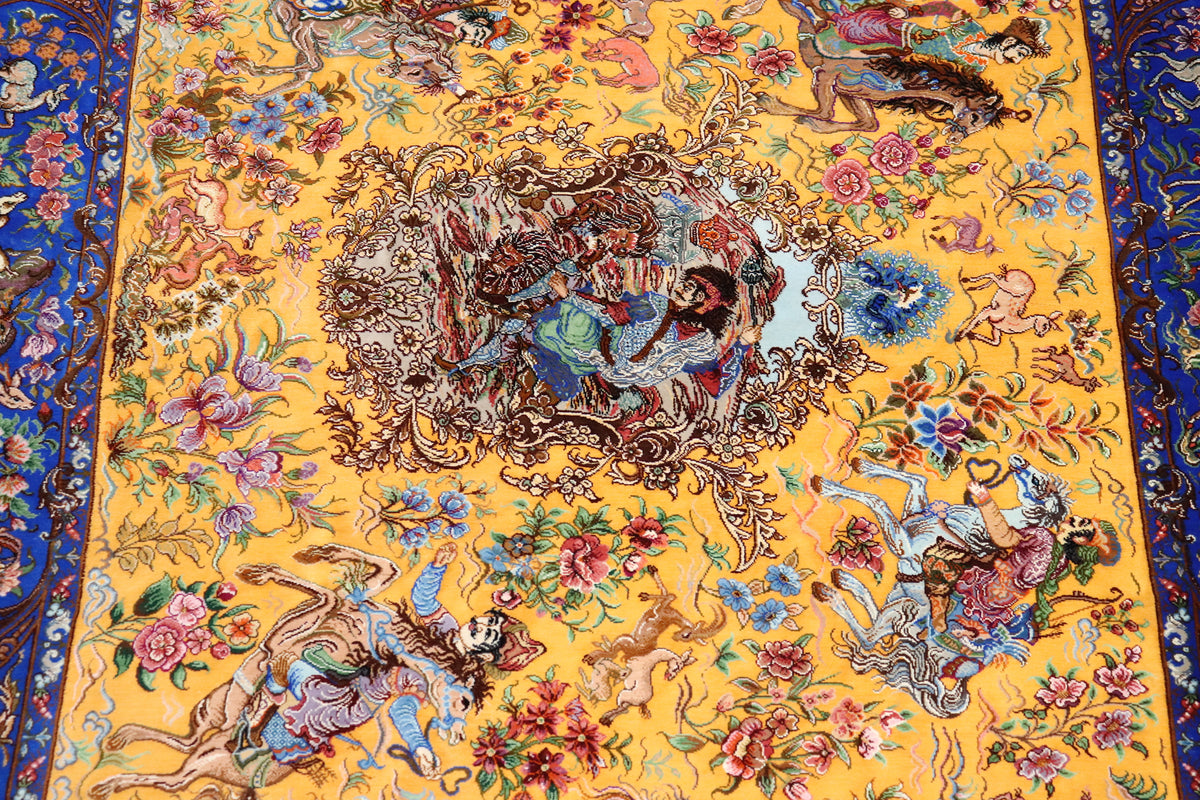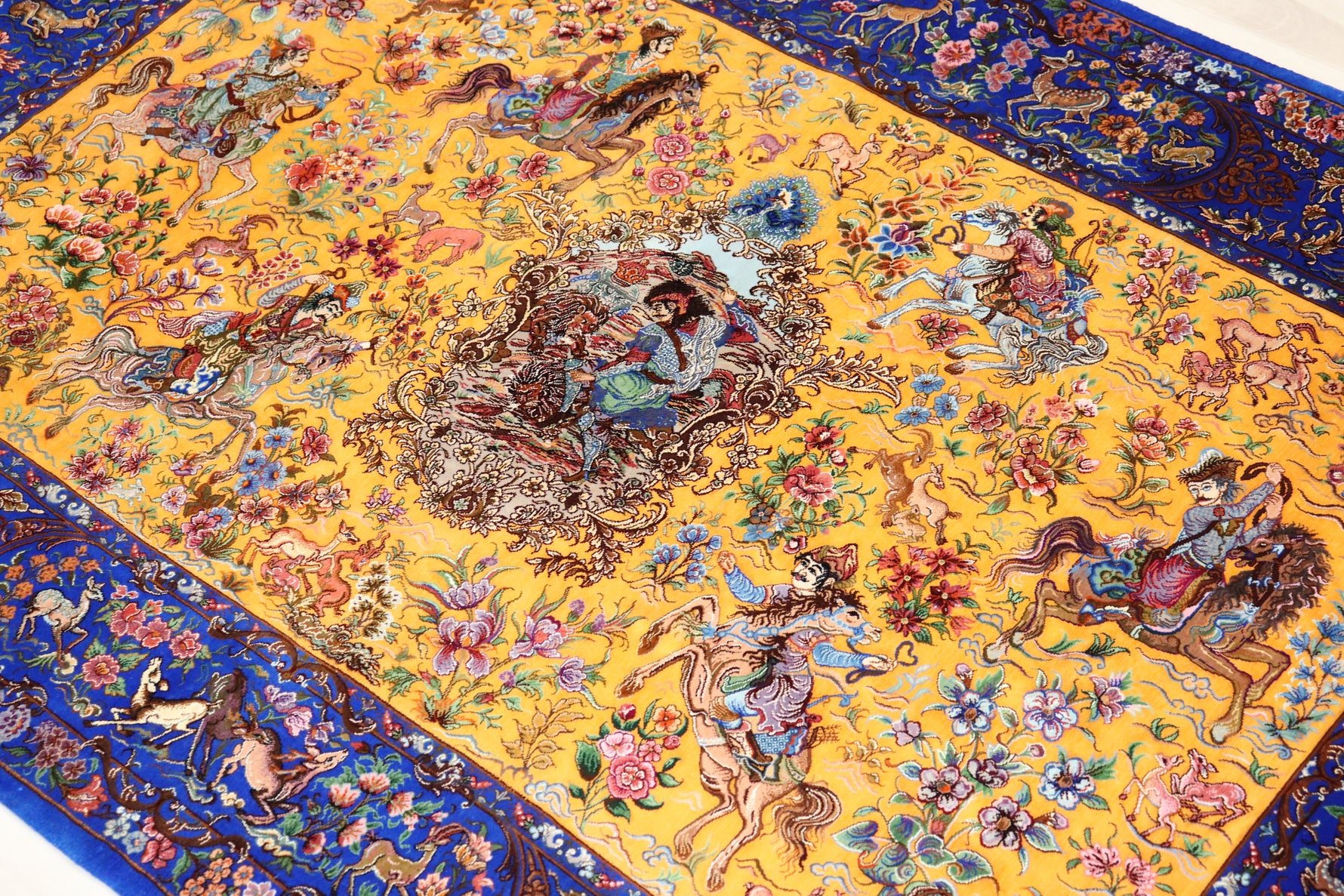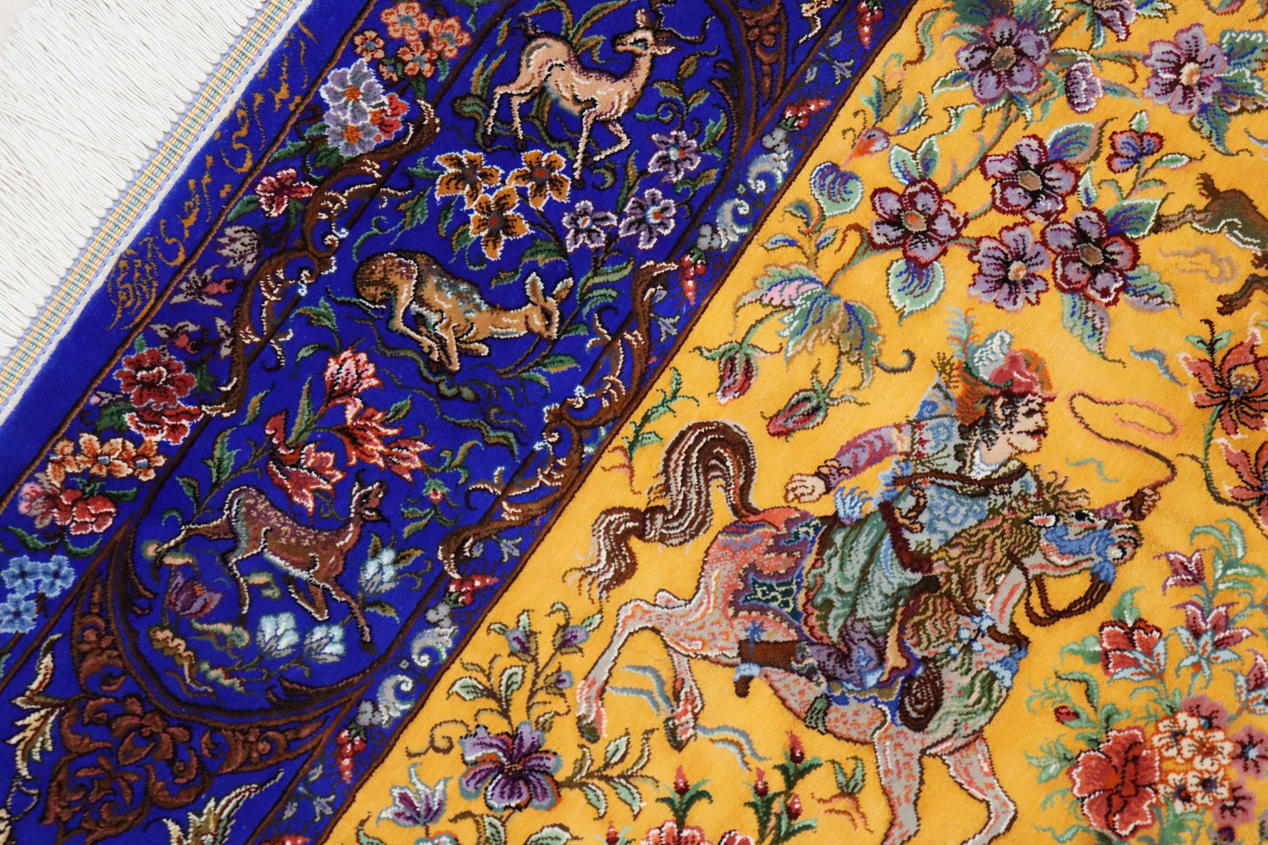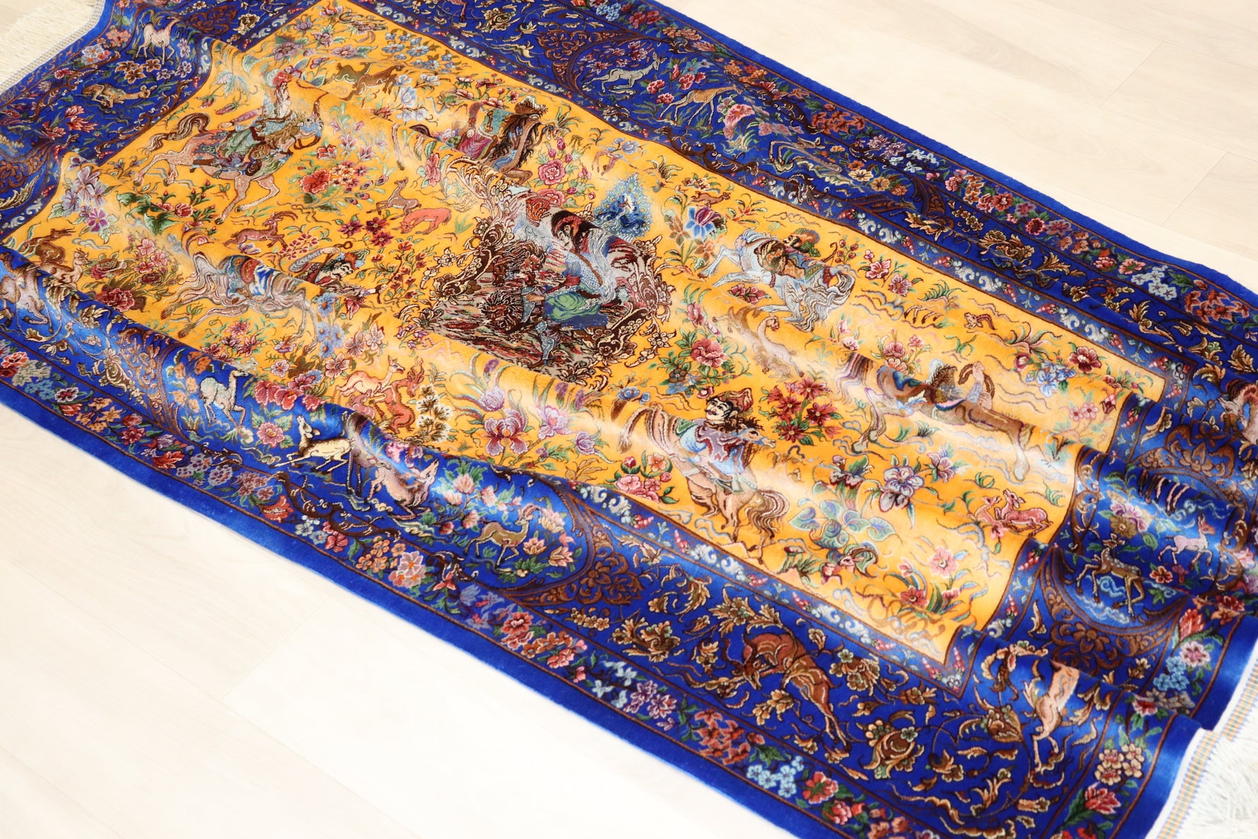 1平方メートルあたり約120万ノットという驚異的な高密度織りにより、騎馬人物の凛々しい表情、逃げ惑う鹿やガゼルの筋肉の動き、着衣の繊細な紋様に至るまでが克明に表現されています。 それはもはや敷物という枠を超え、ペルシャの伝統工芸「細密画(ミニアチュール)」そのもの。最高級シルクの光沢が加わることで、見る角度によって勇壮な物語が立体的に浮かび上がります。