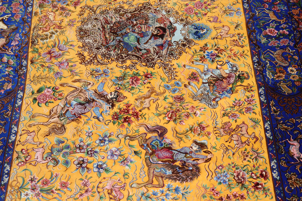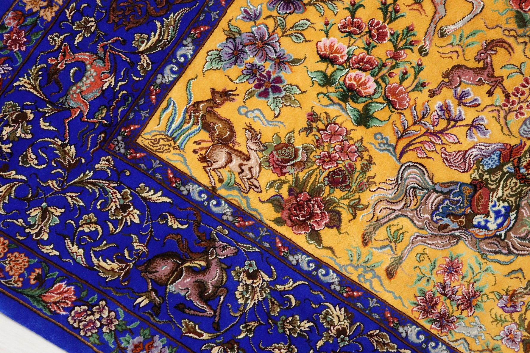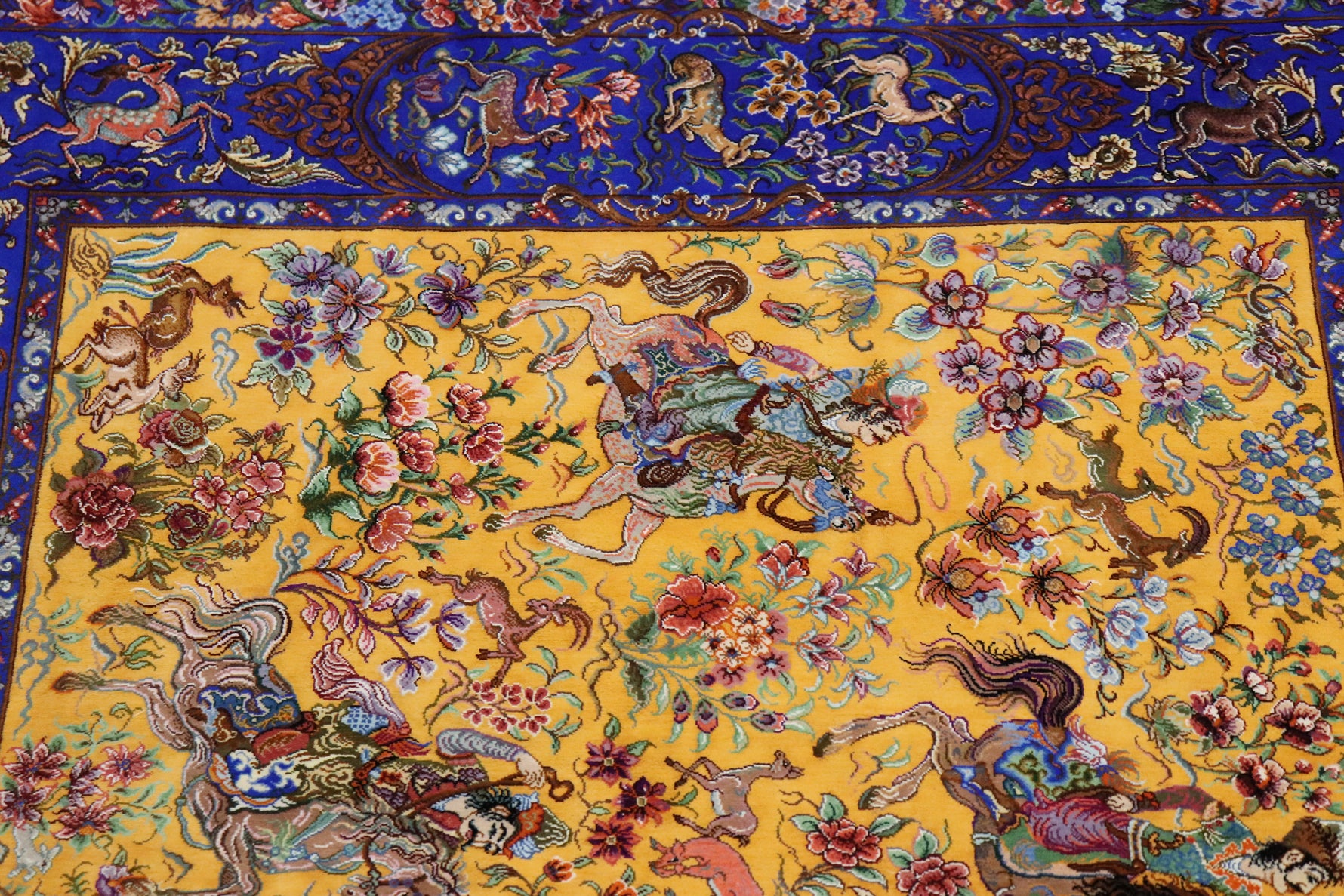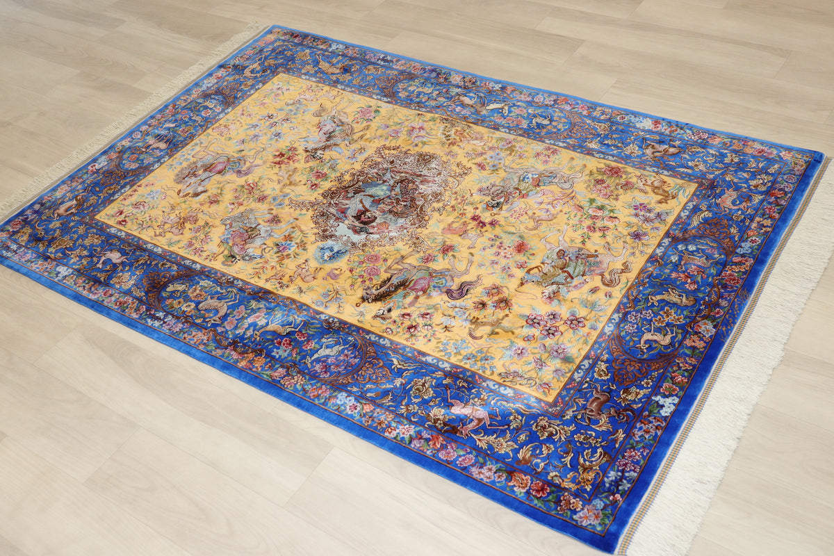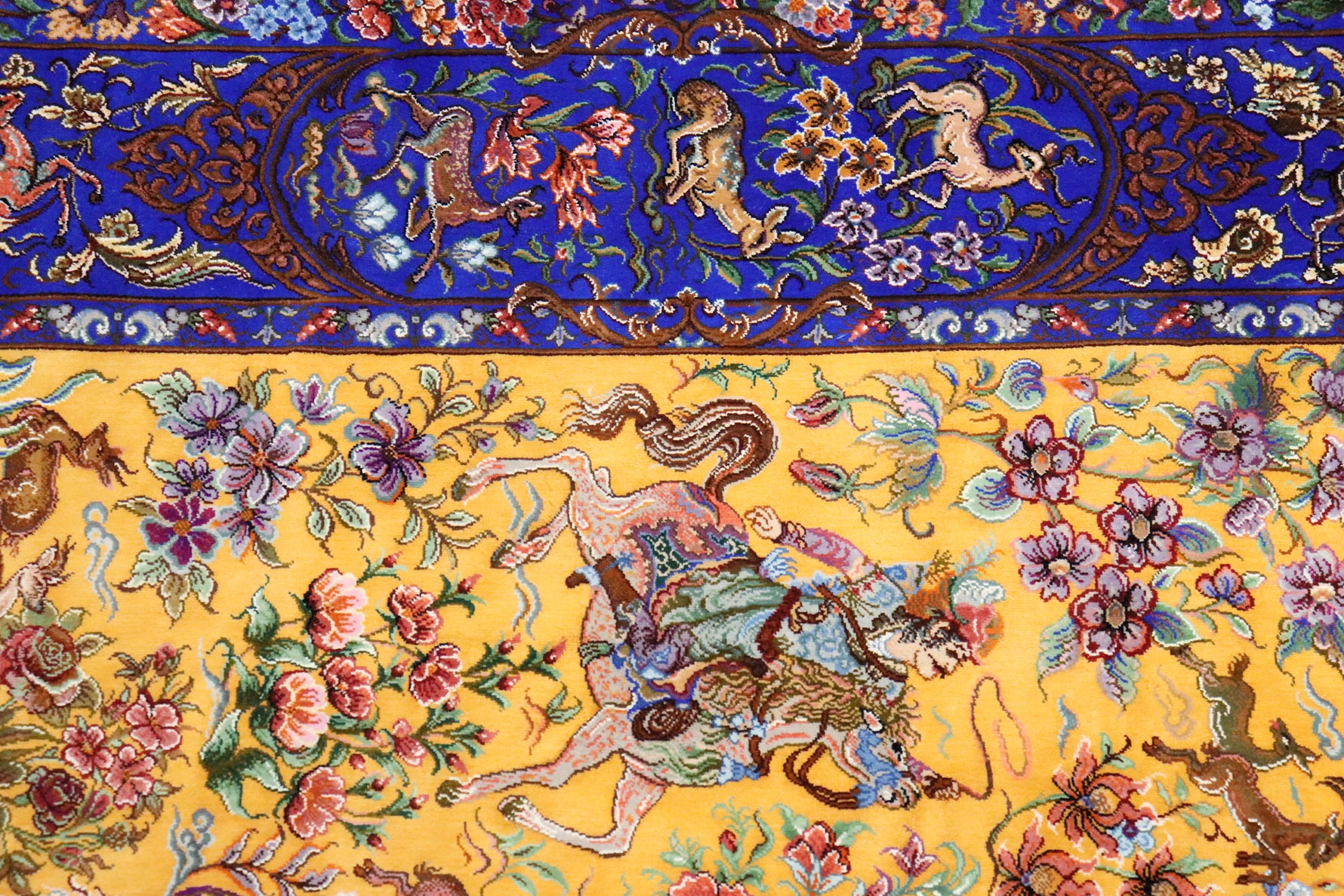 1平方メートルあたり約120万ノットという驚異的な高密度織りにより、騎馬人物の凛々しい表情、逃げ惑う鹿やガゼルの筋肉の動き、着衣の繊細な紋様に至るまでが克明に表現されています。 それはもはや敷物という枠を超え、ペルシャの伝統工芸「細密画(ミニアチュール)」そのもの。最高級シルクの光沢が加わることで、見る角度によって勇壮な物語が立体的に浮かび上がります。